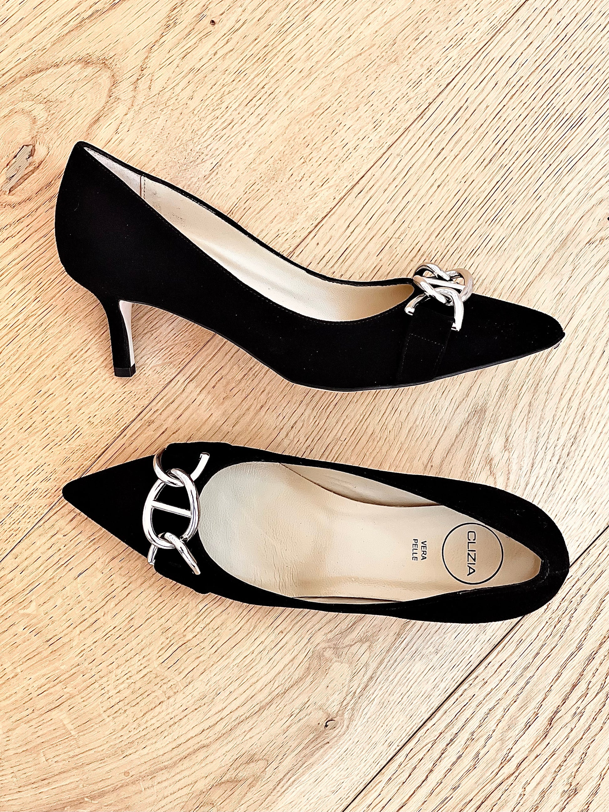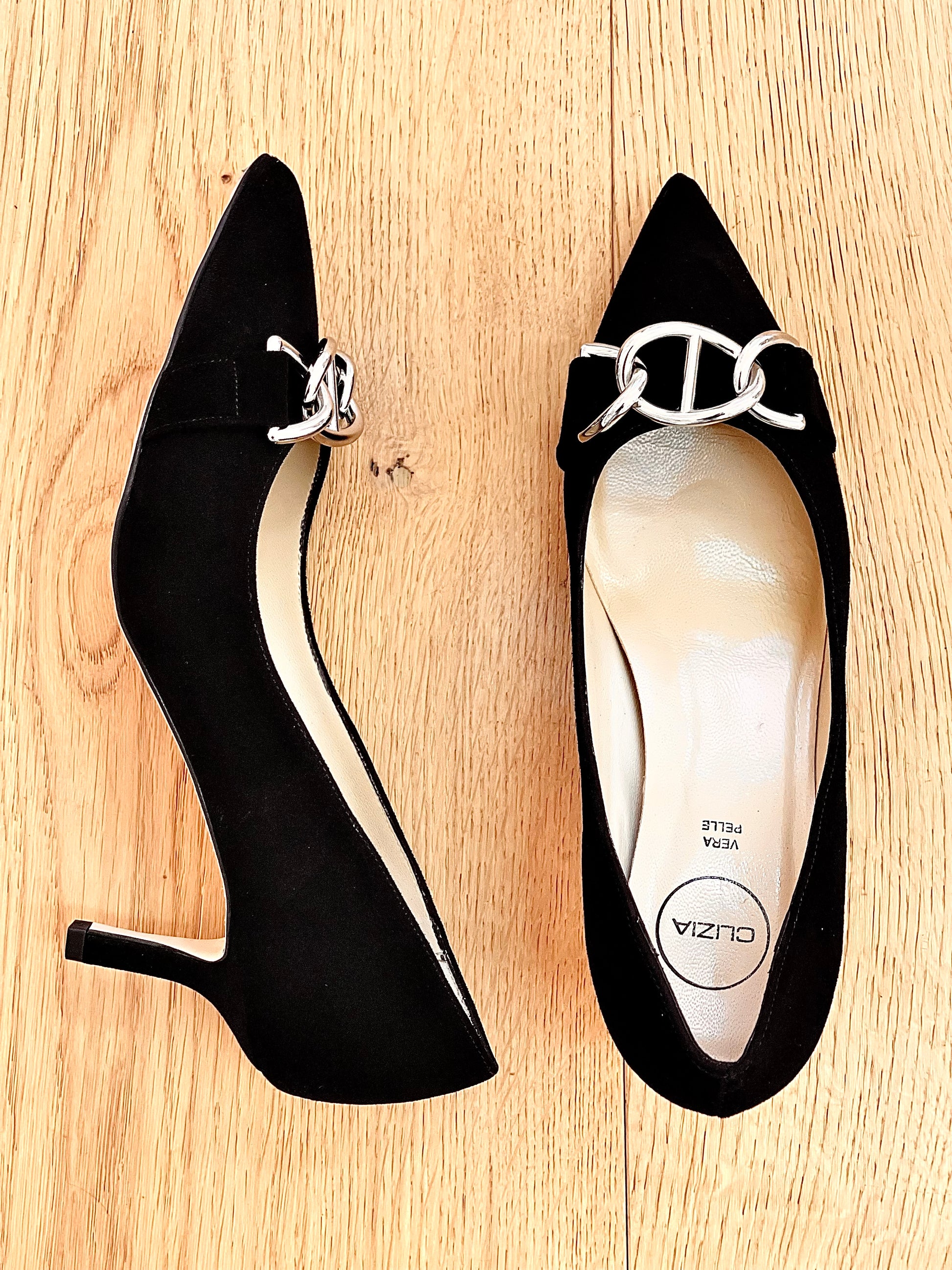 Escarpins pointus en daim avec chaîne sur l'encolure.