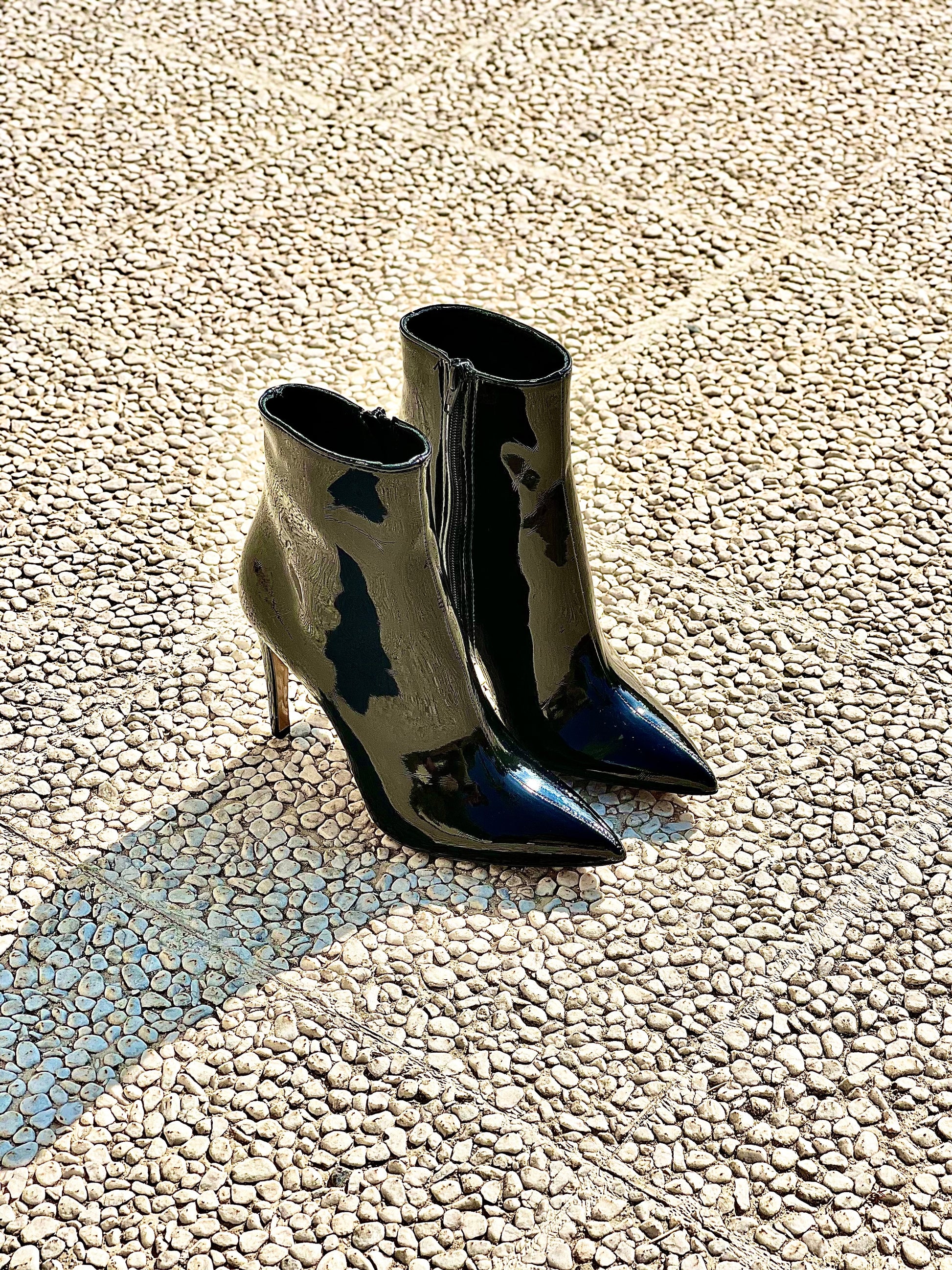 Bottines à bout pointu en cuir verni avec haut talon aiguille.