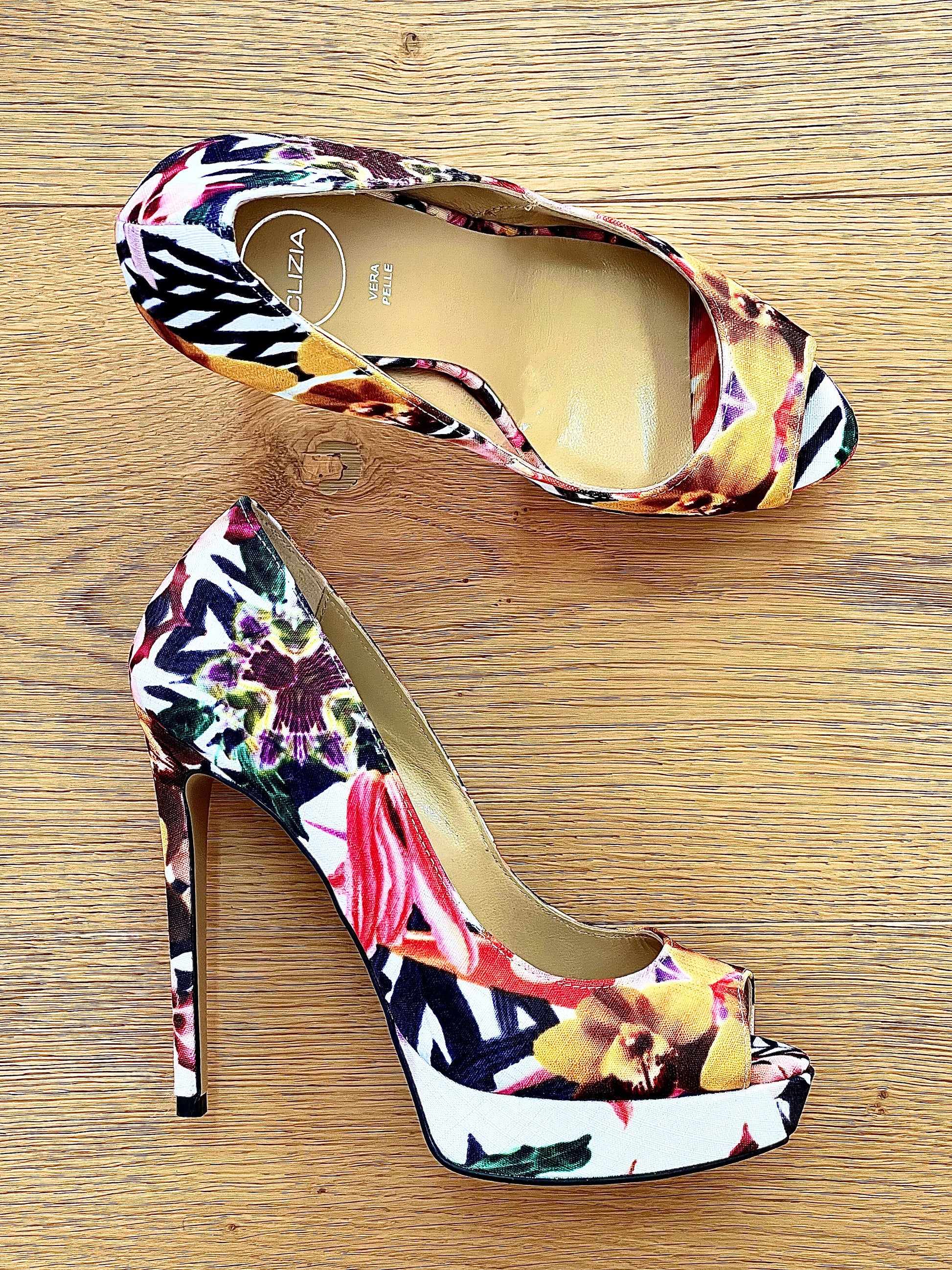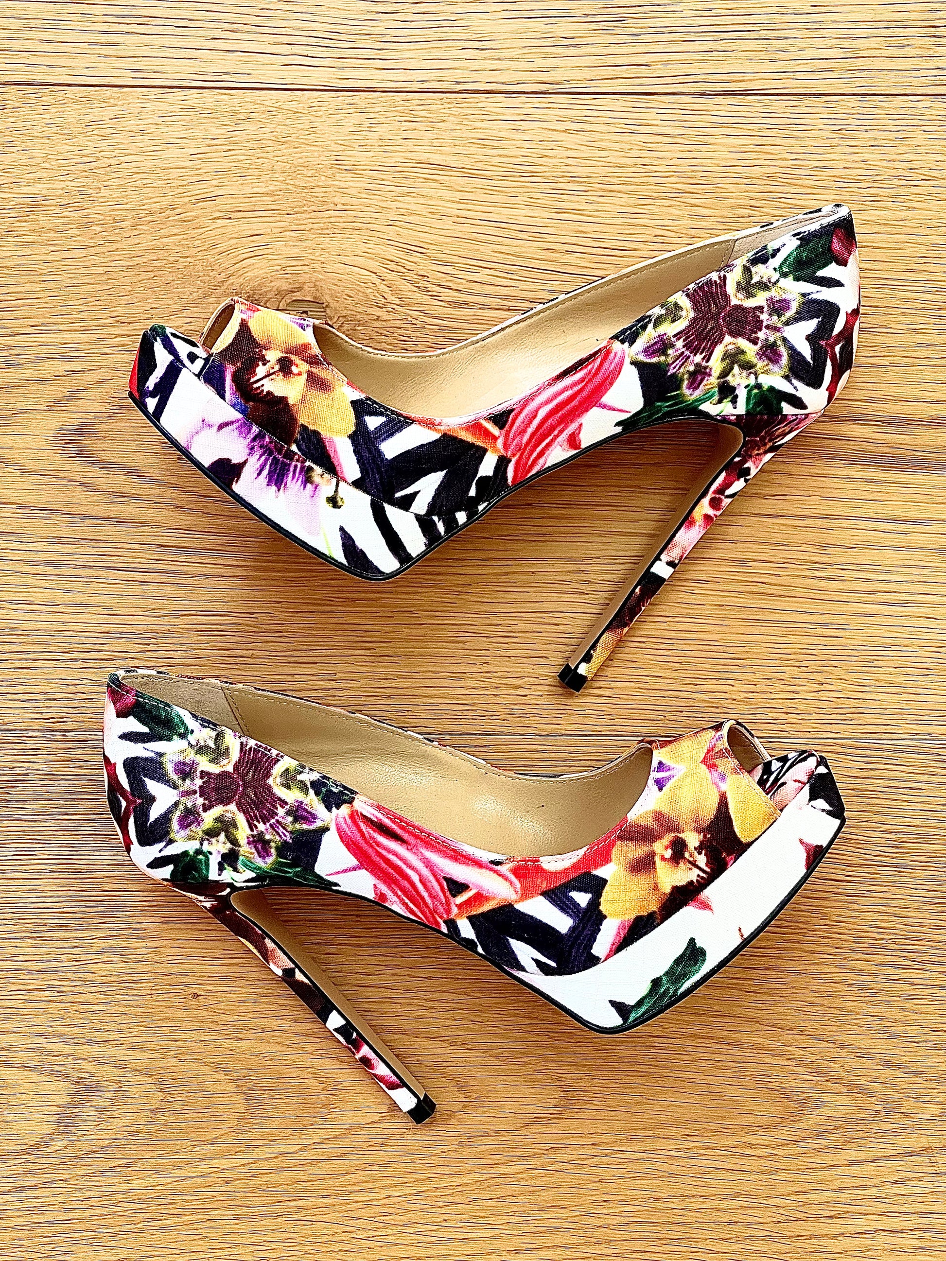 Escarpins à talons hauts et à fleurs.