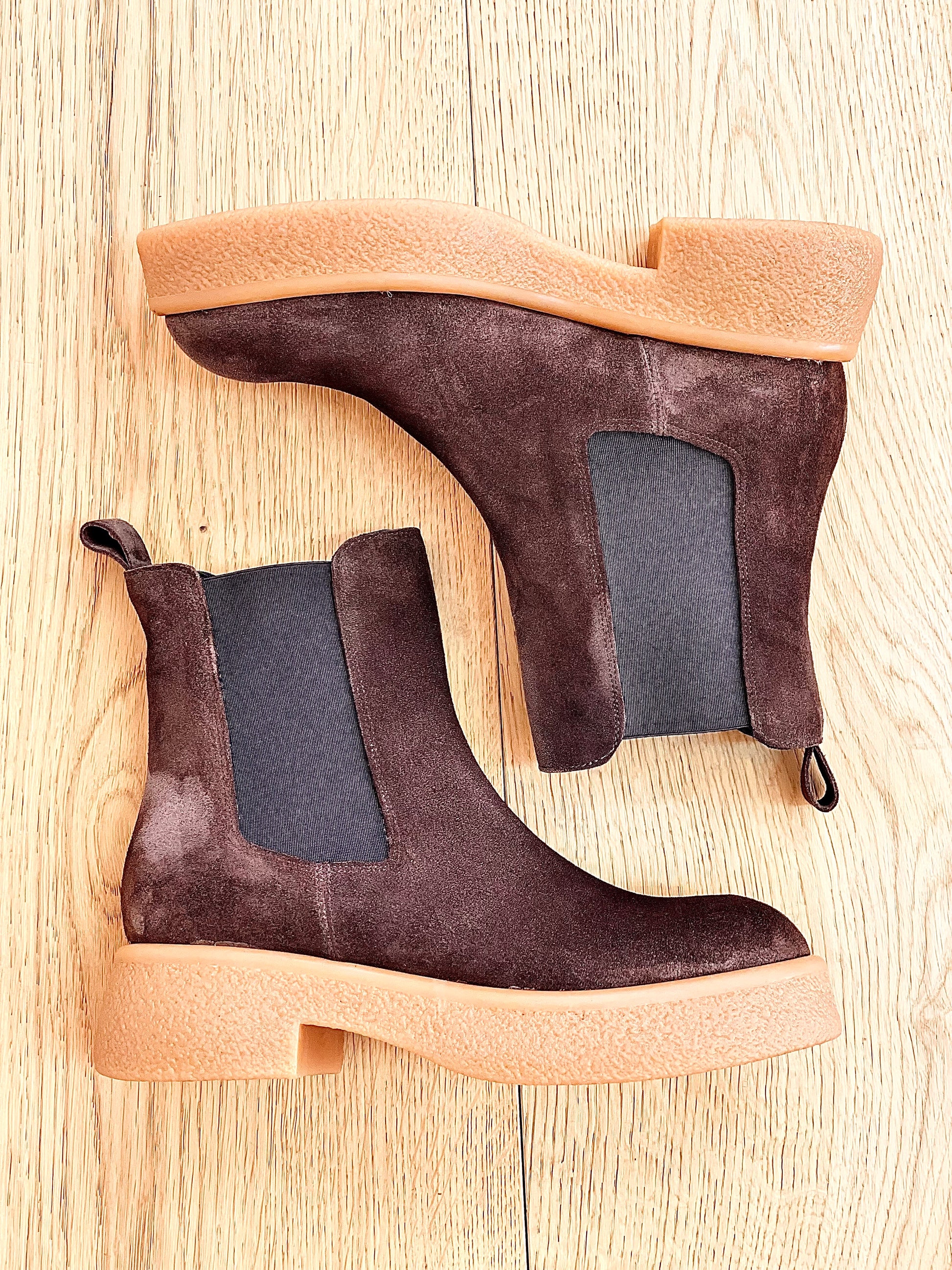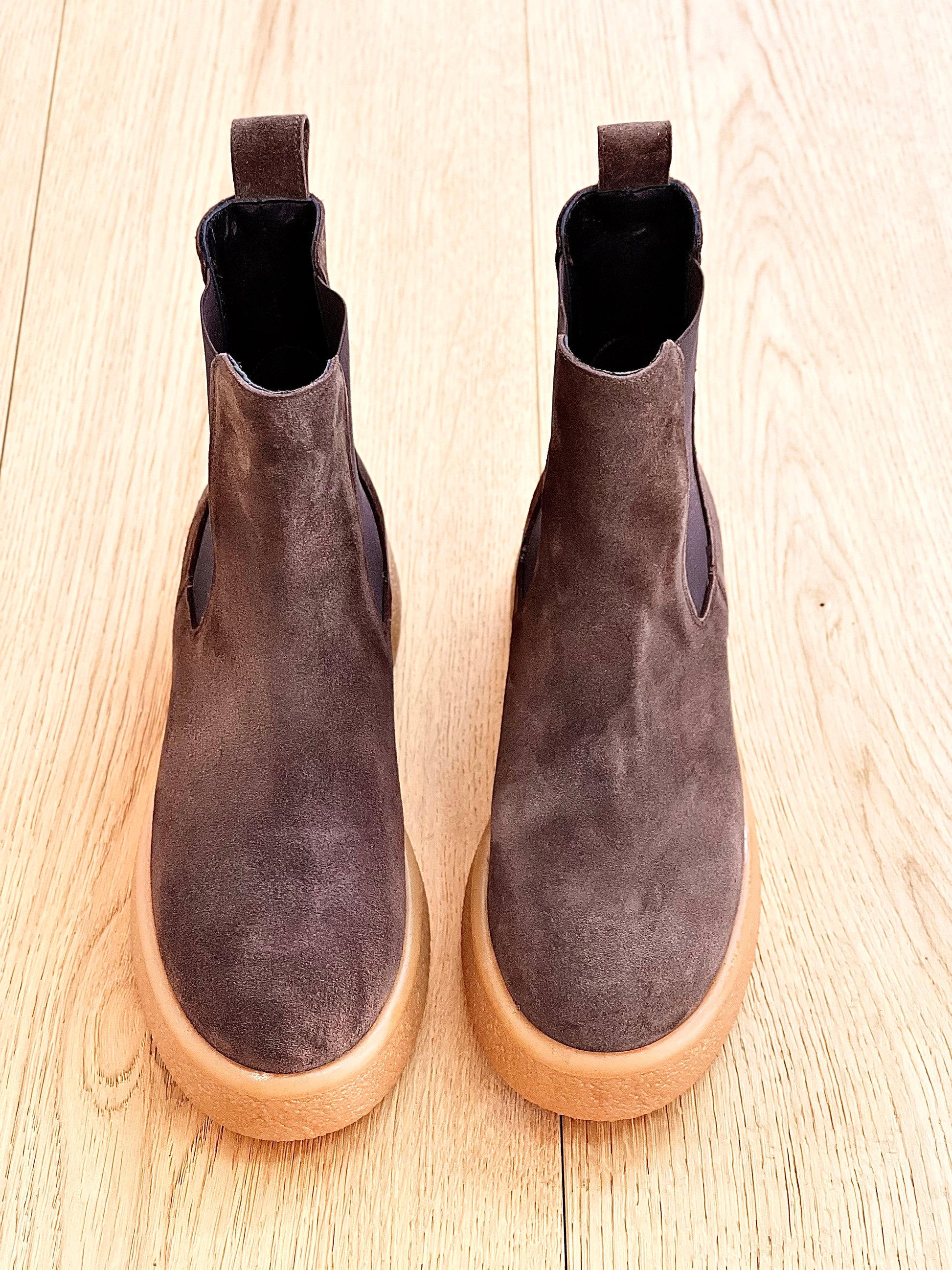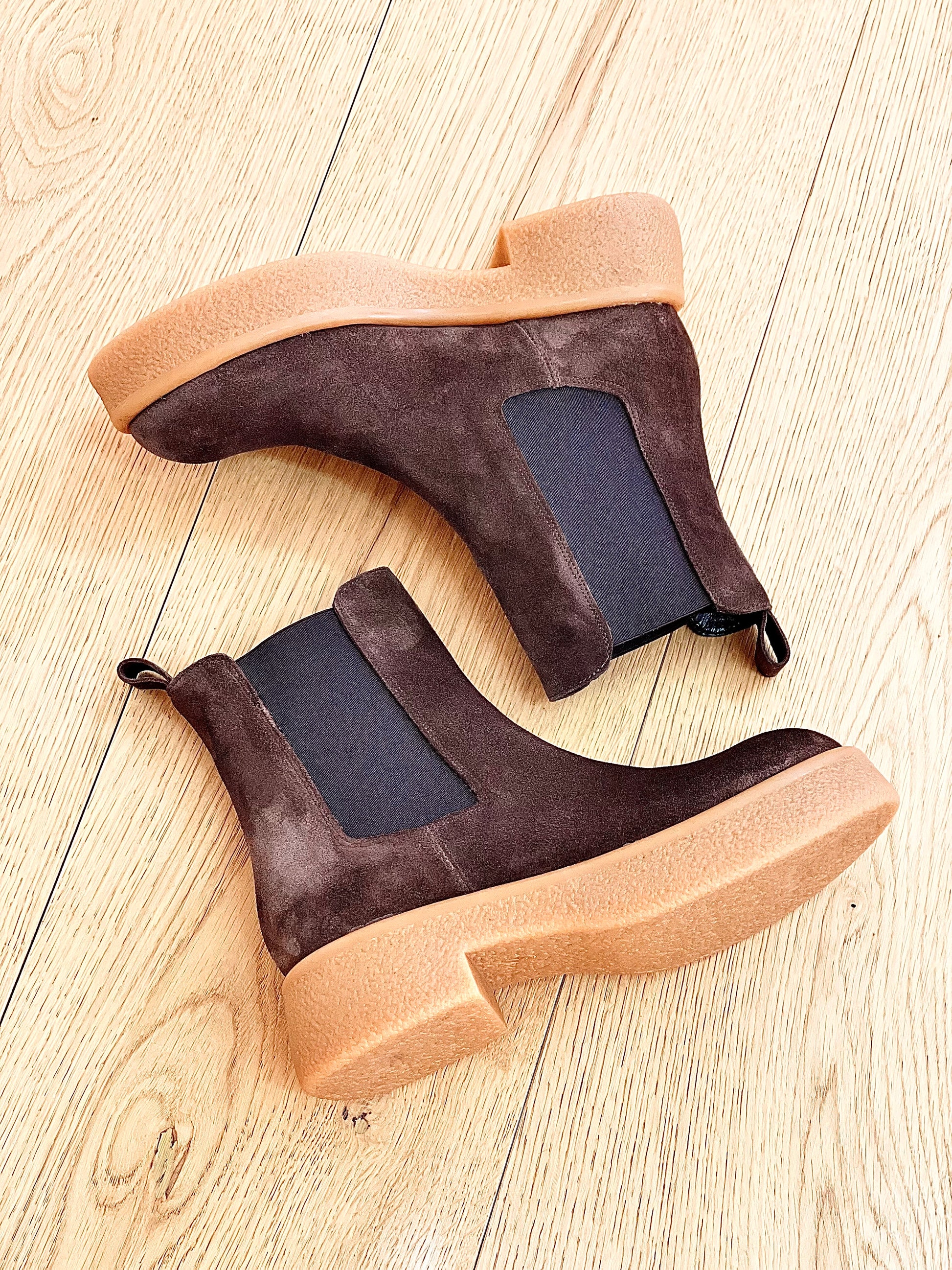 Bottines en cuir velours à fond crêpé de couleur claire.