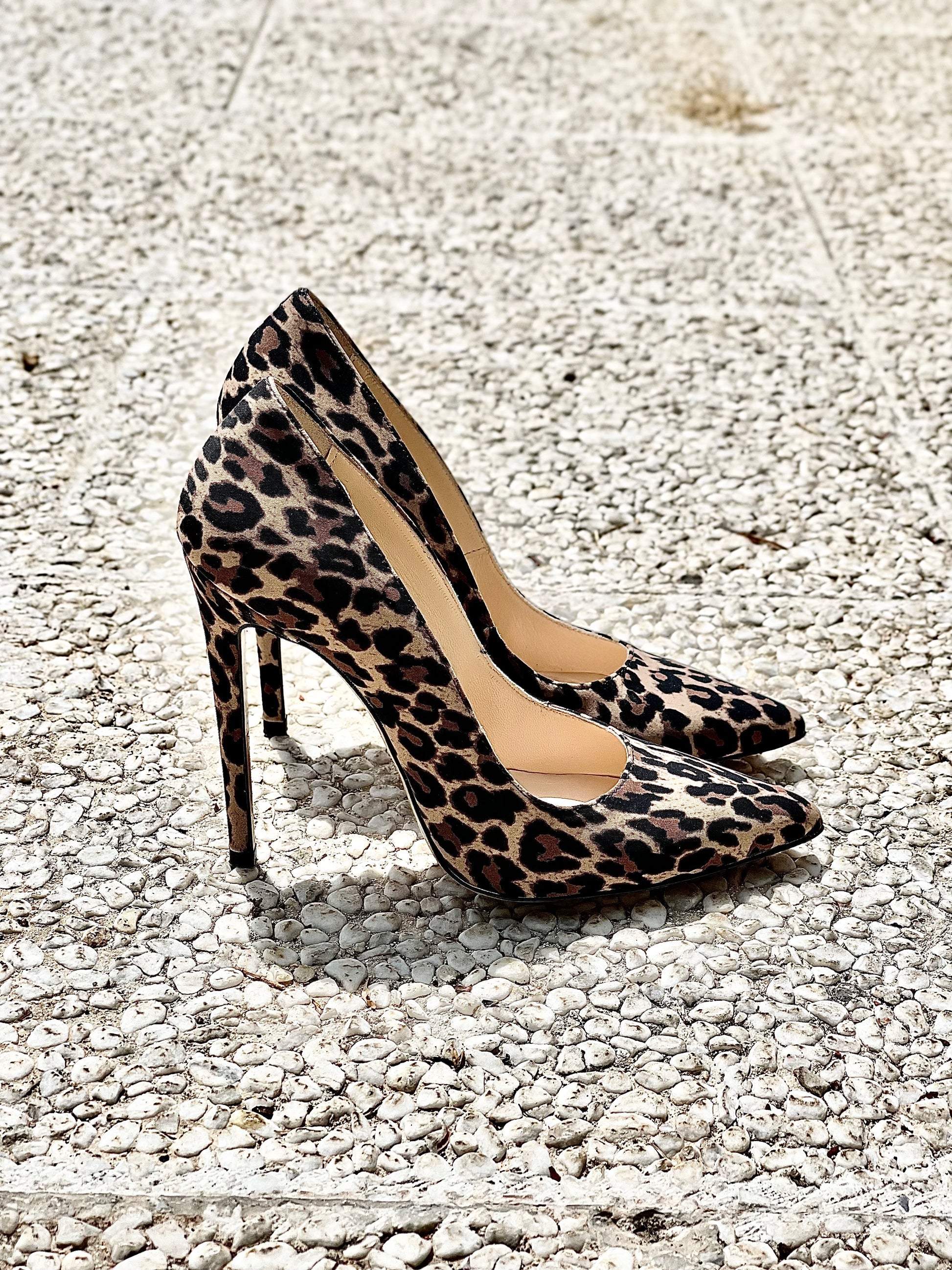 Escarpin à bout pointu en tissu léopard avec un talon de 10 cm.