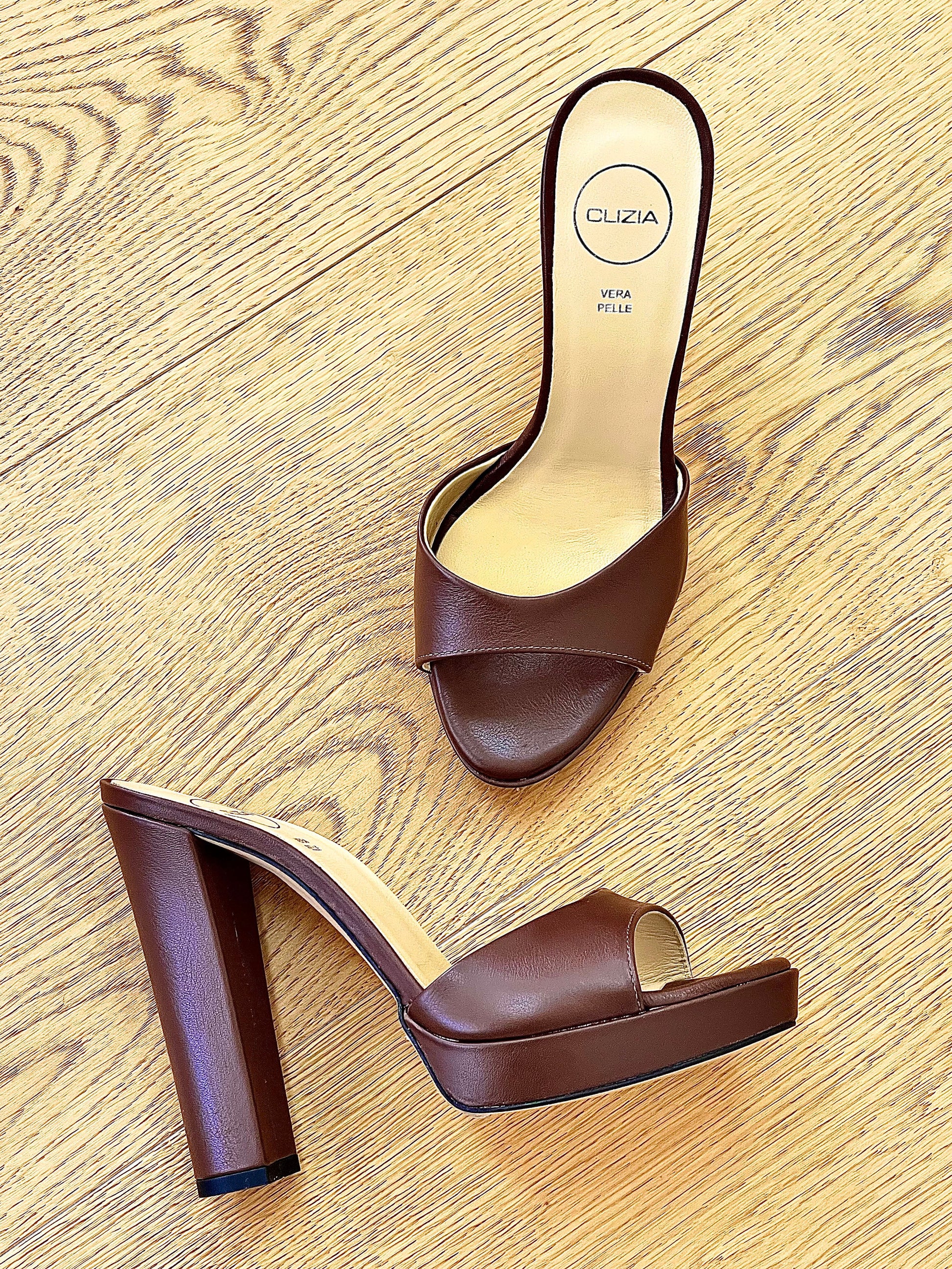 Sandales mules hautes en cuir avec plateforme et talon large.