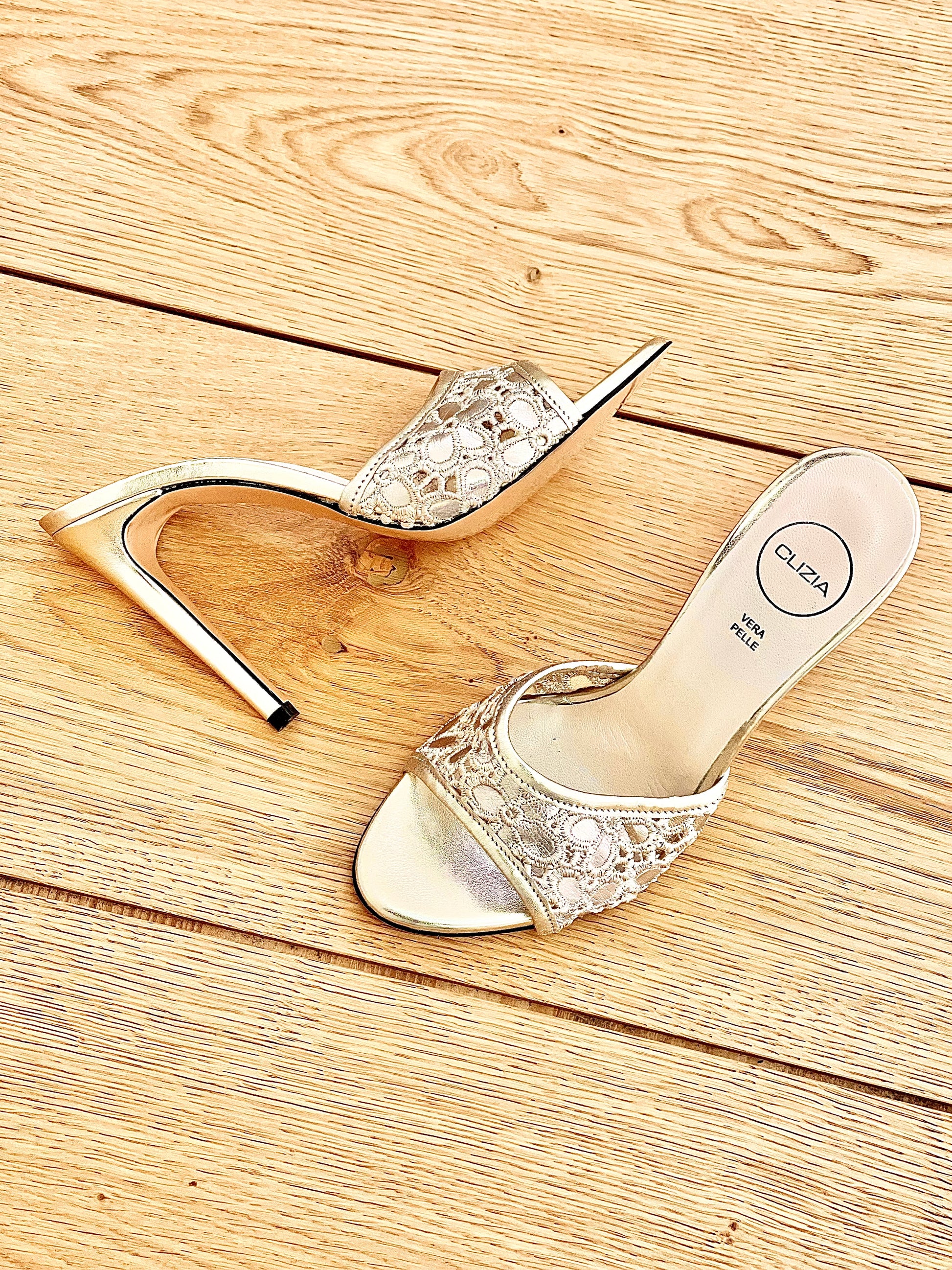 Sandales hautes mules en macramé perforé et lamianto avec talon aiguille.