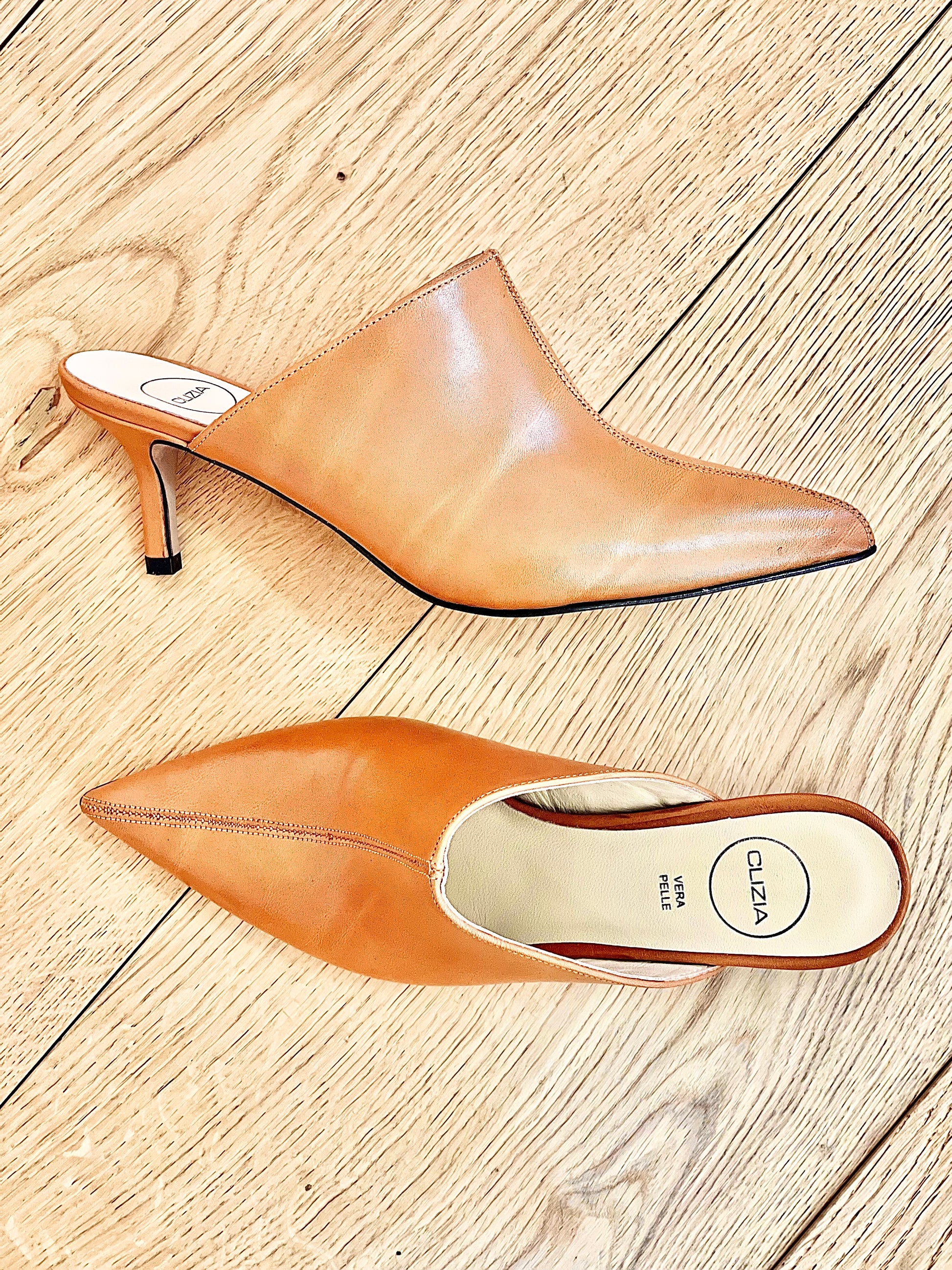 Sabot en cuir à bout pointu avec un talon à pointes de 6 cm.