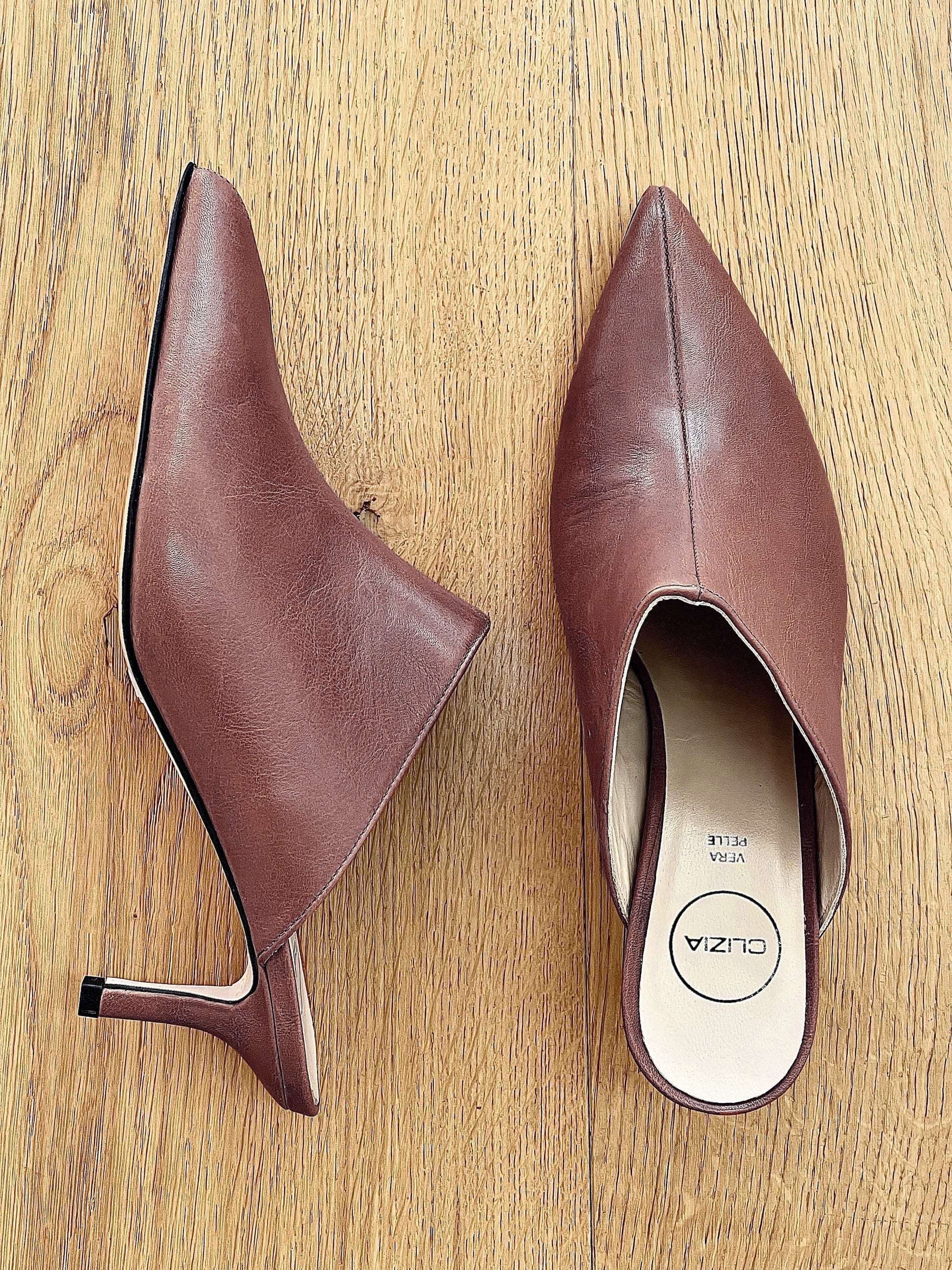 Sabot en cuir à bout pointu avec un talon de 6 cm.