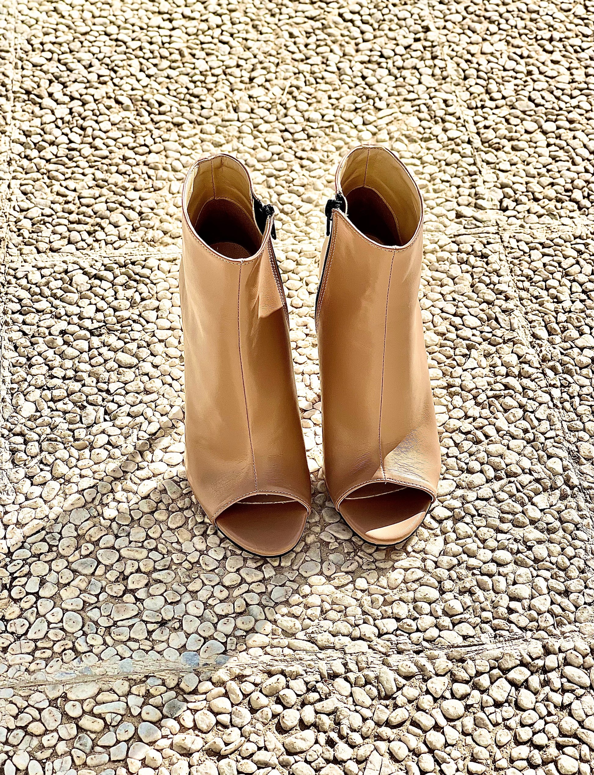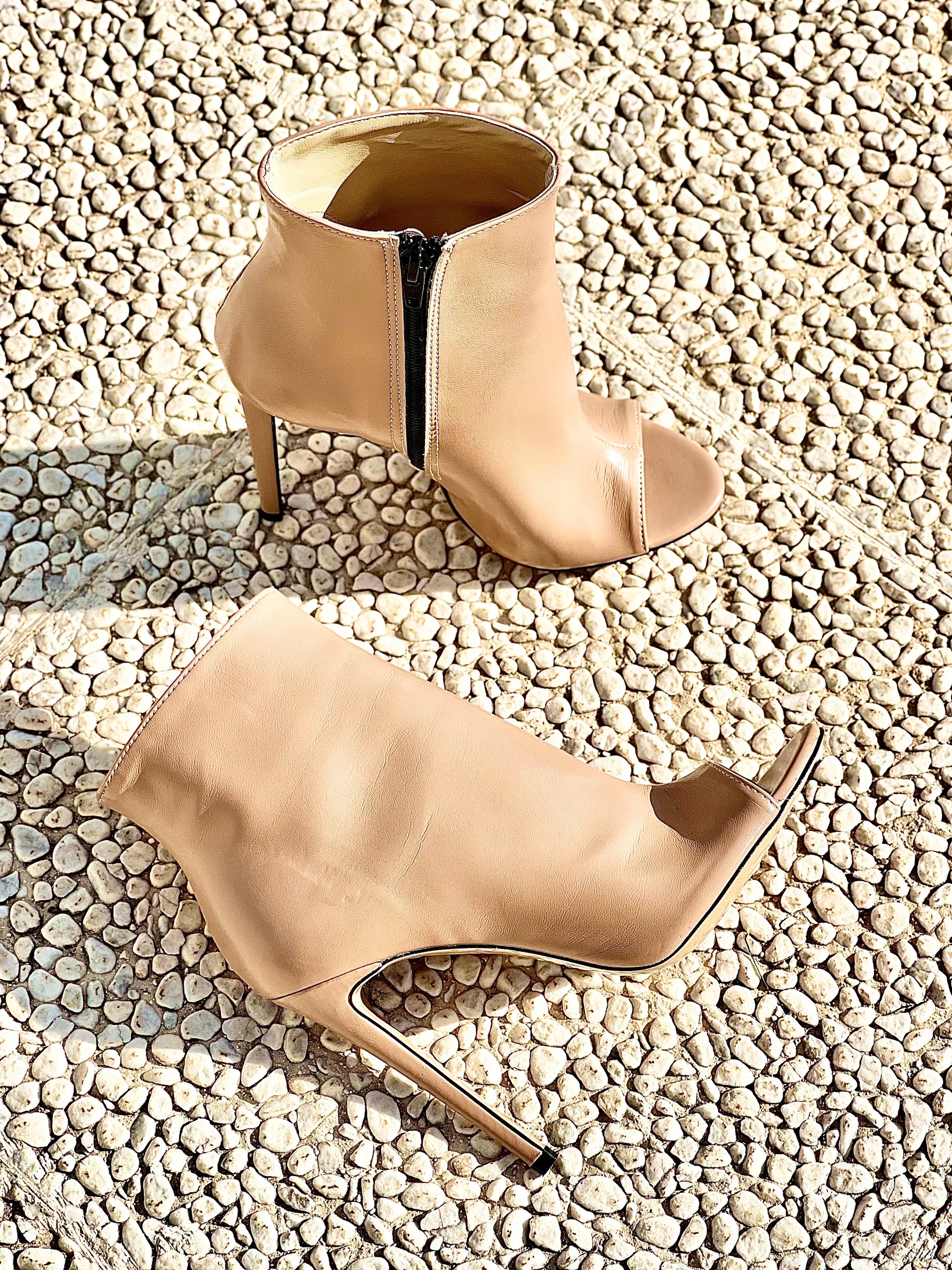 Bottine à talon de 12 cm à bout ouvert avec fermeture éclair intérieure.