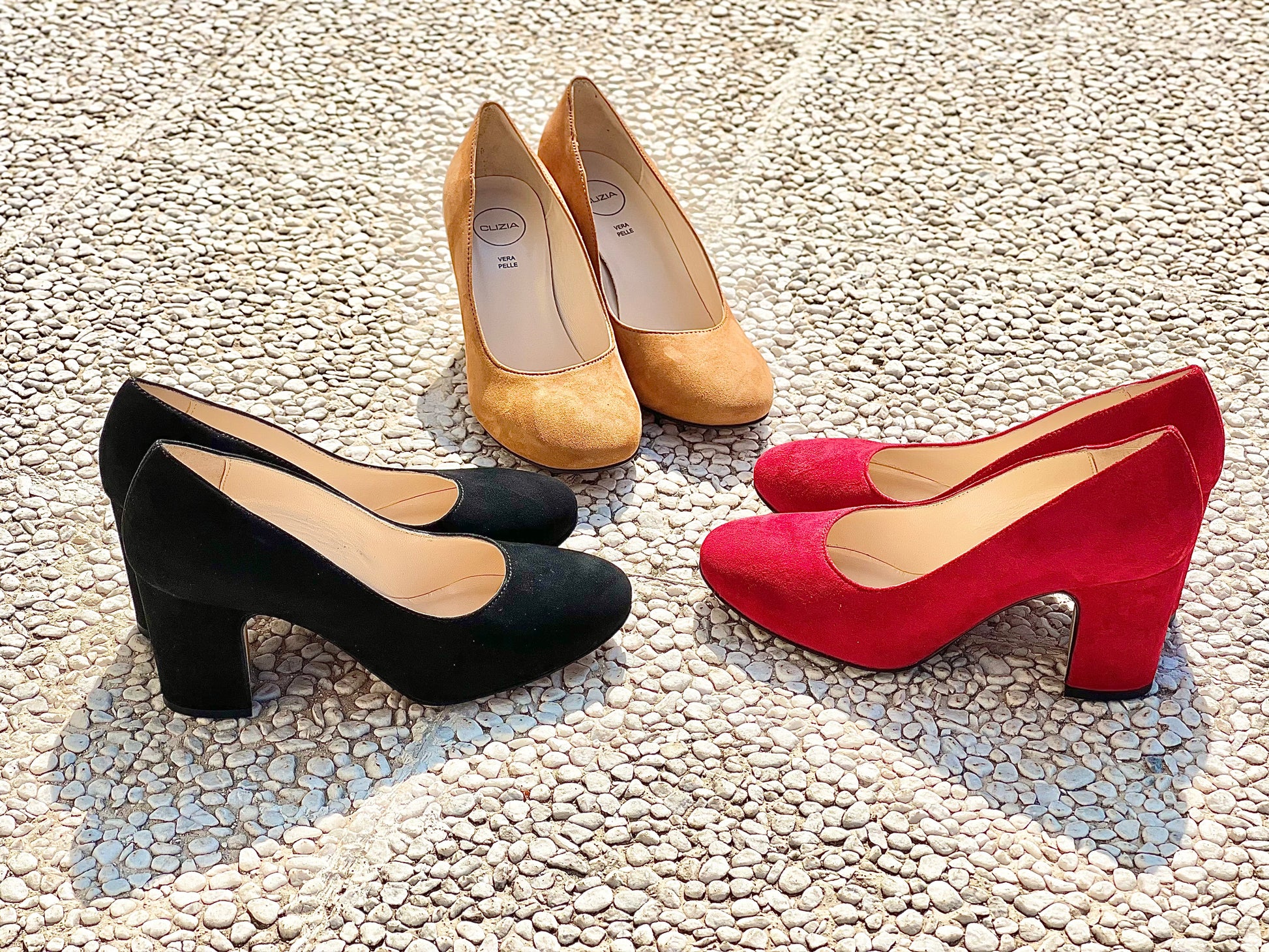 Escarpin en daim à bout rond avec un talon large de 75 mm.