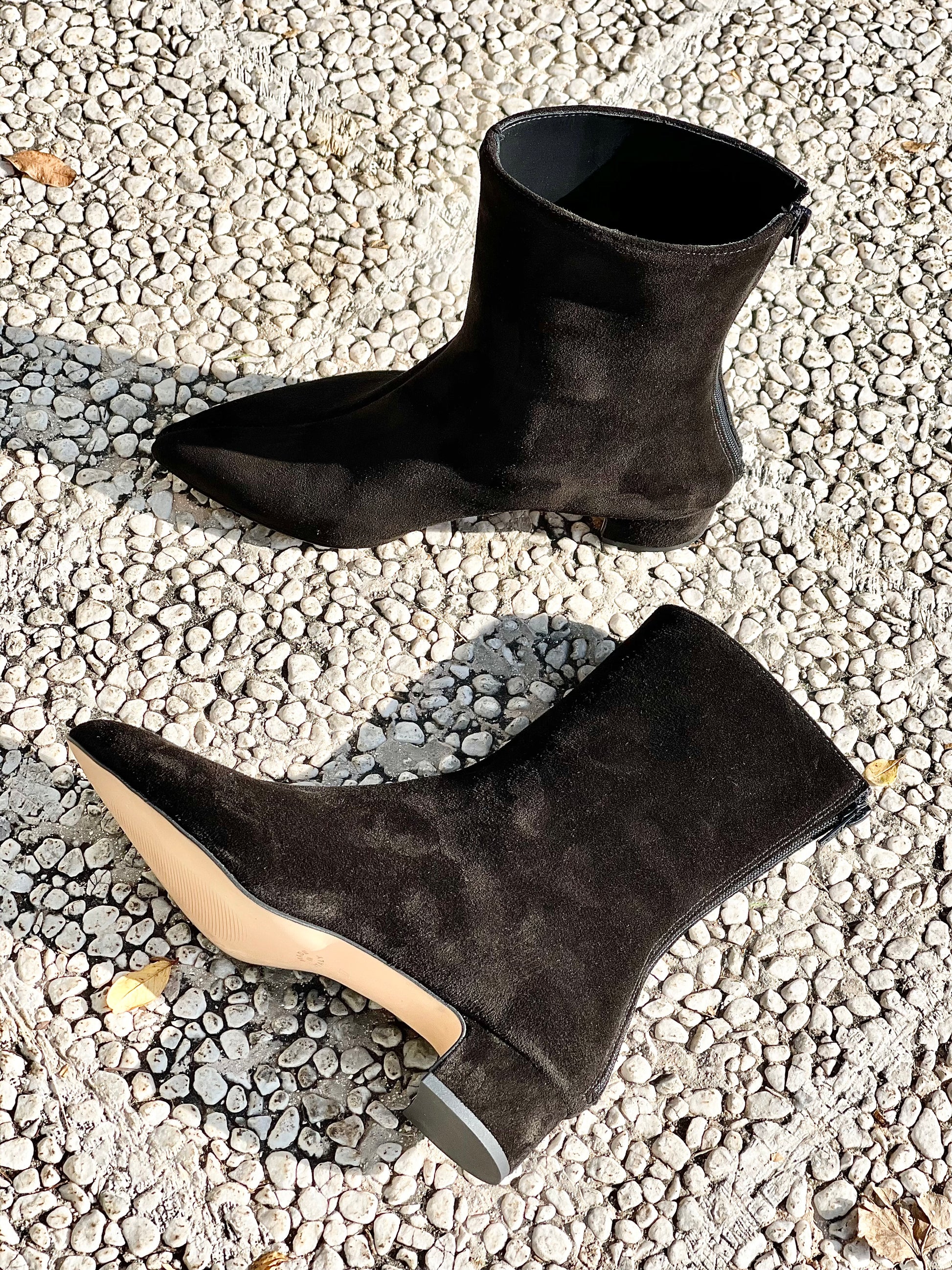 Bottines en daim avec un gros talon et une fermeture éclair à l'arrière.