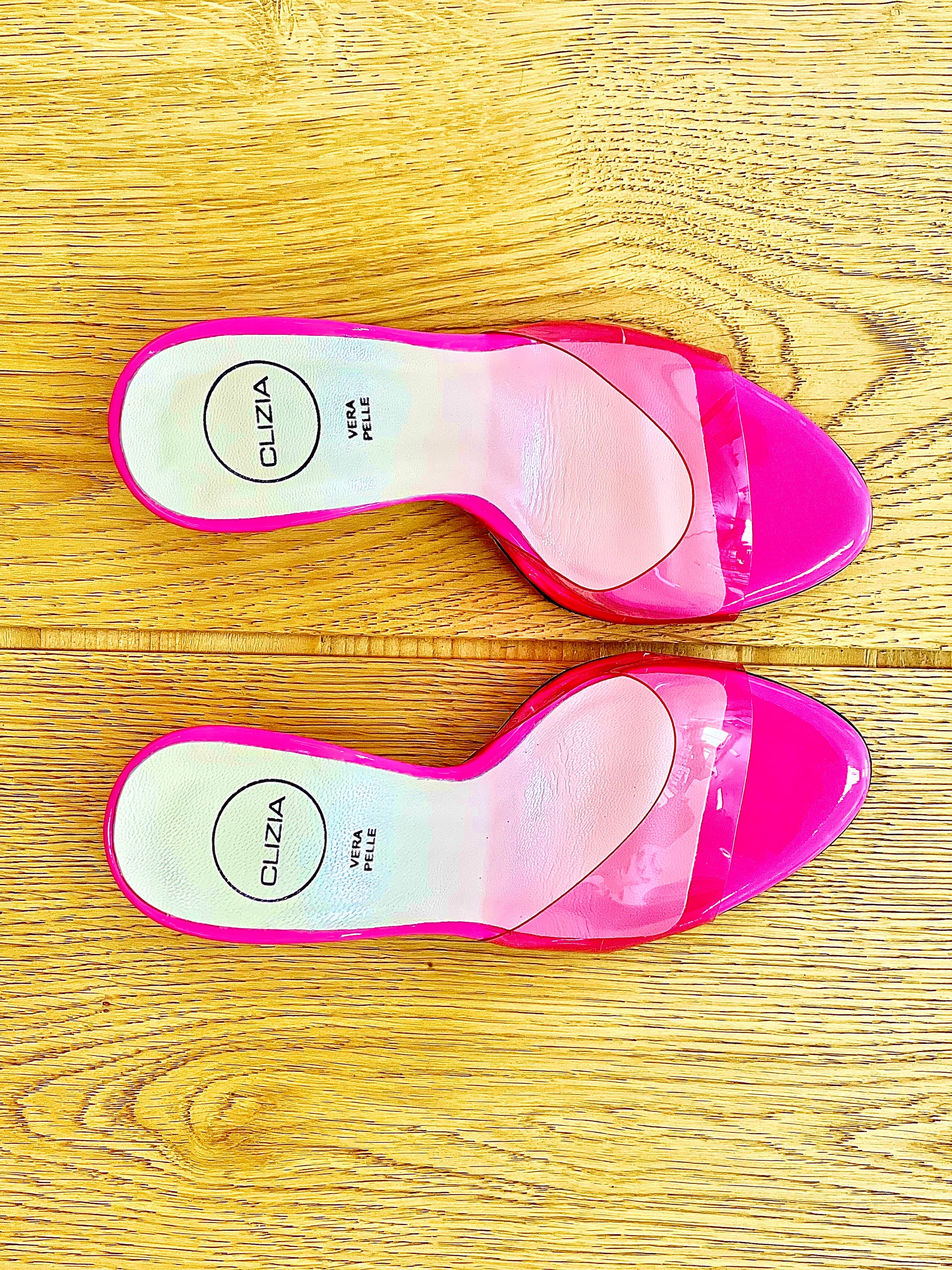 Sandales mules hautes en pvc transparent avec talon aiguille de 10 cm.