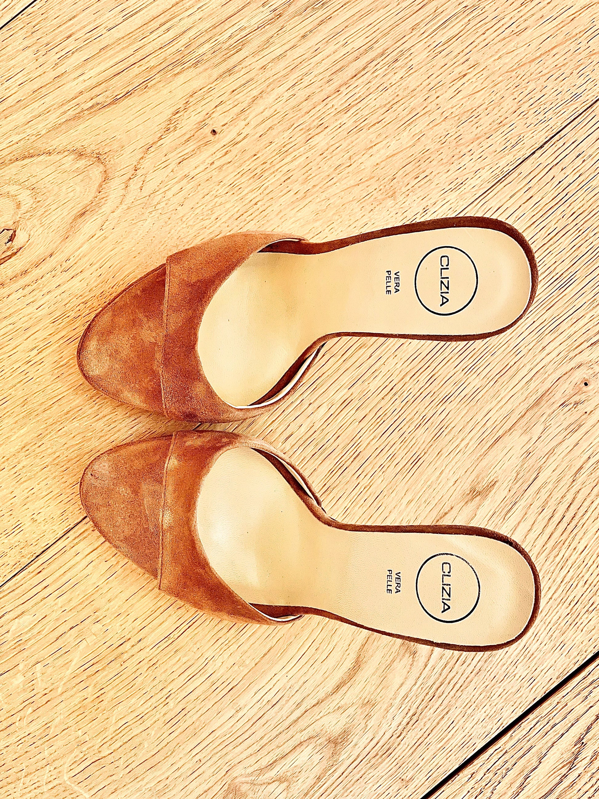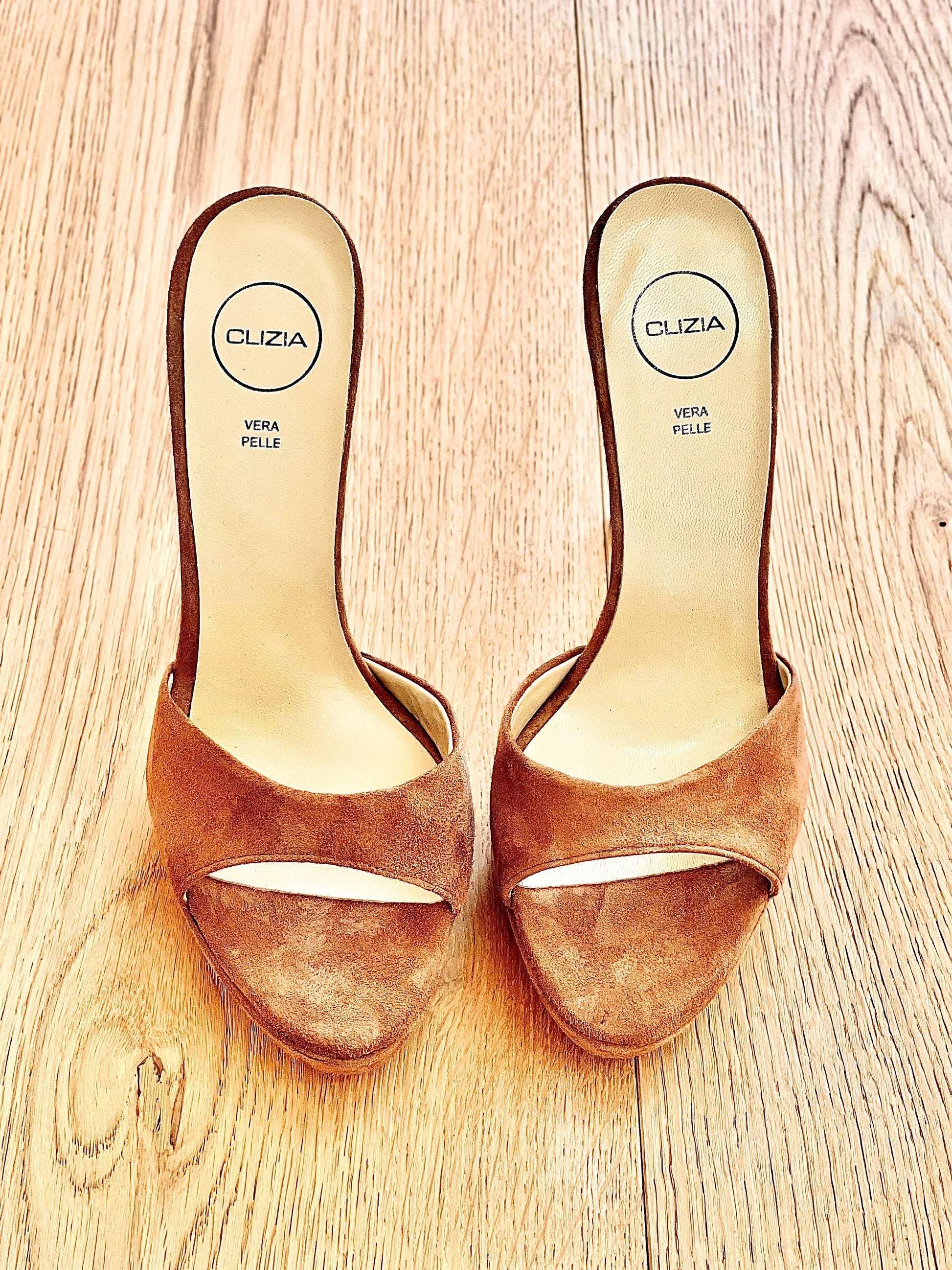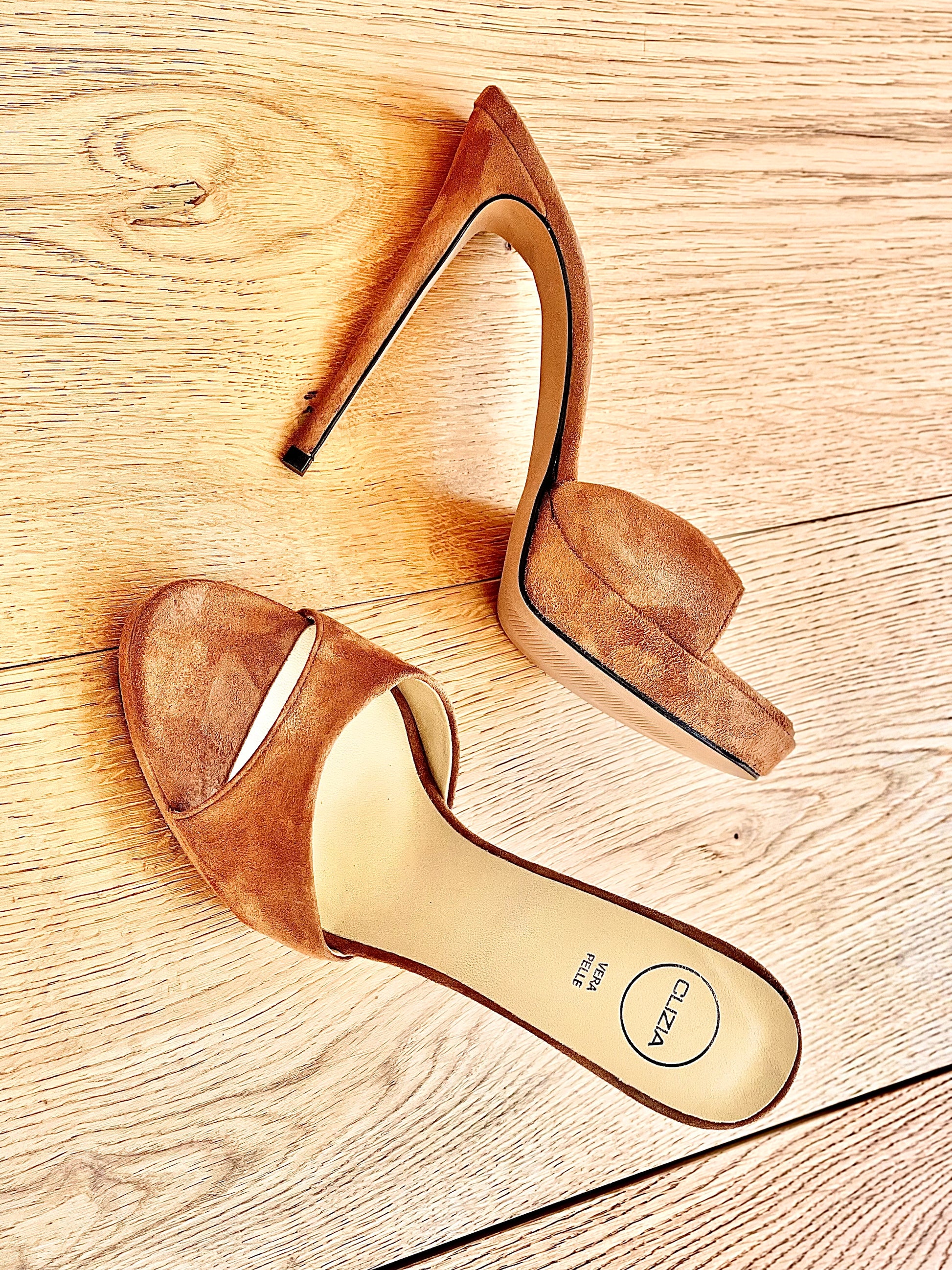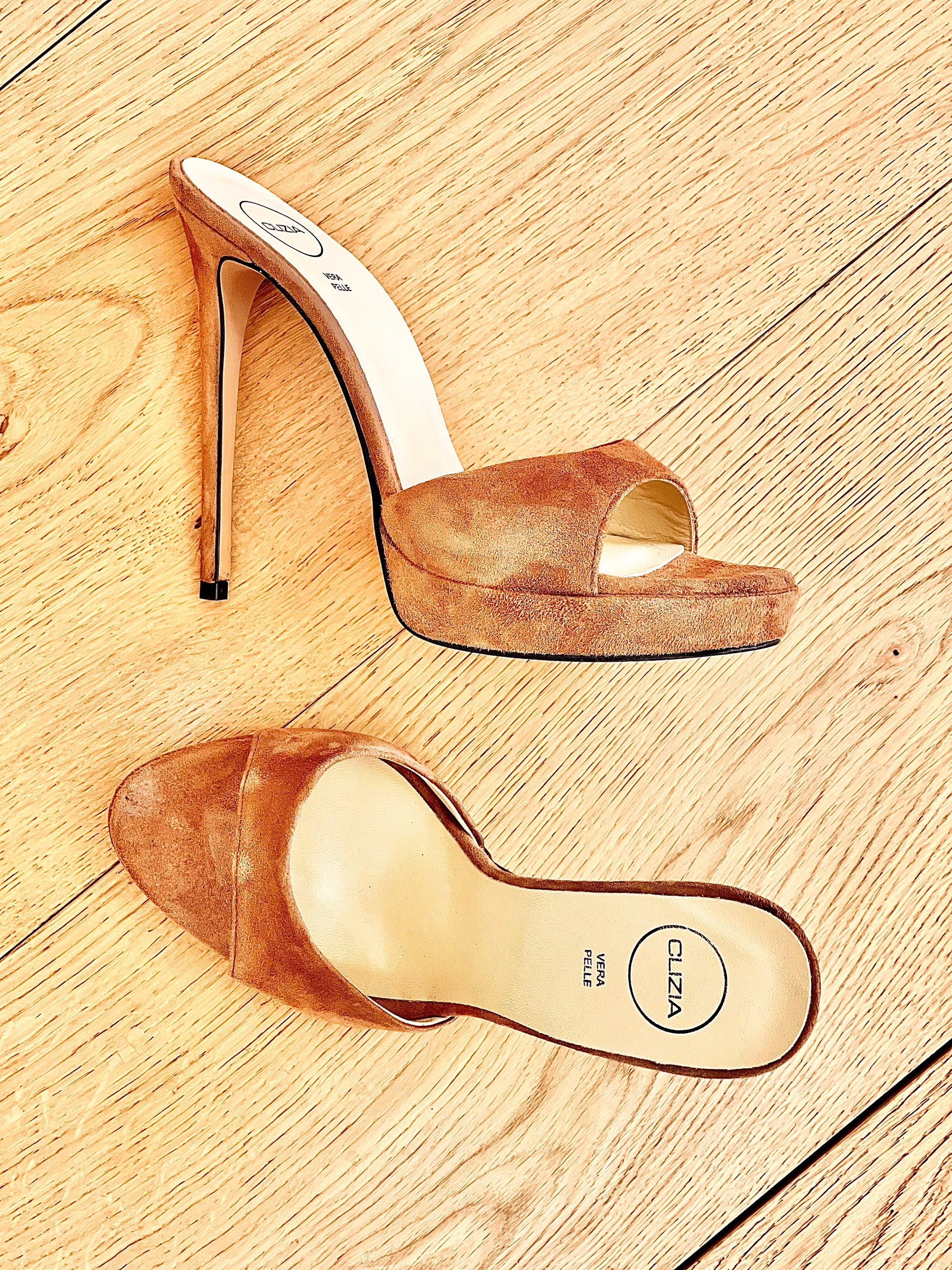 Sandales hautes en mules de daim avec plateforme et talon aiguille.