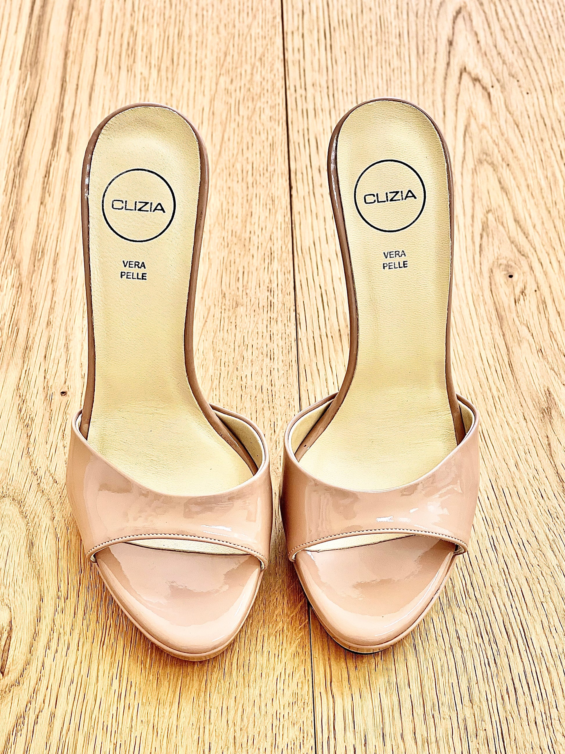 Sandales hautes en cuir verni avec plateforme et talon aiguille.