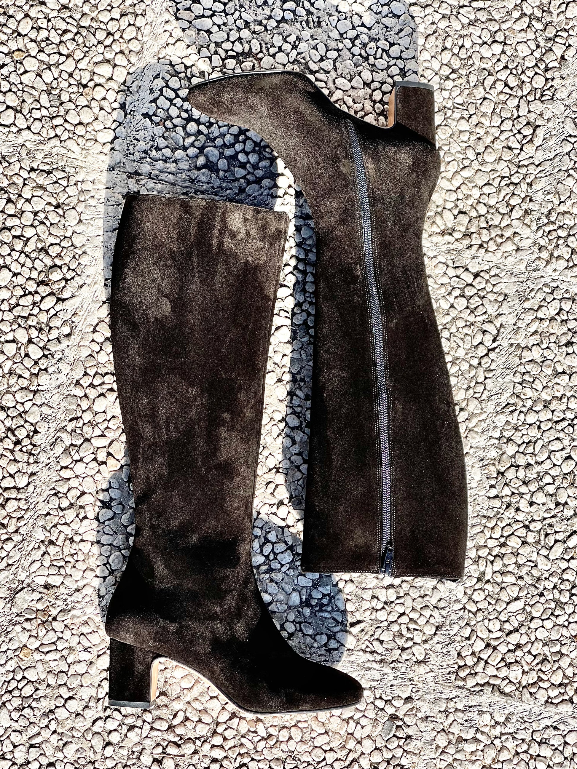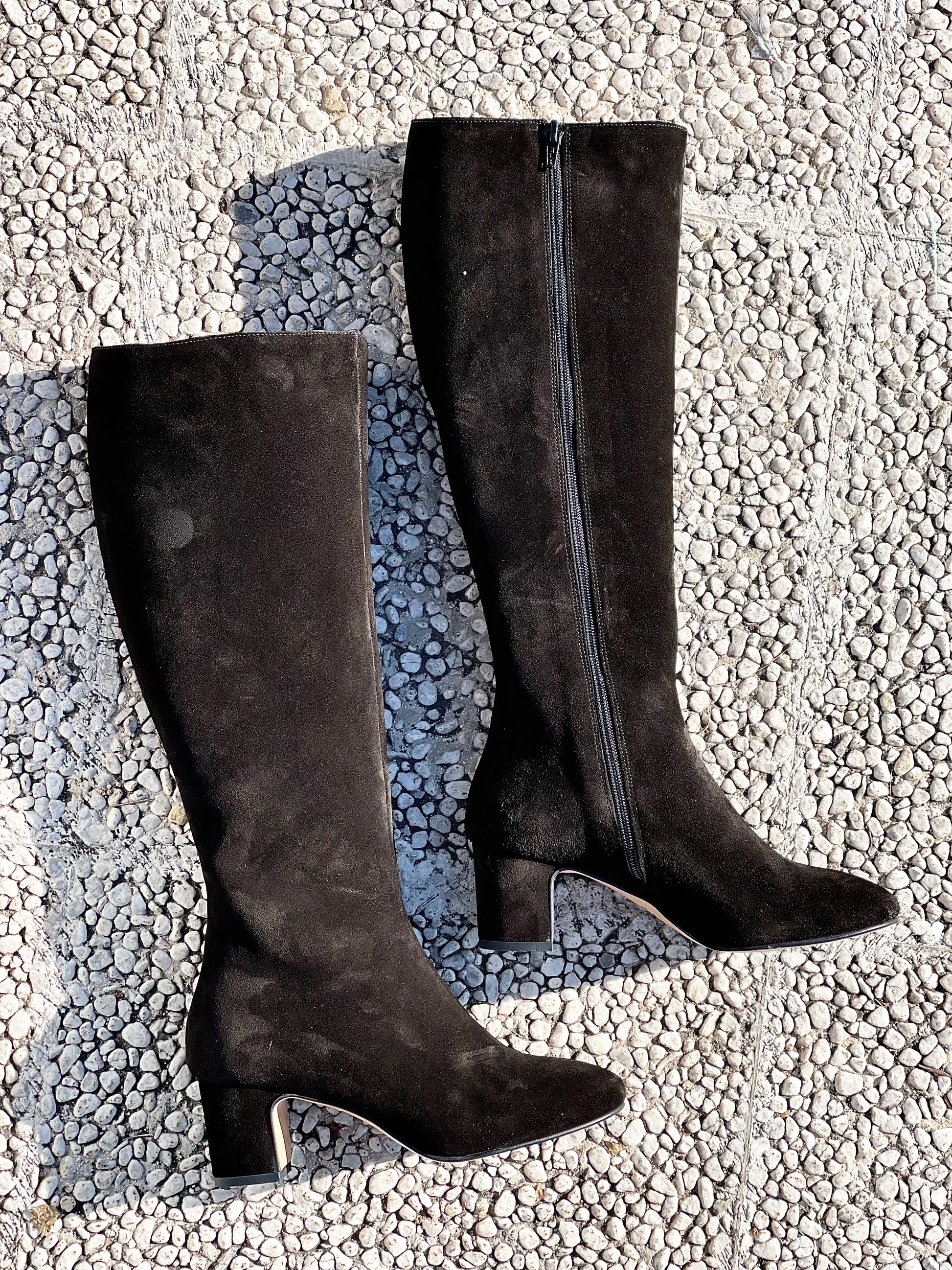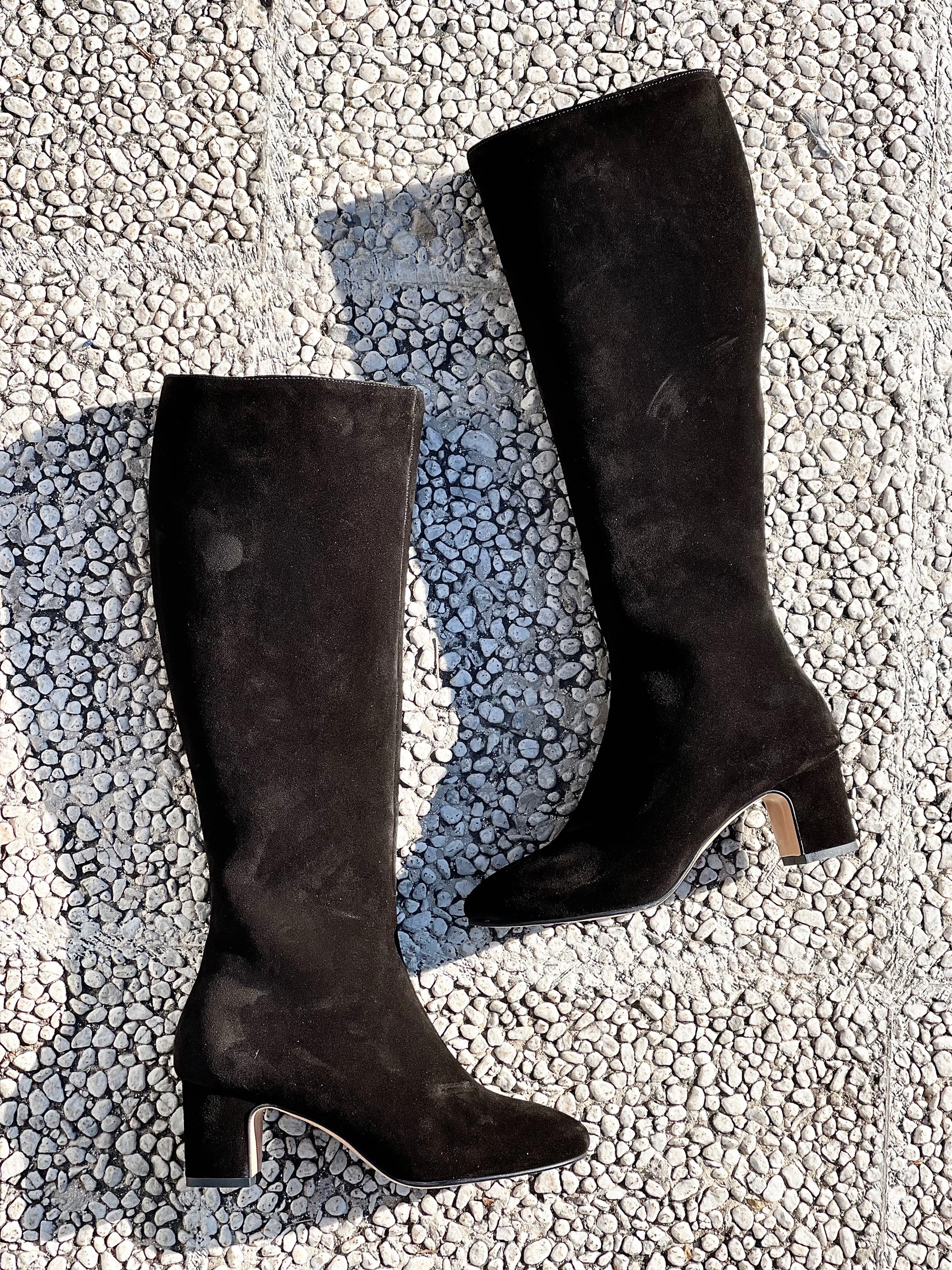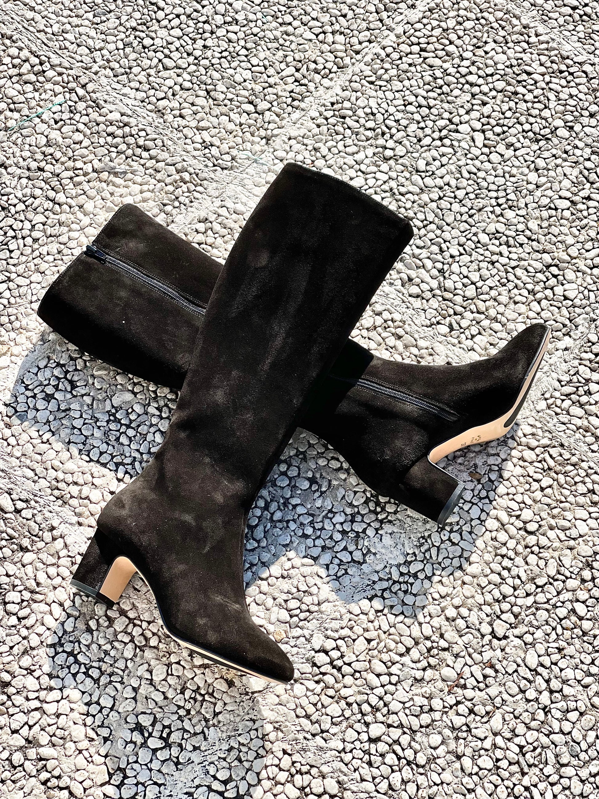 Bottes en daim à bout rond avec un talon large de 5 cm.