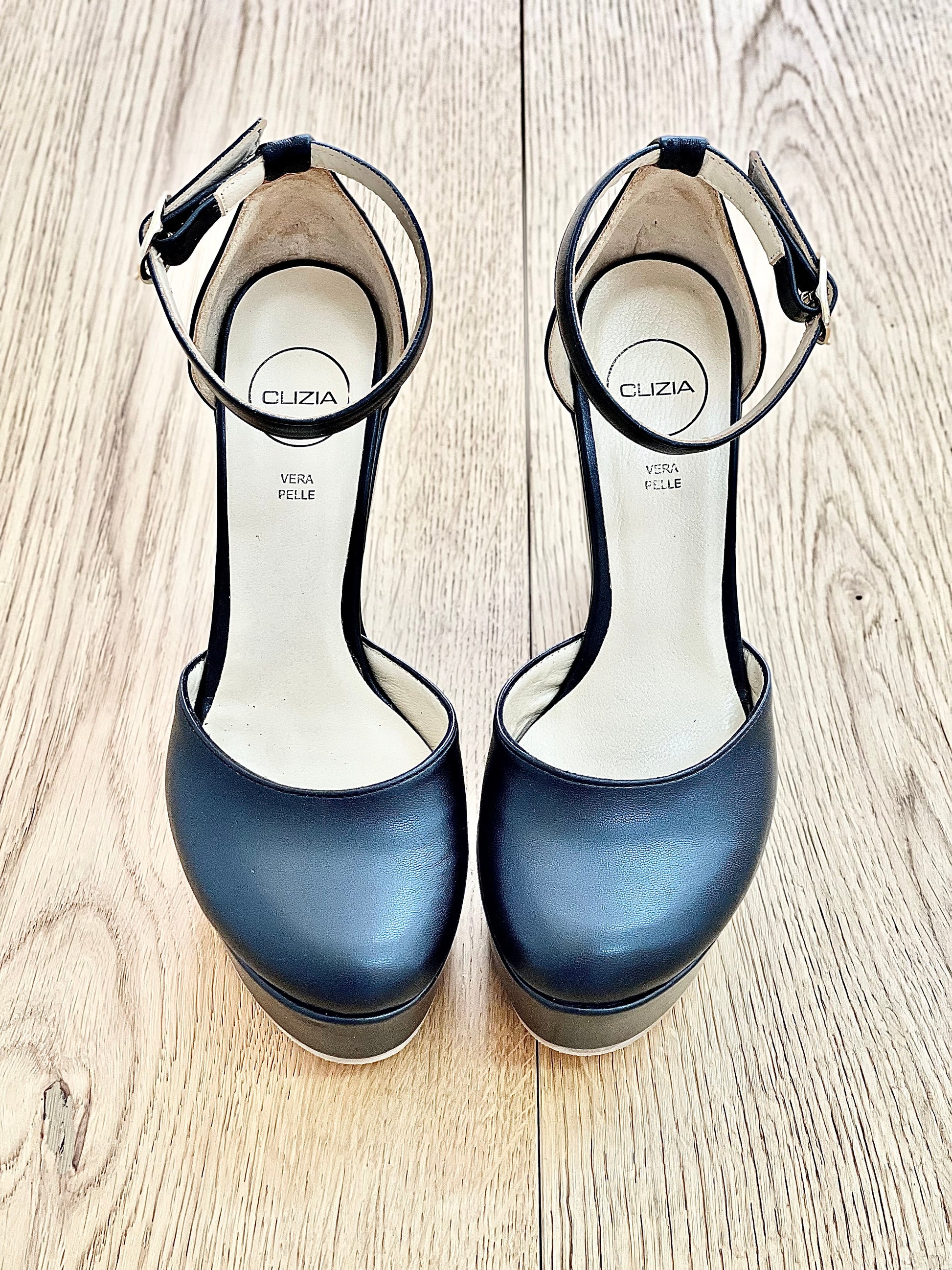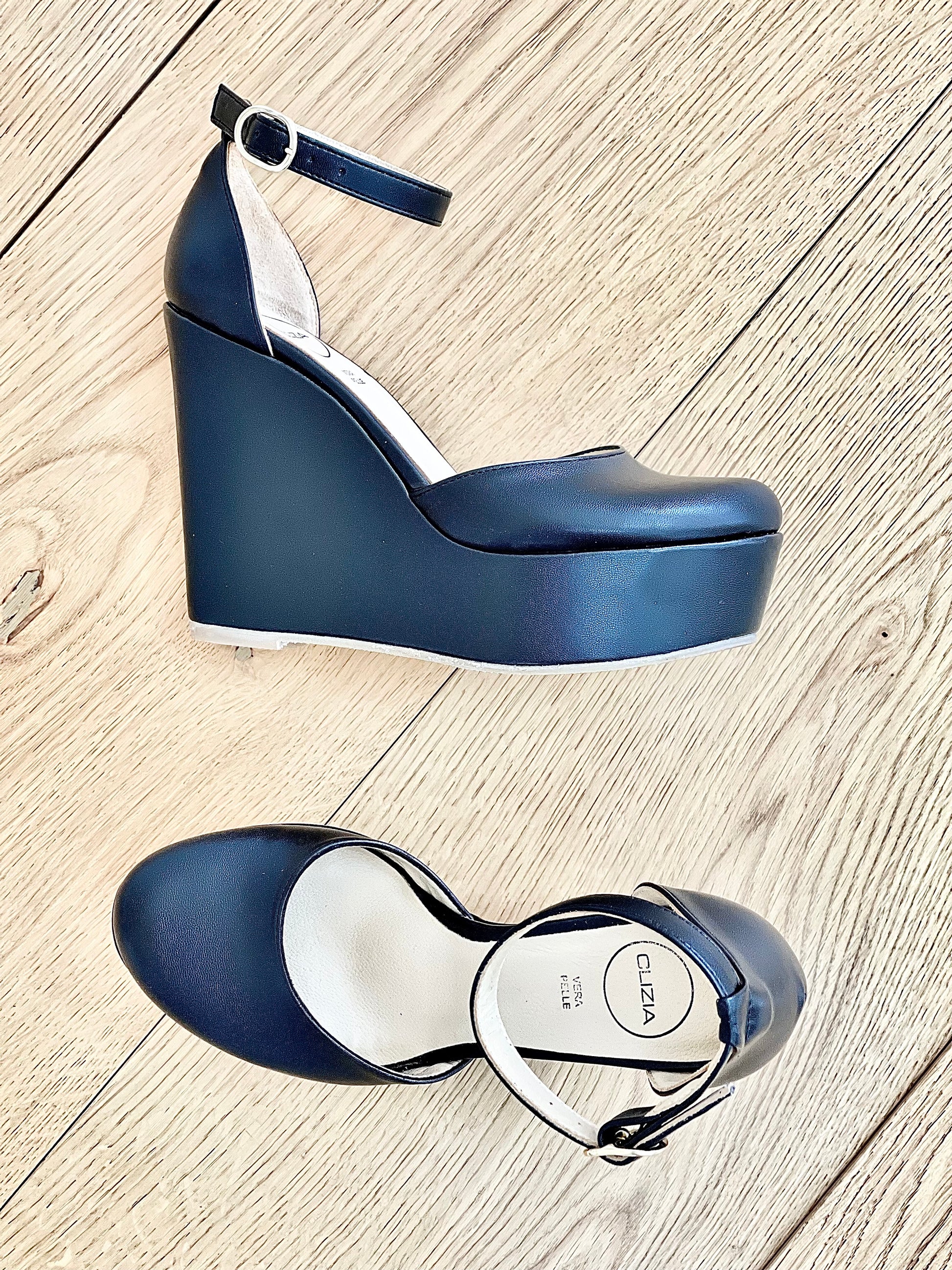 Escarpin à bout pointu et à talon sur une cale de 115 mm.