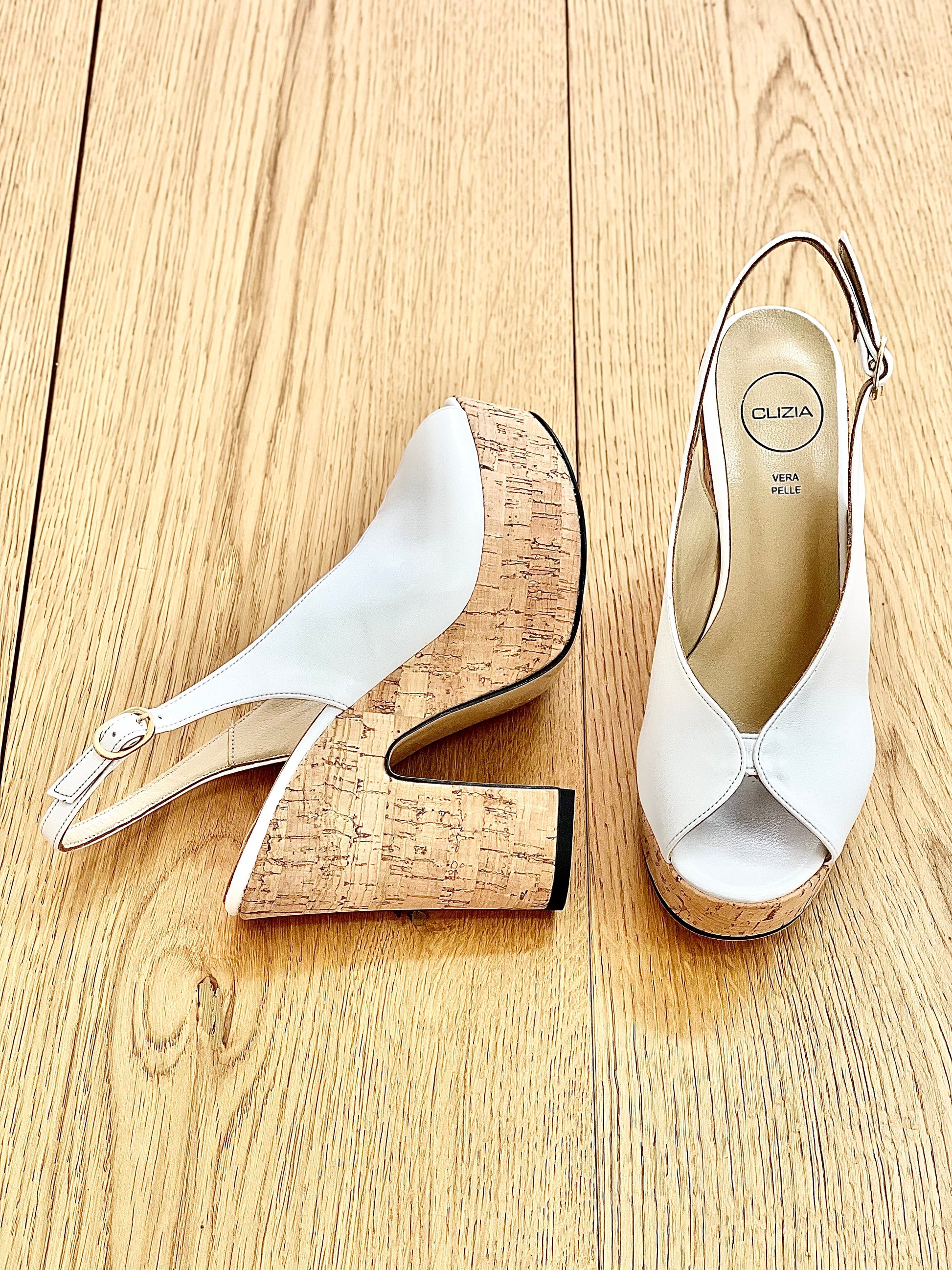 Escarpins à bout ouvert en cuir sur un haut talon en liège.