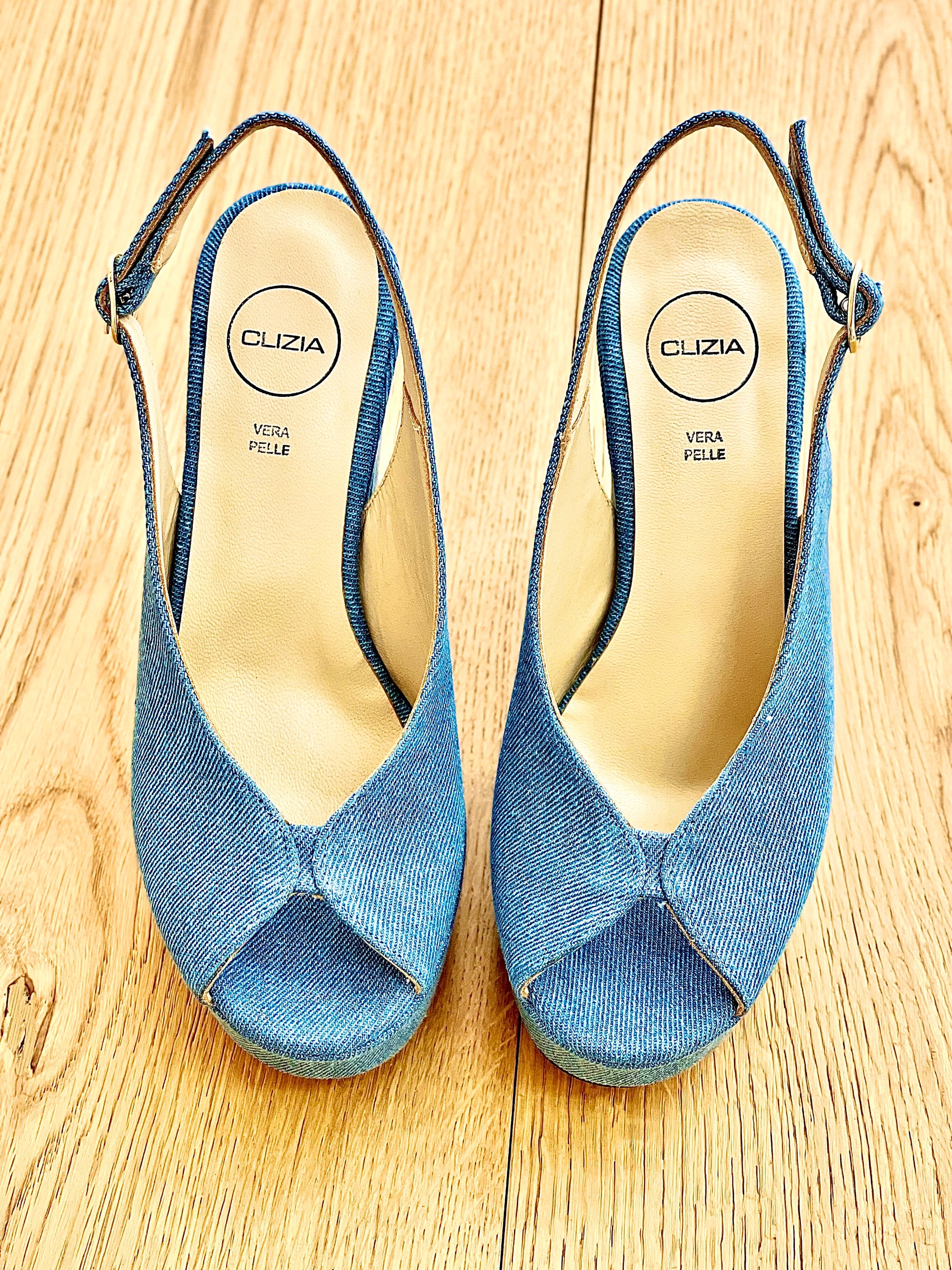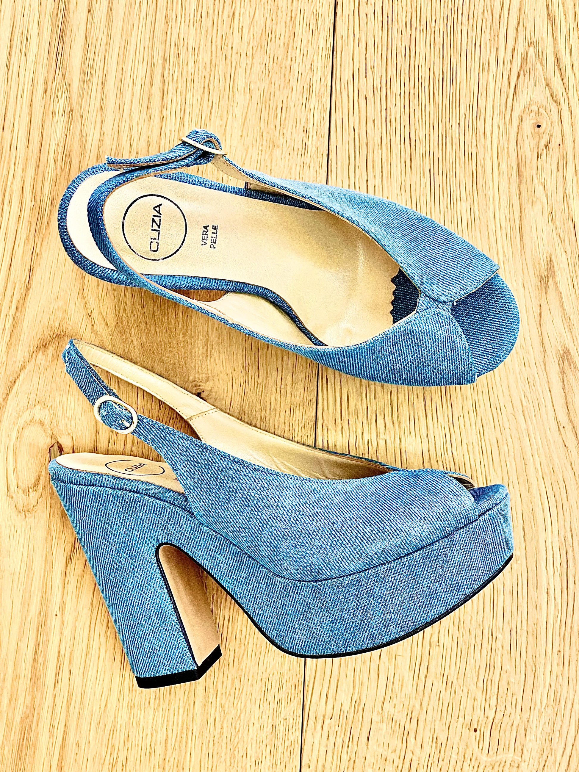 Escarpins à bout ouvert et à talon haut en jean bleu.