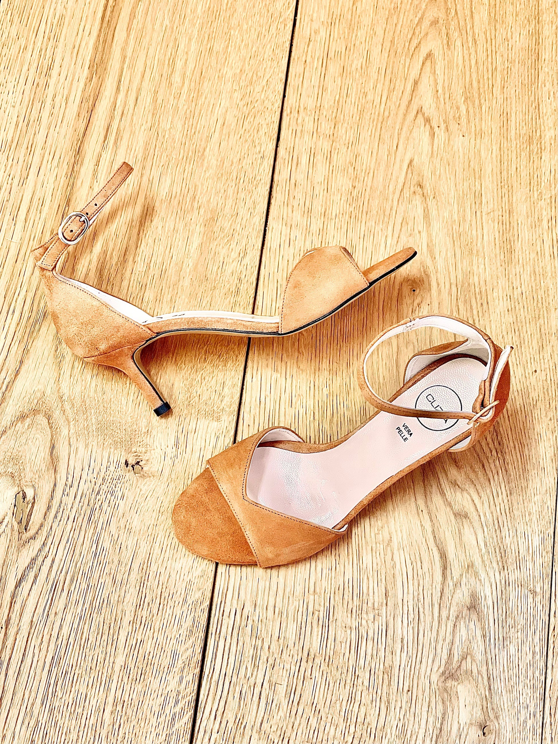 Sandales en daim à lanière et talon en V avec un talon de 6 cm.