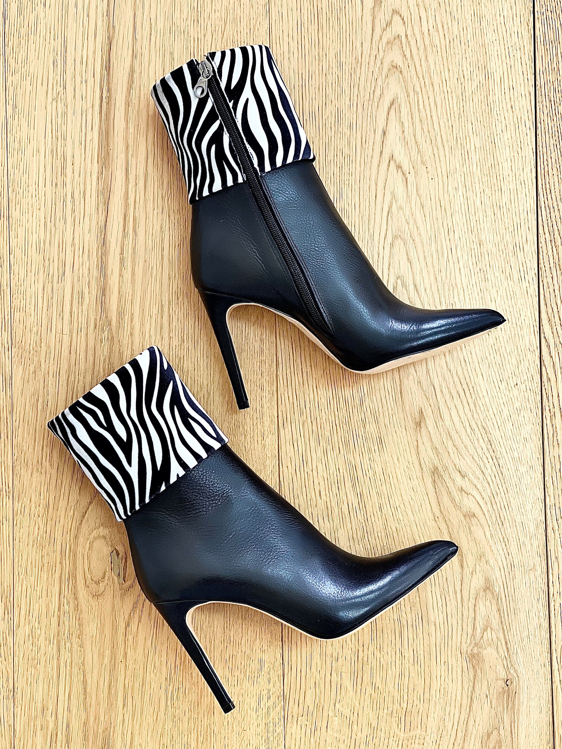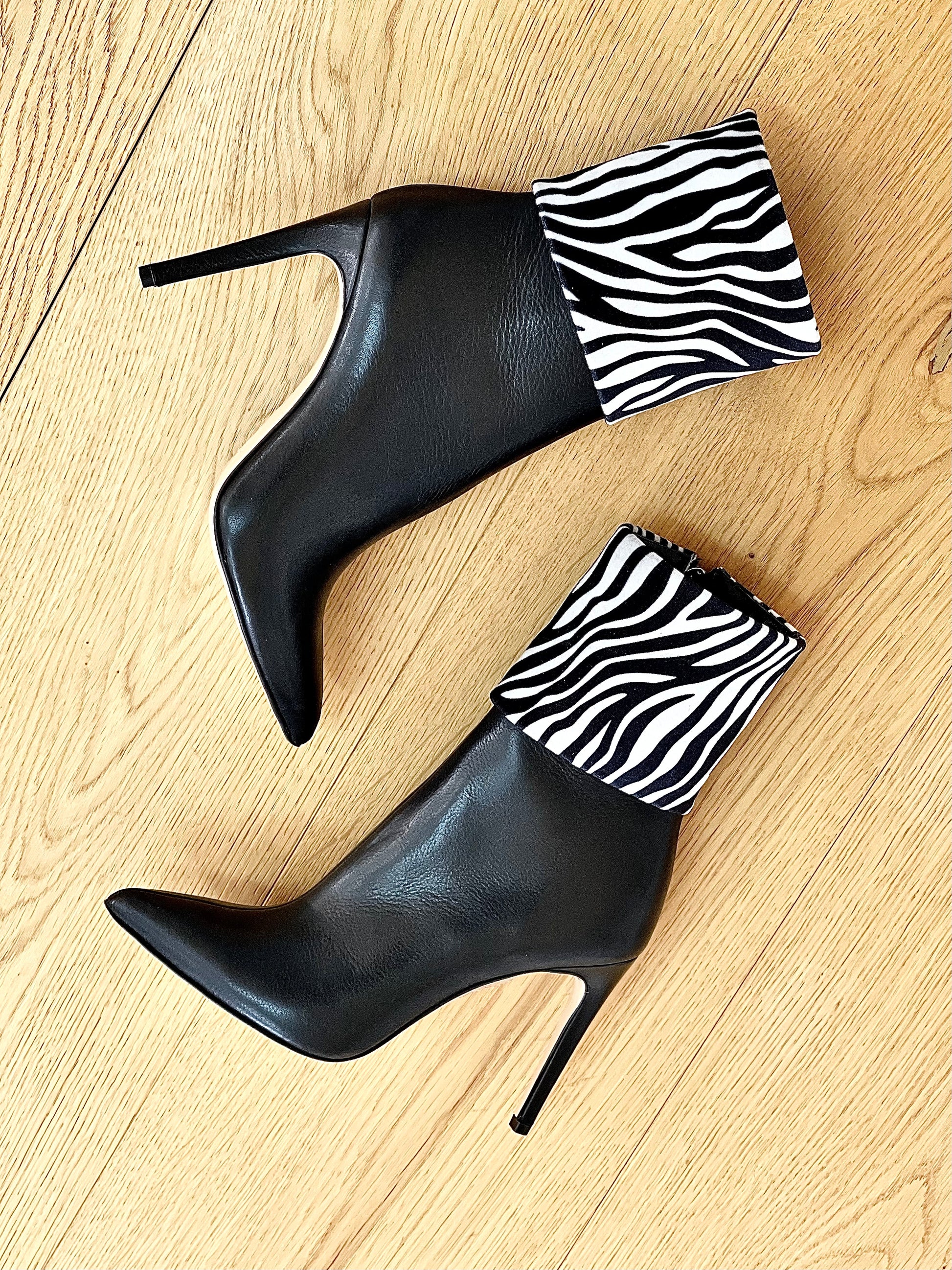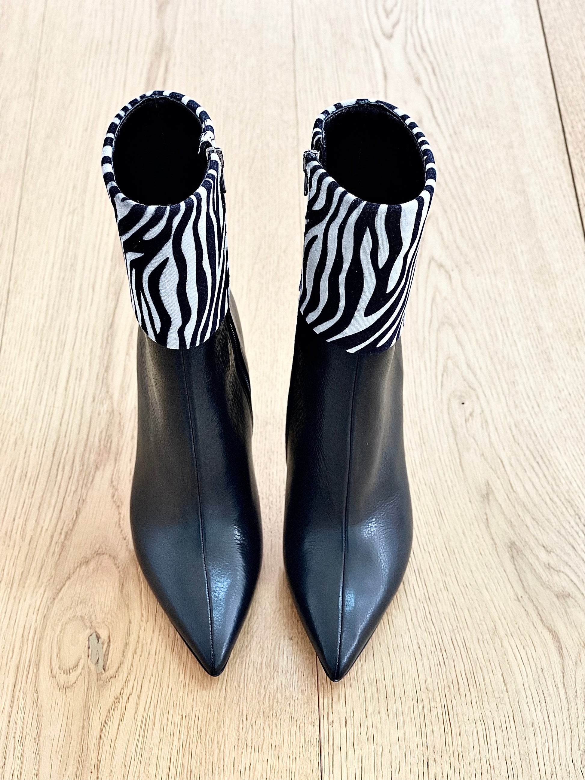 Bottines hautes et pointues en cuir avec talon aiguille en animalier.