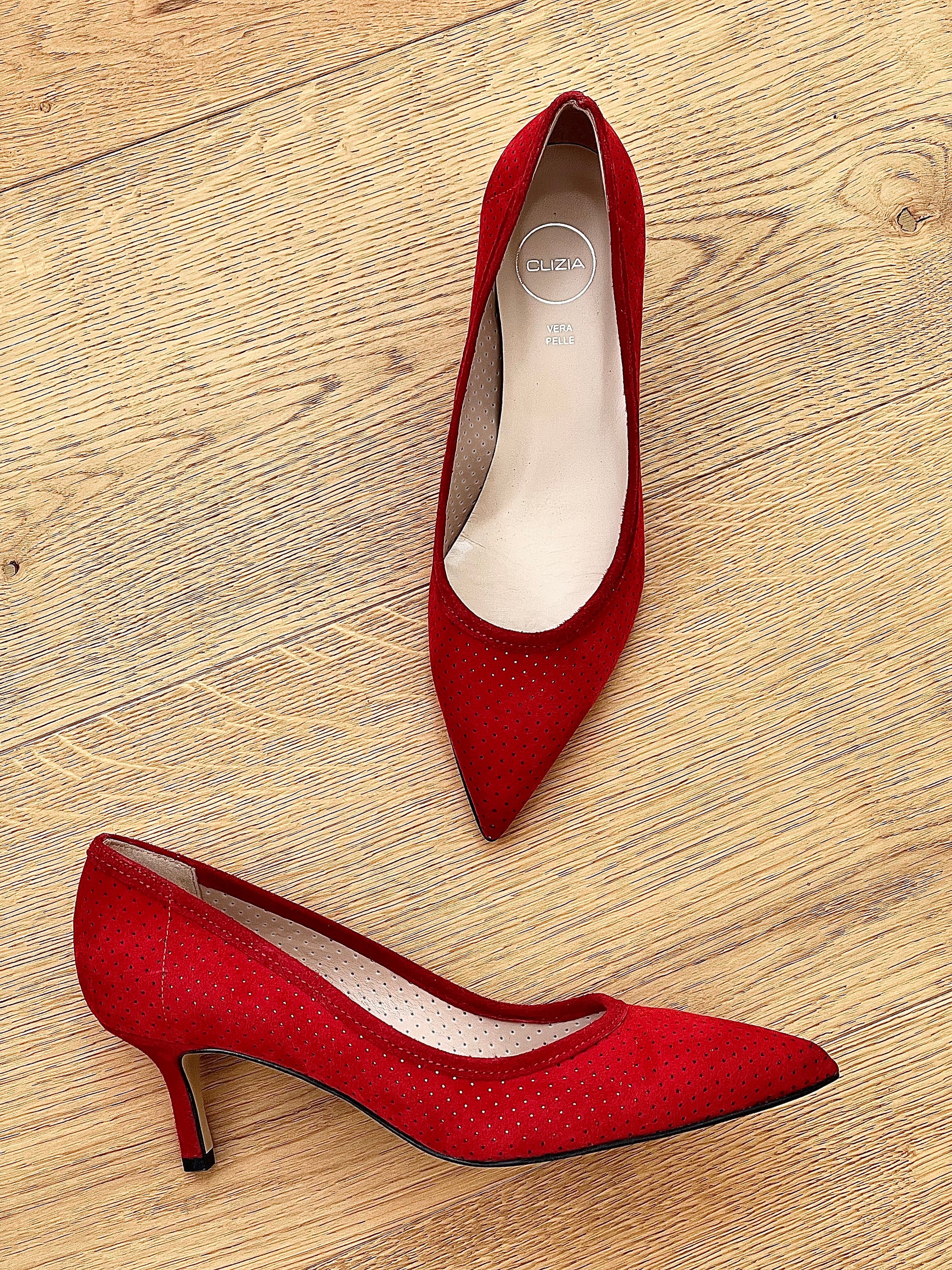 Escarpins pointus en daim perforé.