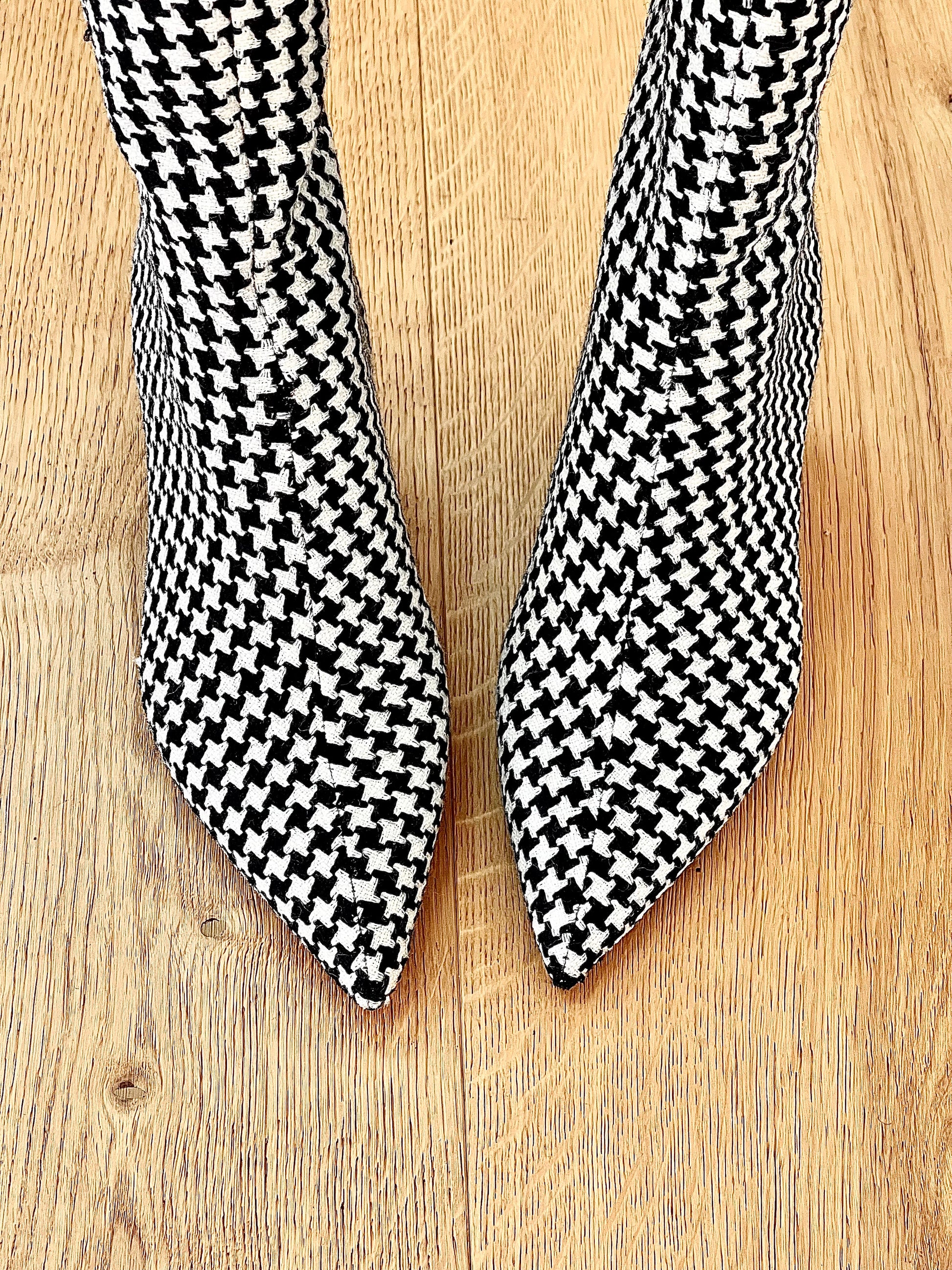Bottes tubulaires pied-de-poule avec semelle compensée en cuir verni.
