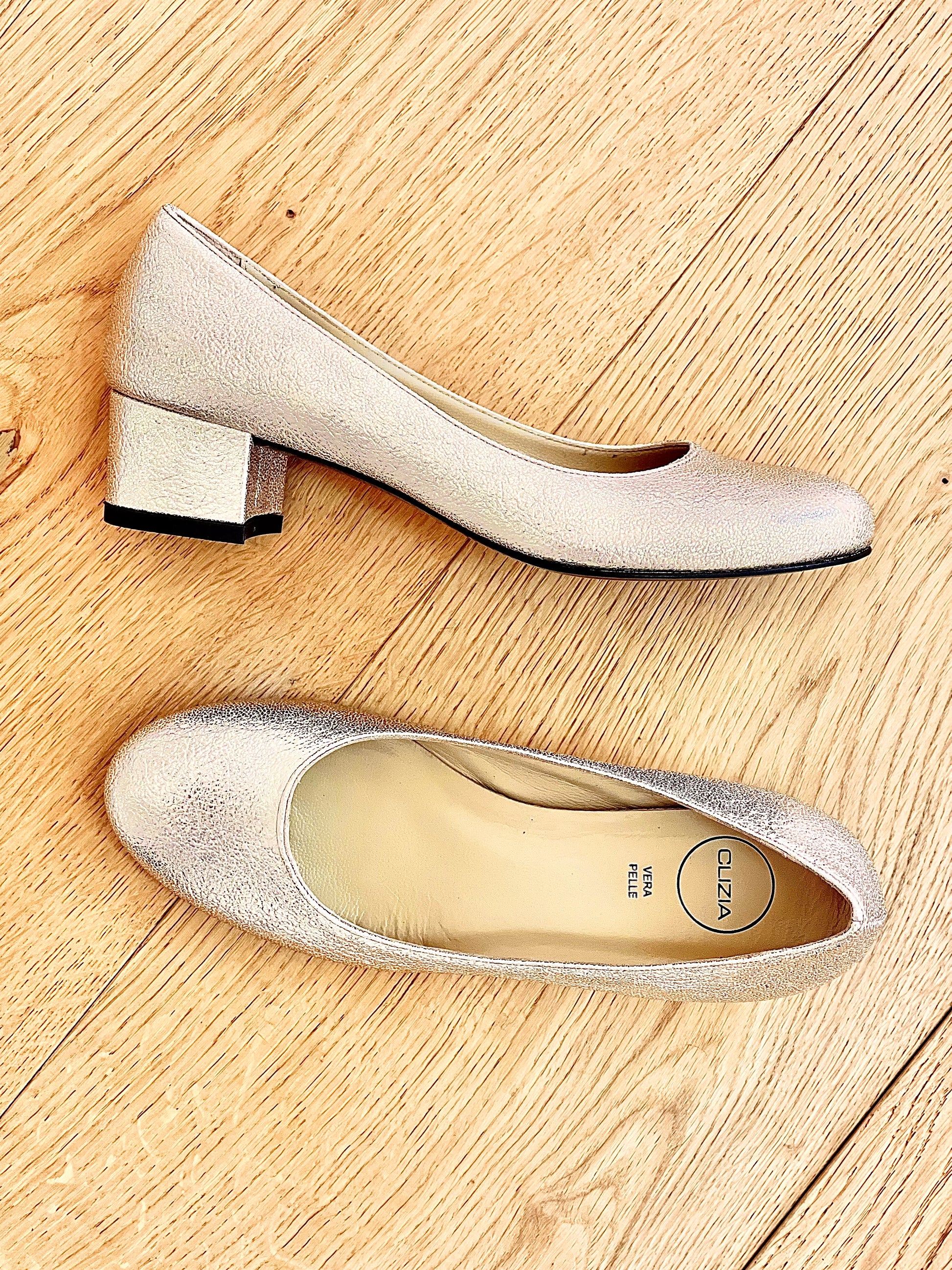 Escarpins laminés à bout rond et à talon large.