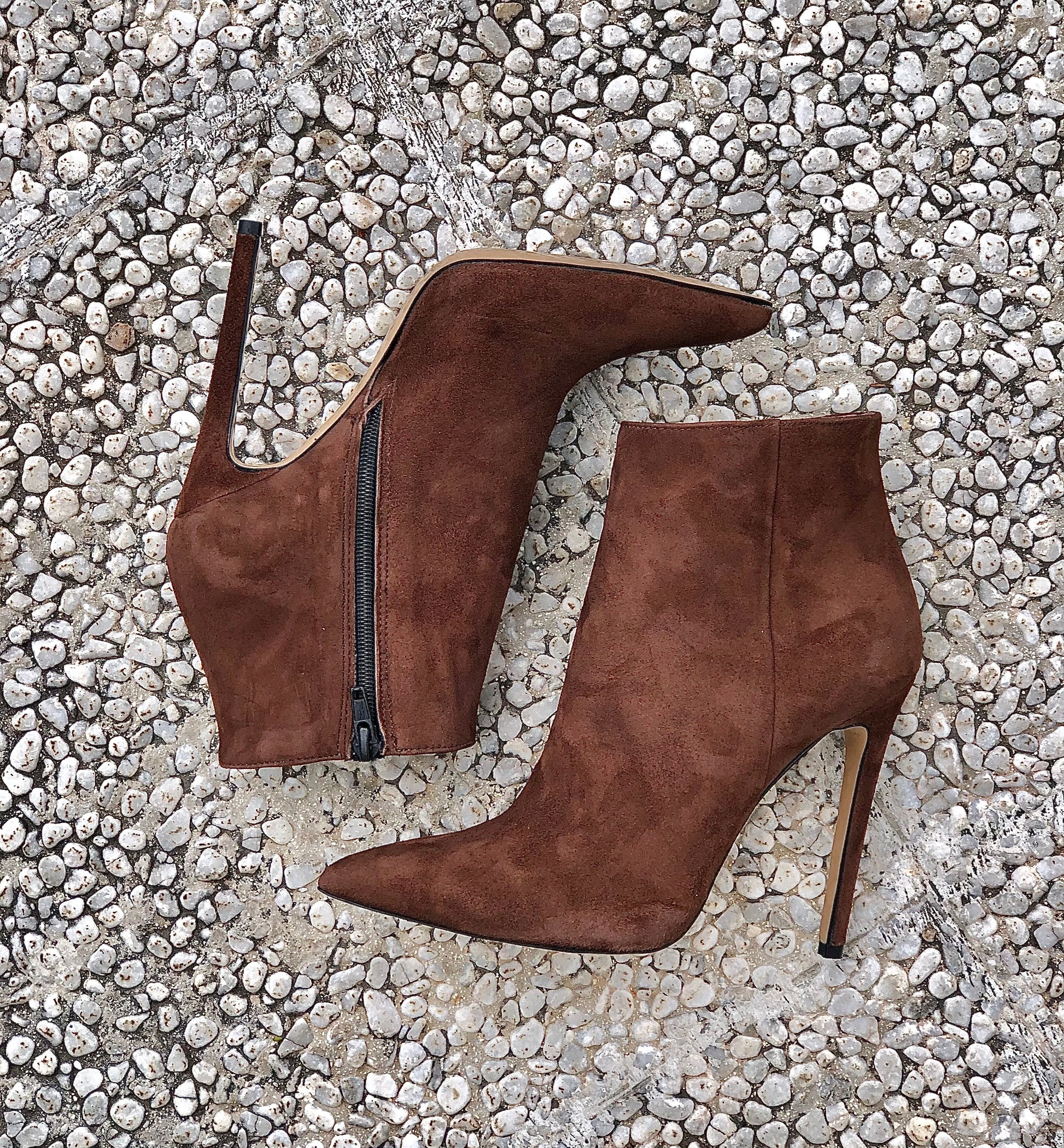 Bottines en daim à bout pointu avec un talon à pointes de 10 cm.
