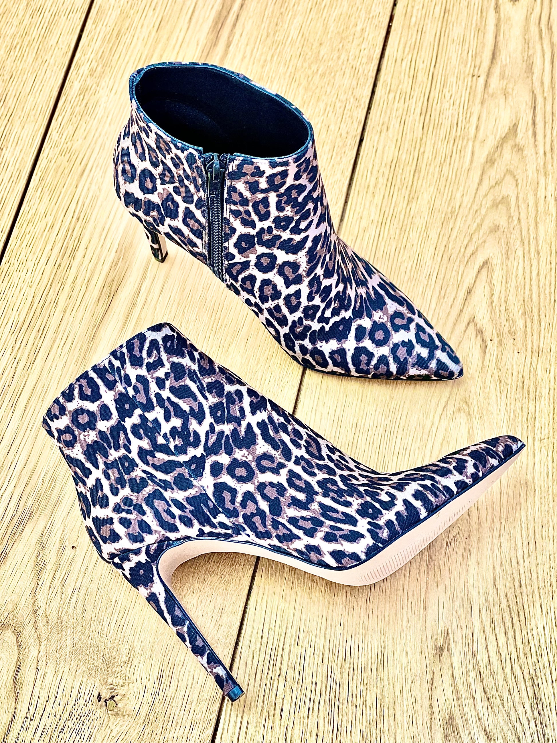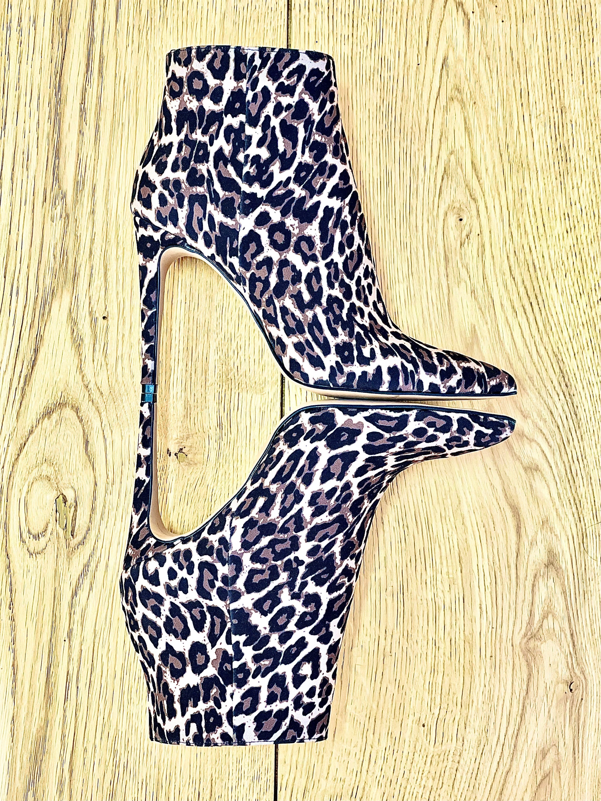 Bottines à bout pointu en imprimé léopard avec un talon aiguille de 10 cm.
