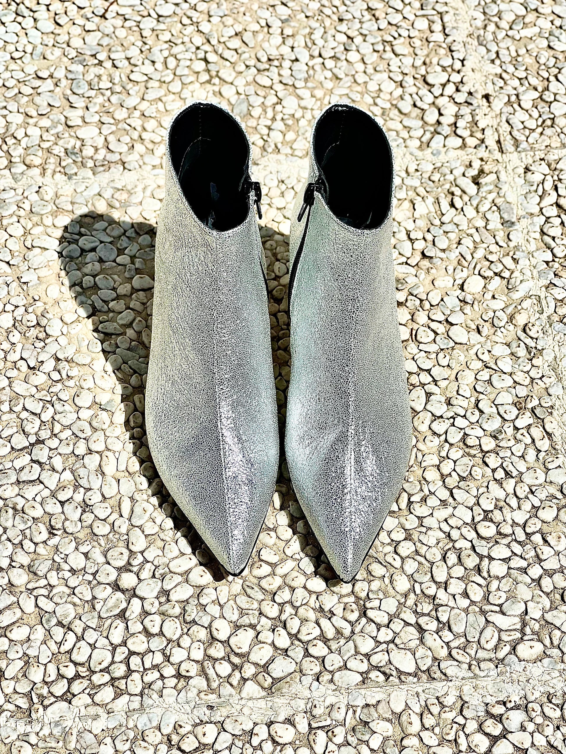 Bottine laminée à bout pointu avec un talon de 6 cm.
