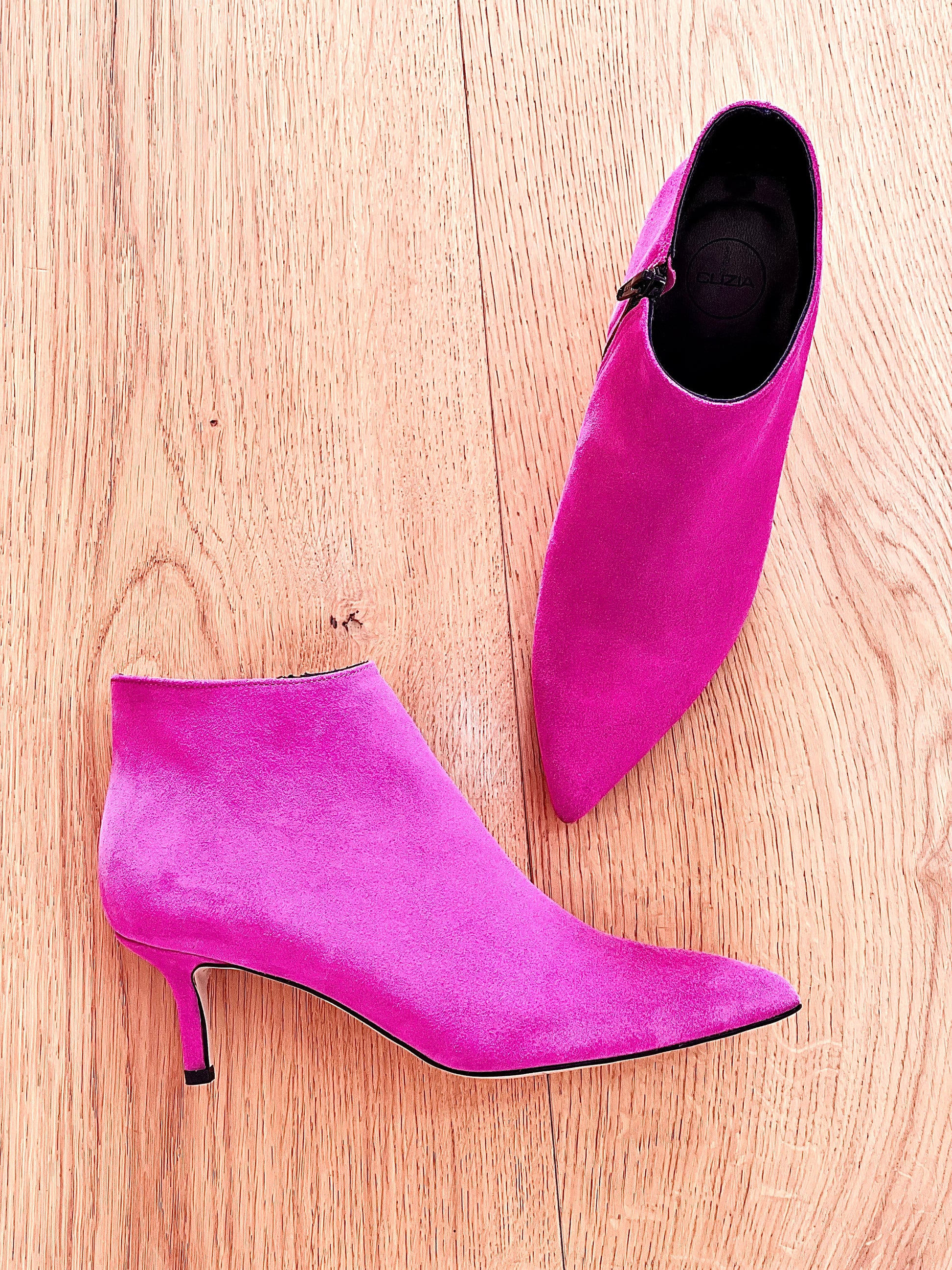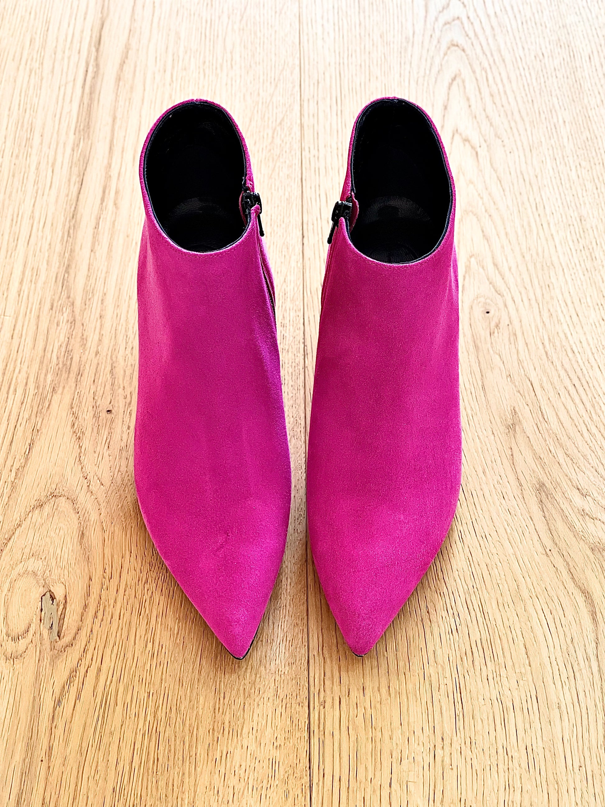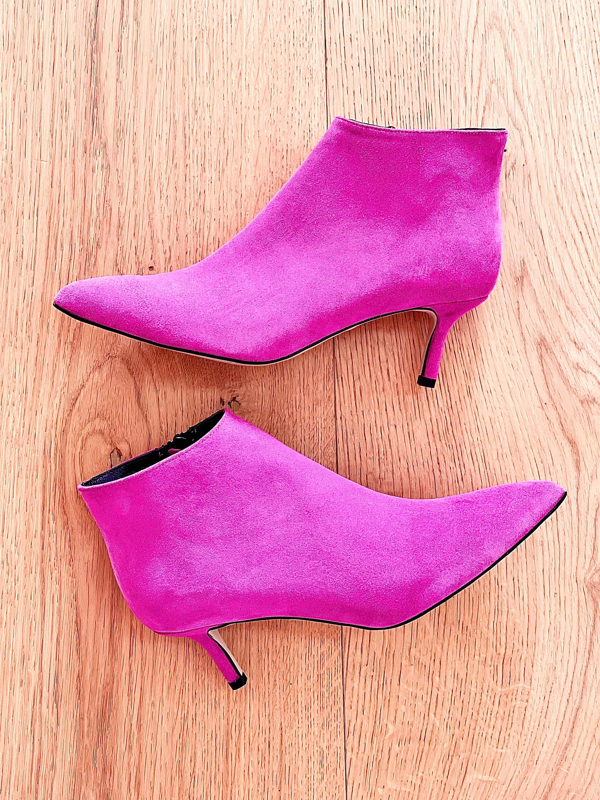 Bottines à bout pointu en daim avec un talon de 6 cm.