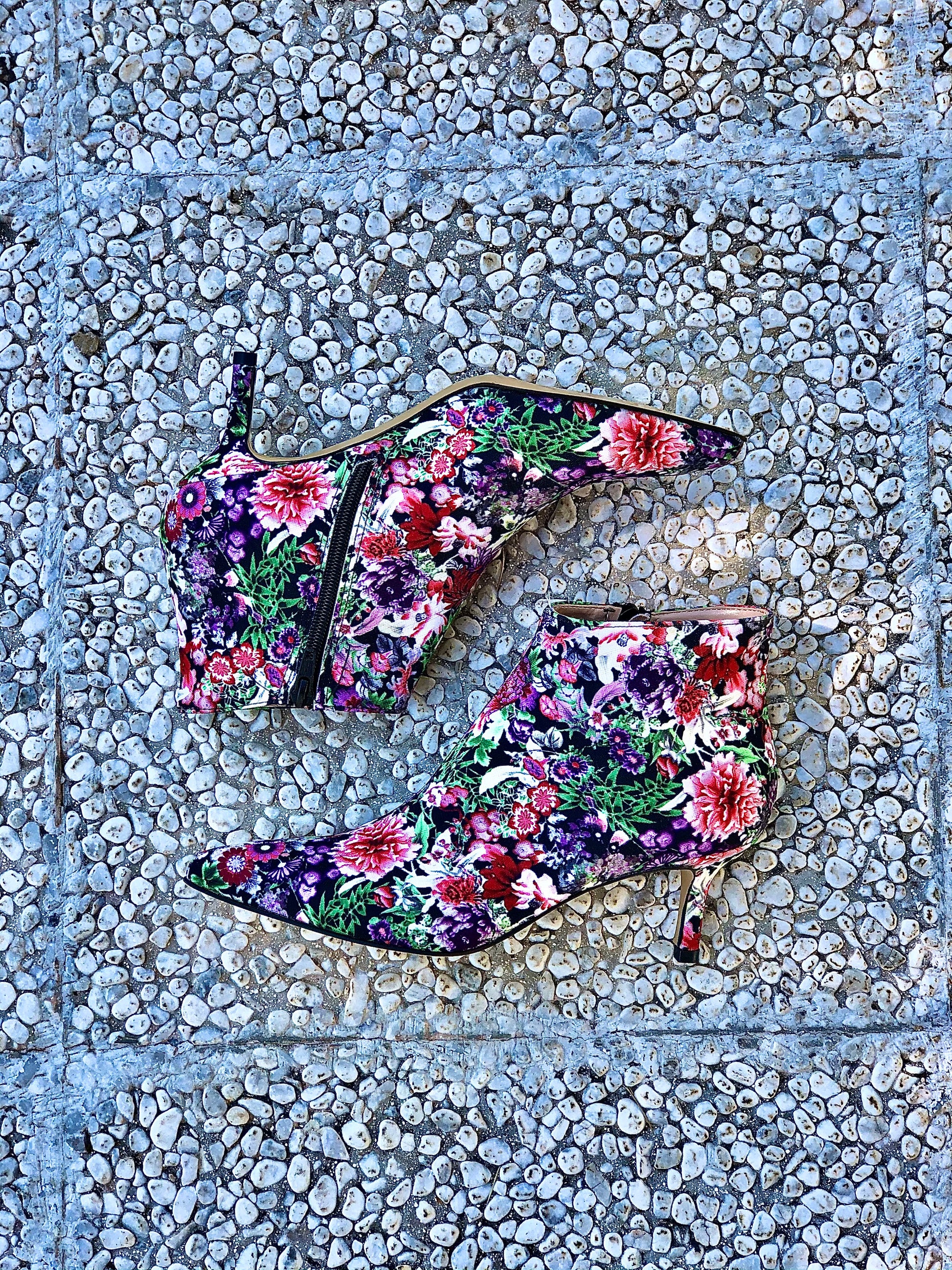 Bottines à bout pointu en tissu floral avec un talon de 6 cm.