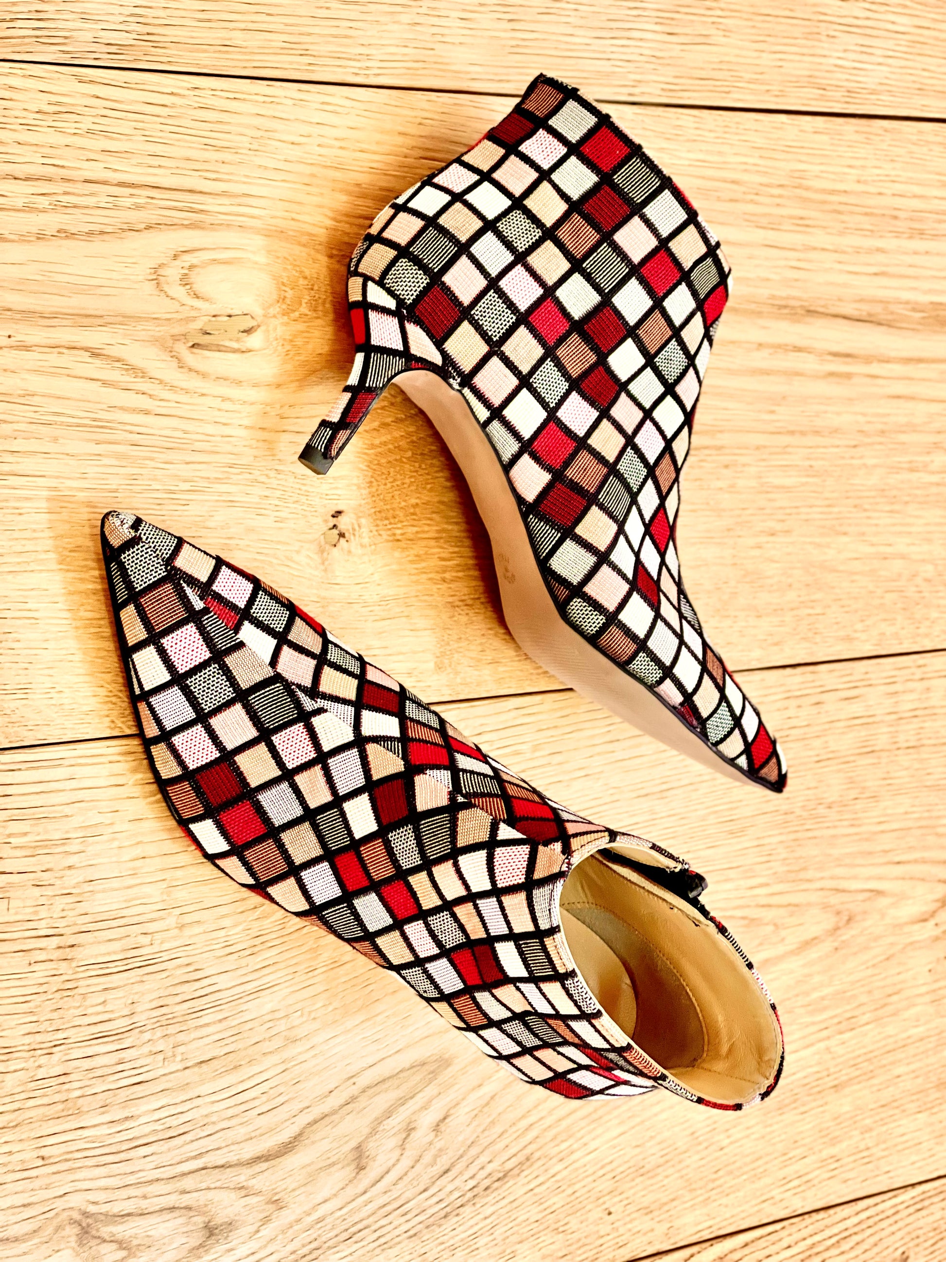 Bottines à bout pointu en jacquard multicolore à motif carré.