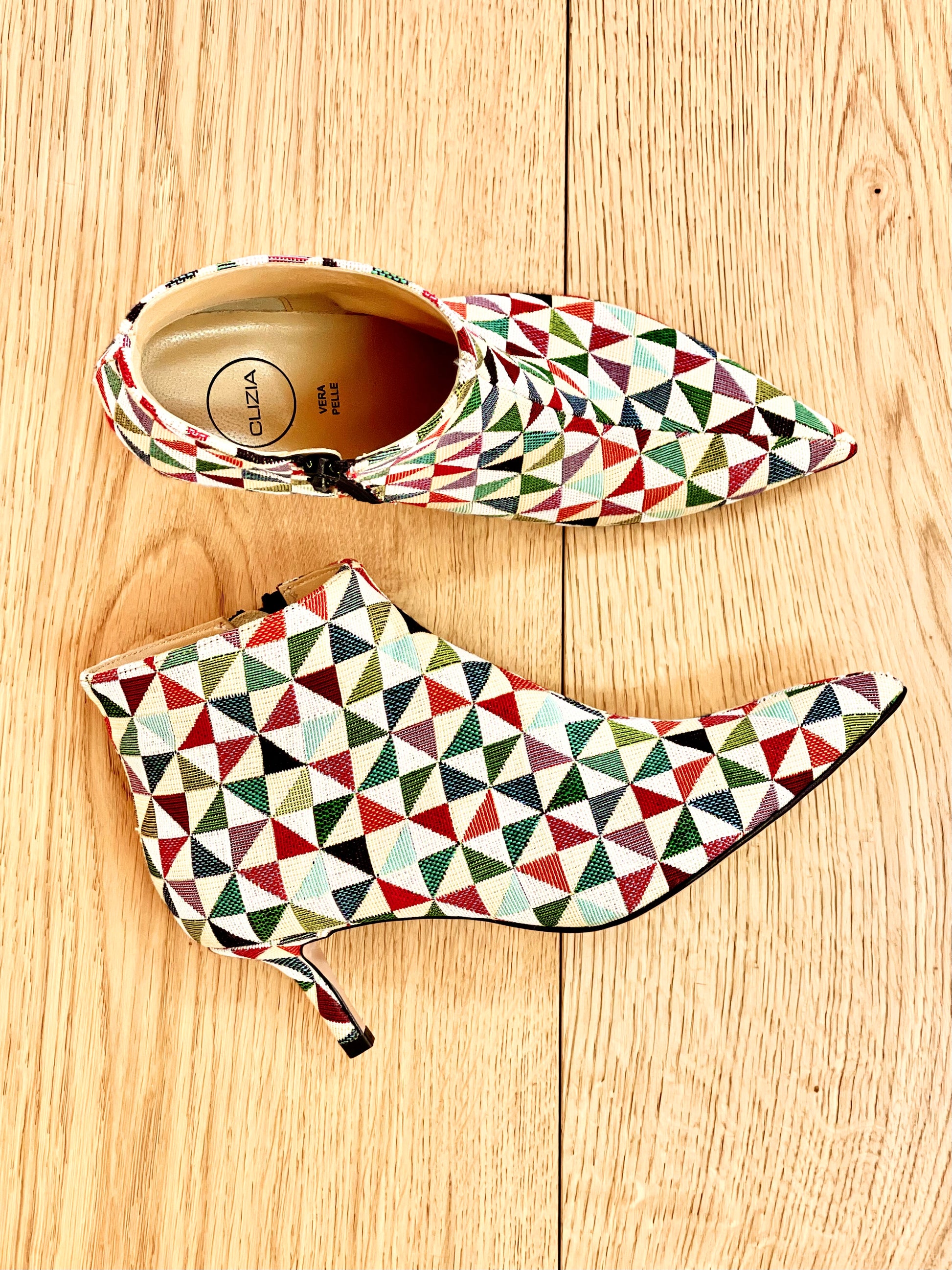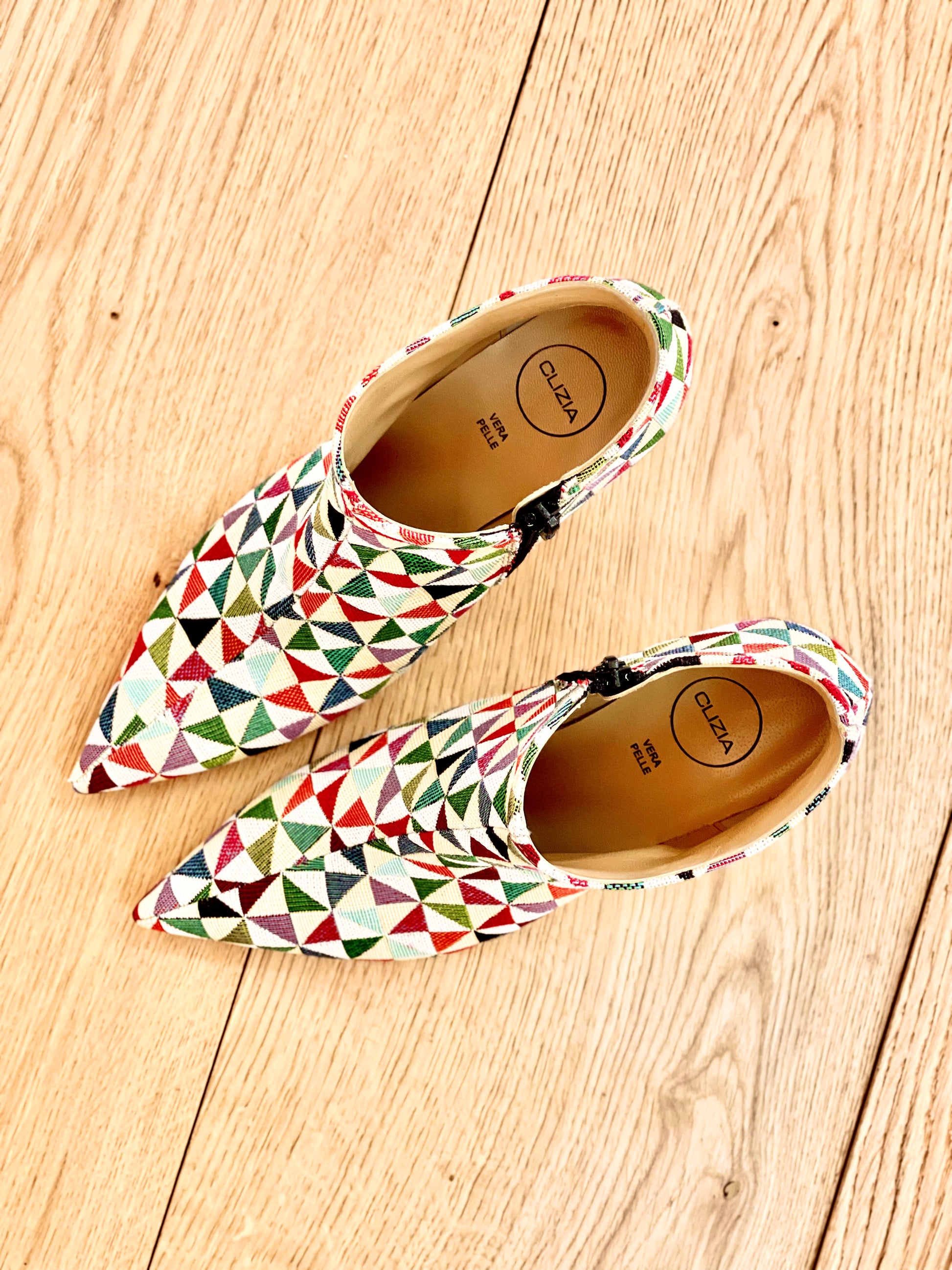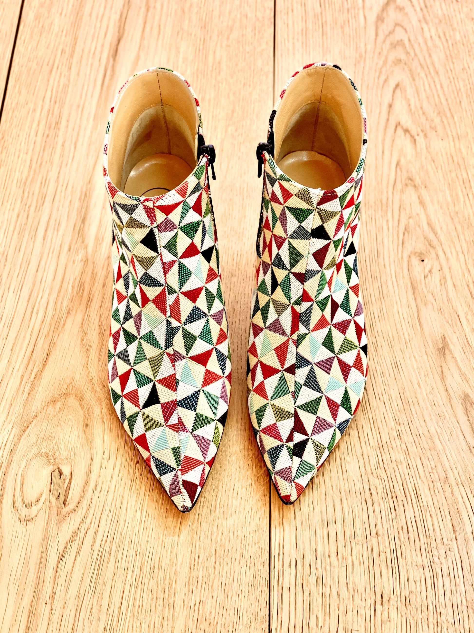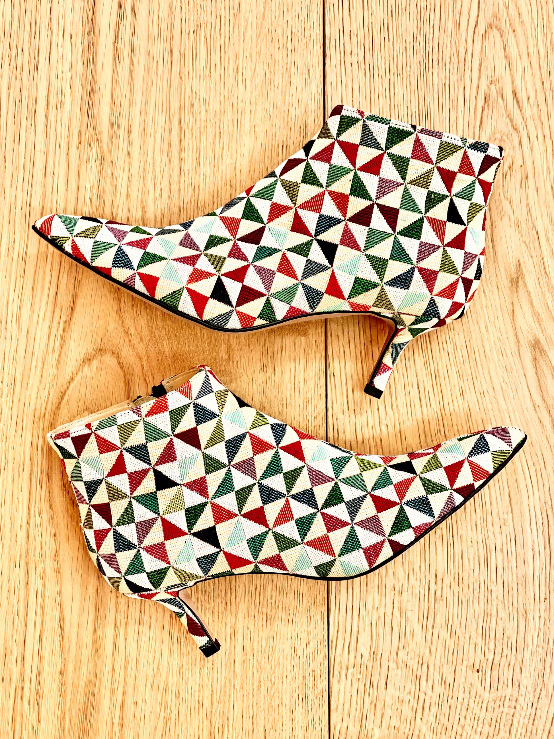 Bottines à bout pointu en jacquard multicolore avec motif triangle.