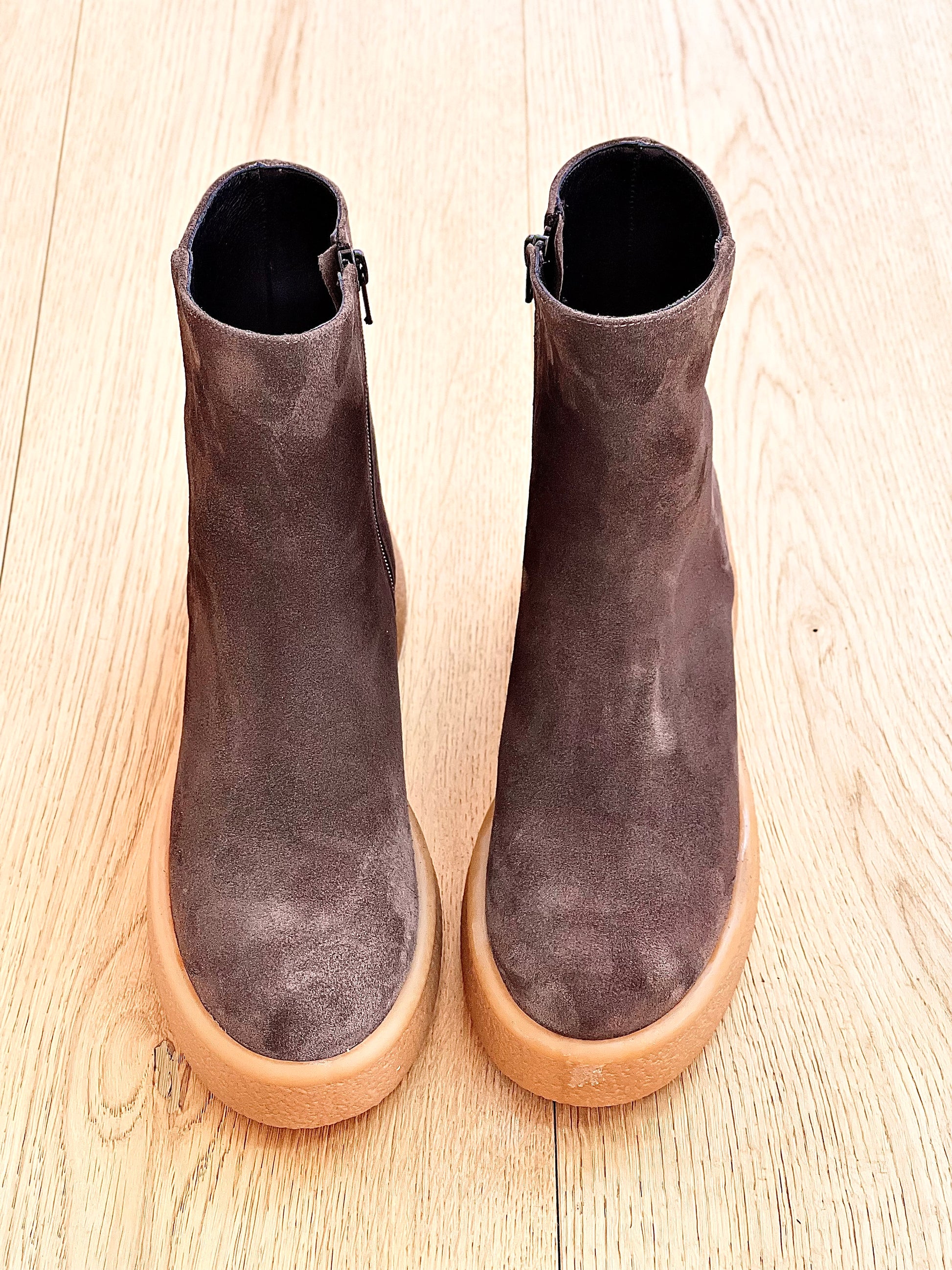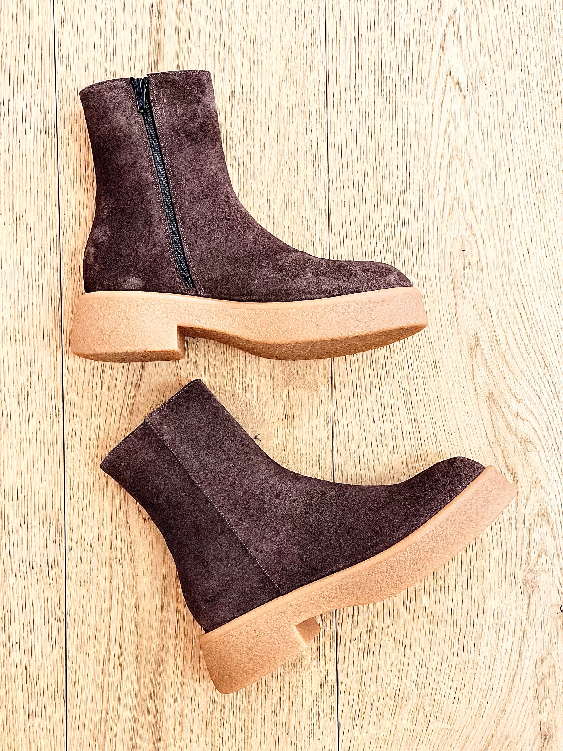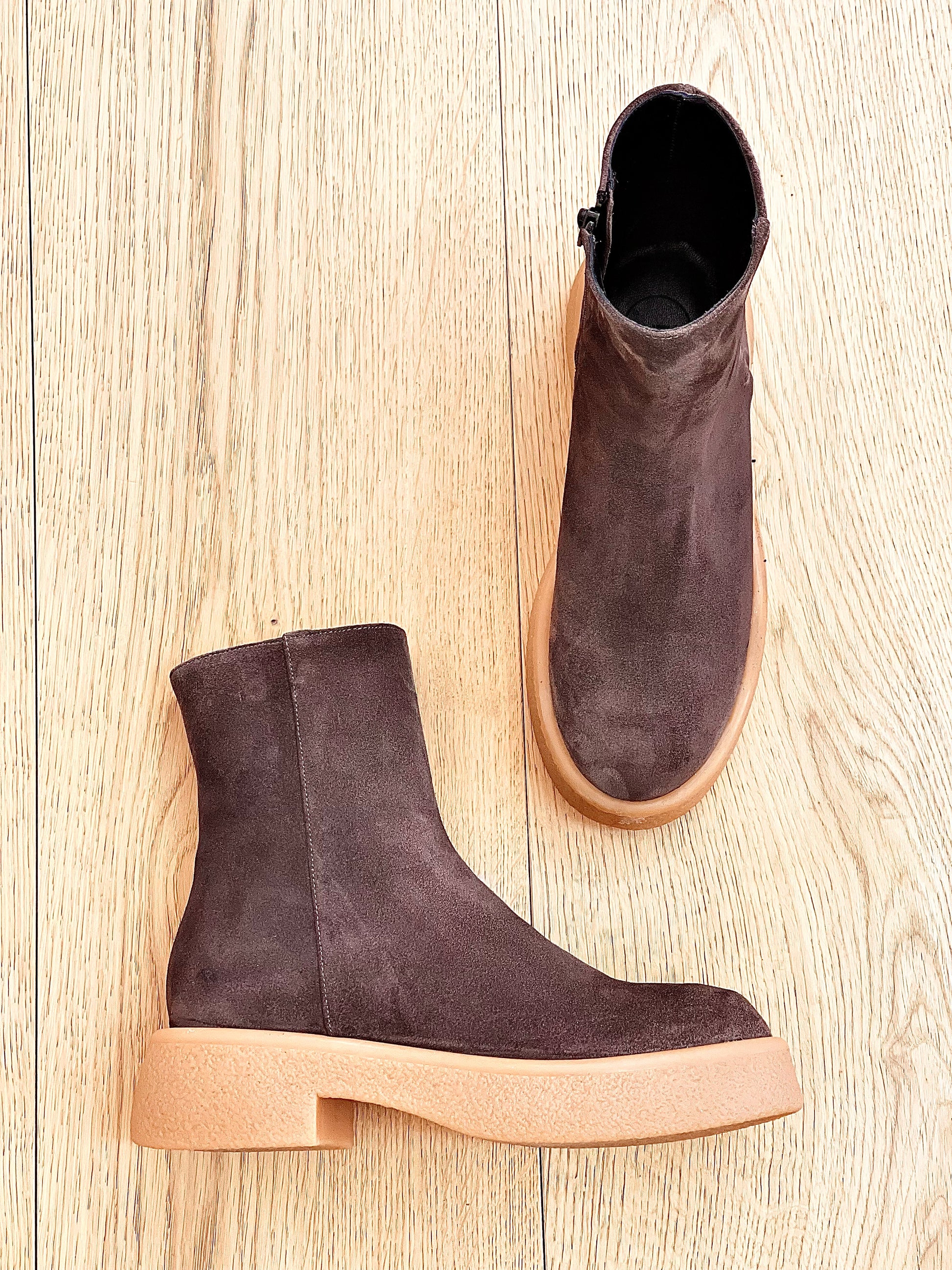Bottes basses en daim crêpé léger.