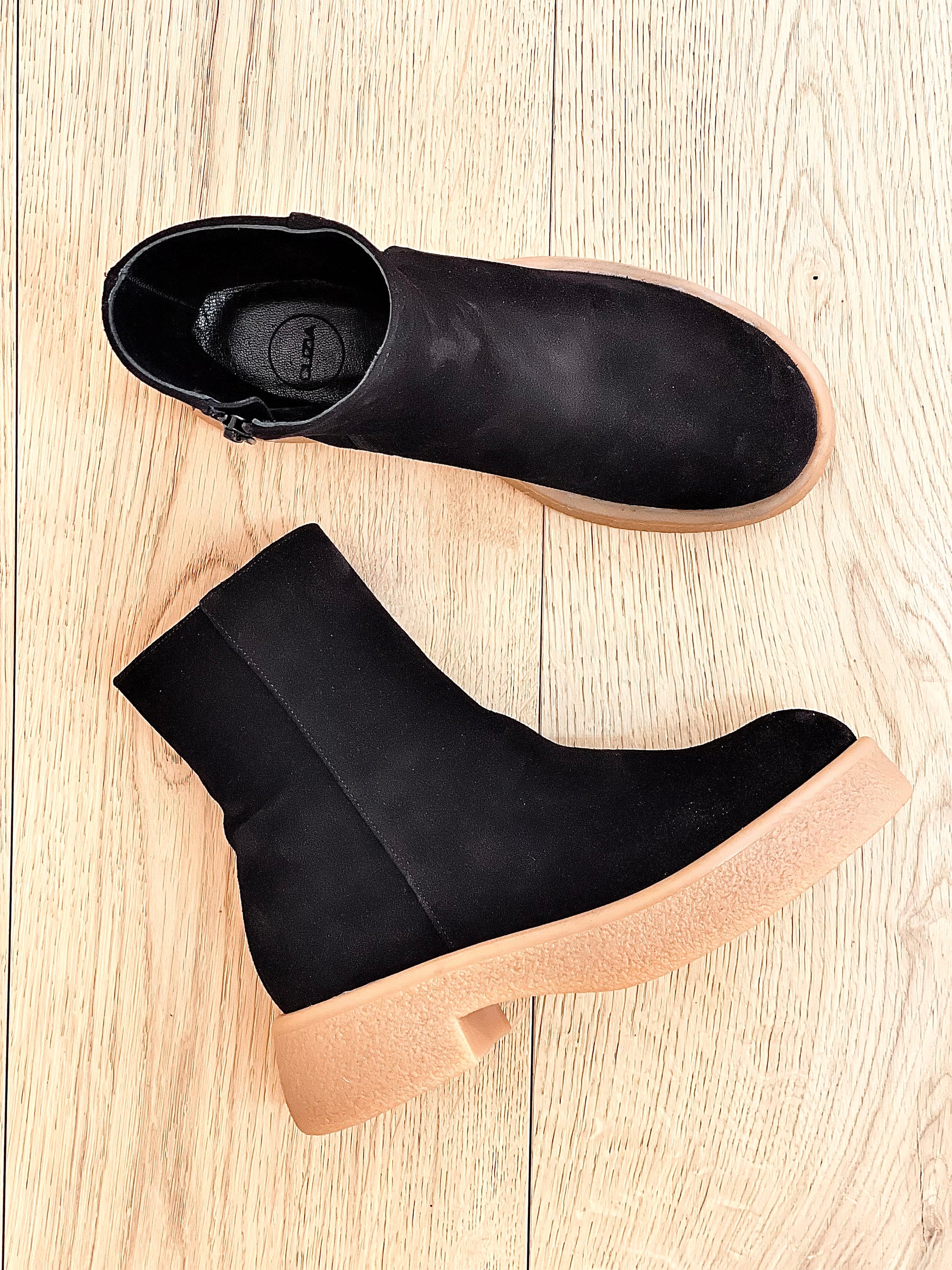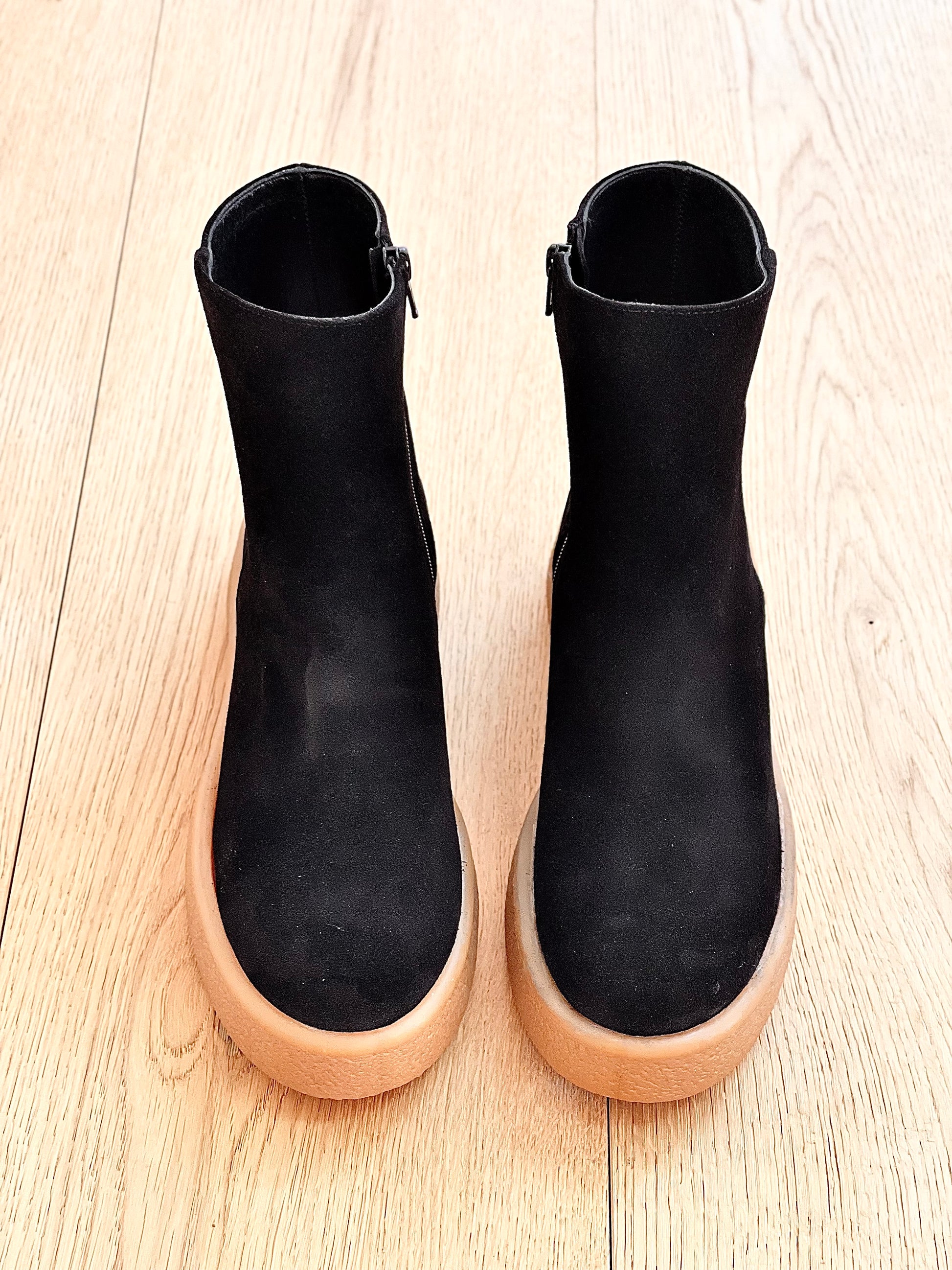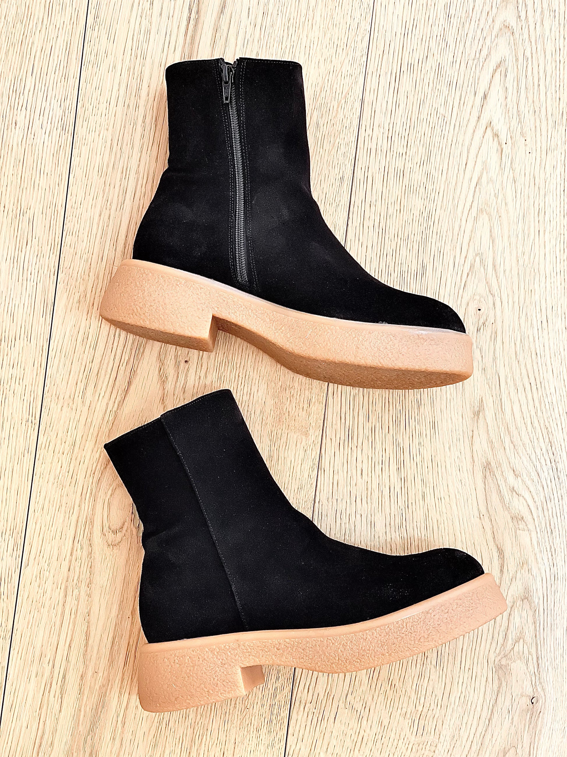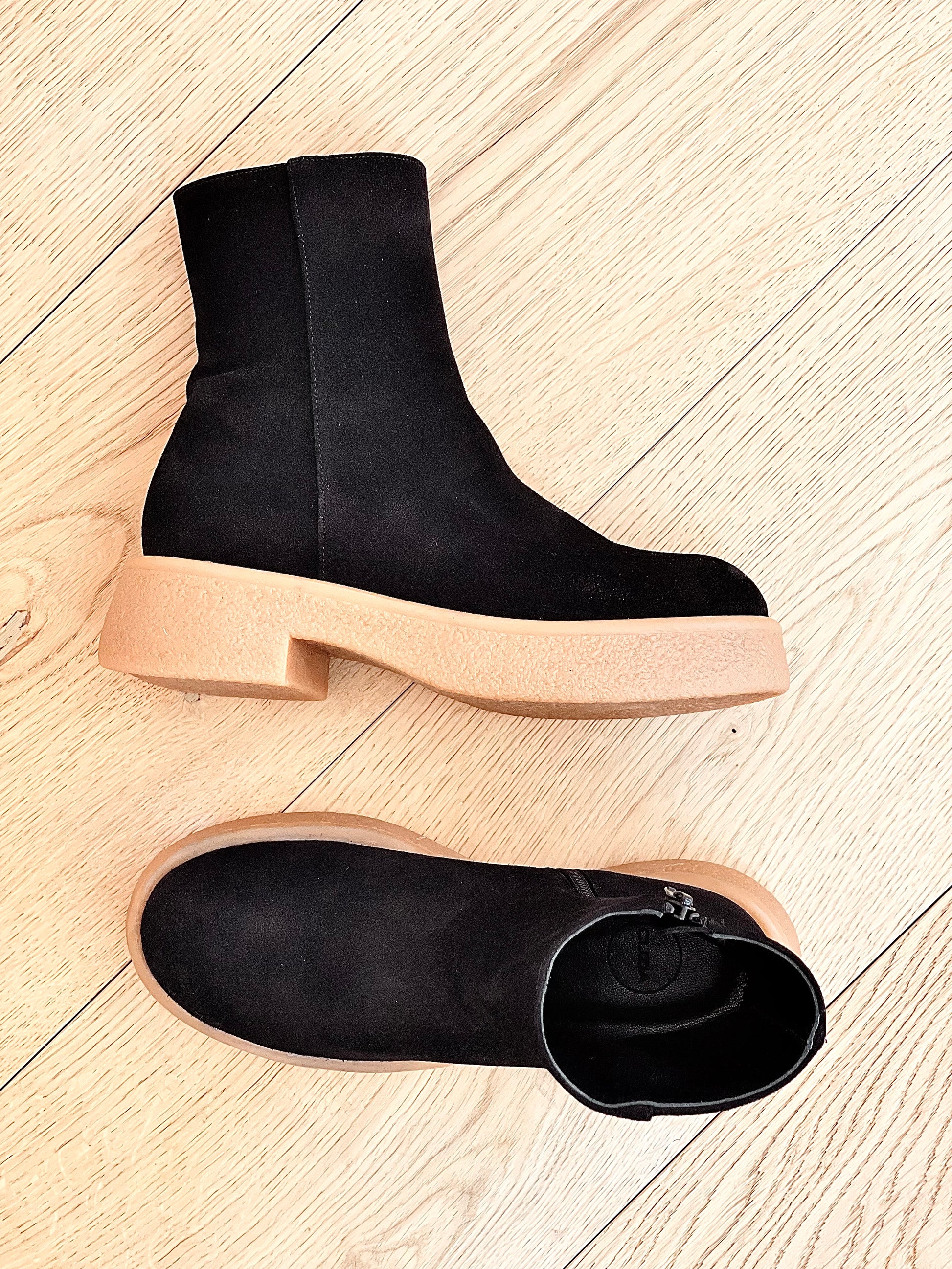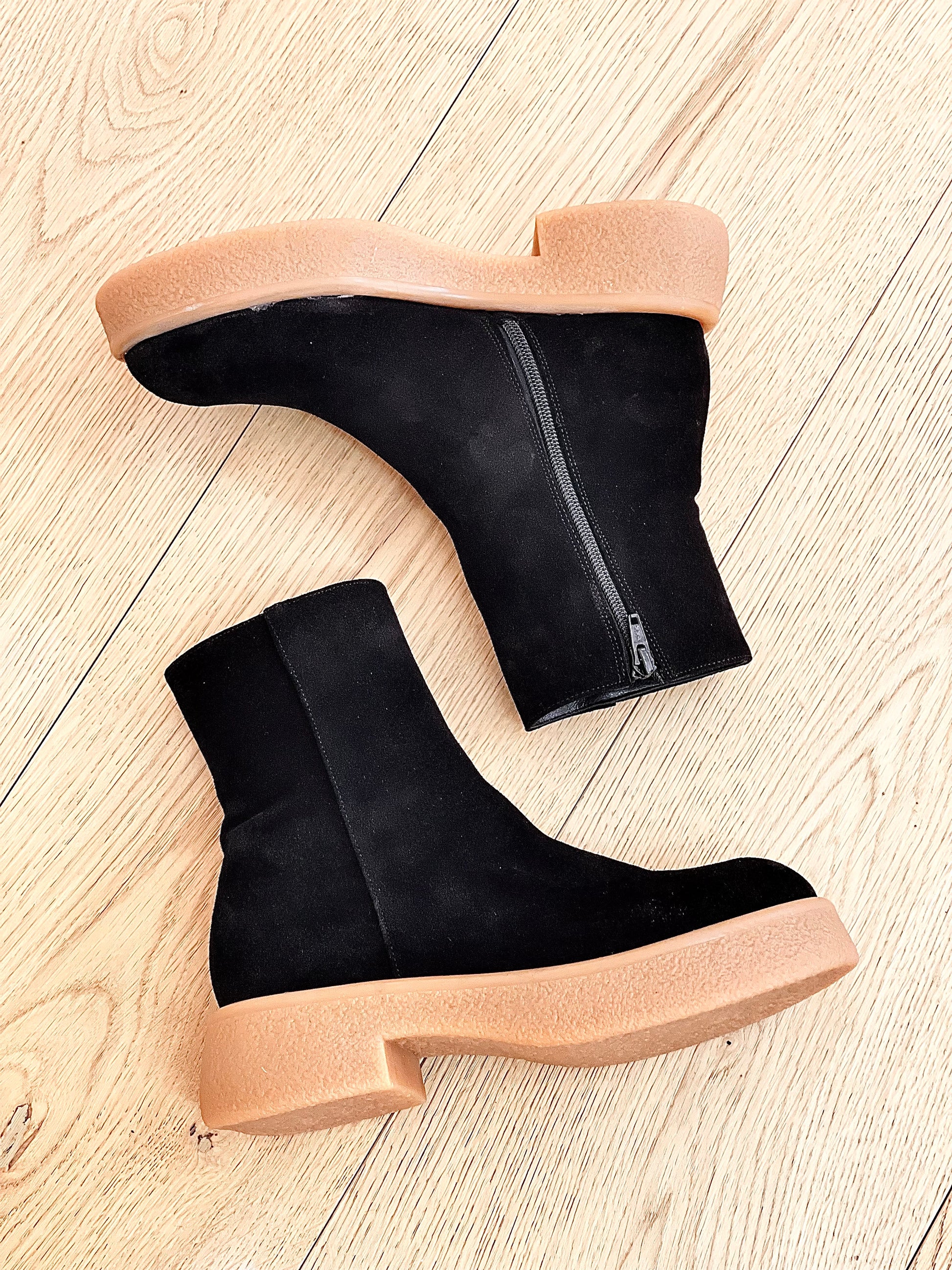 Bottes basses en daim crêpé léger.