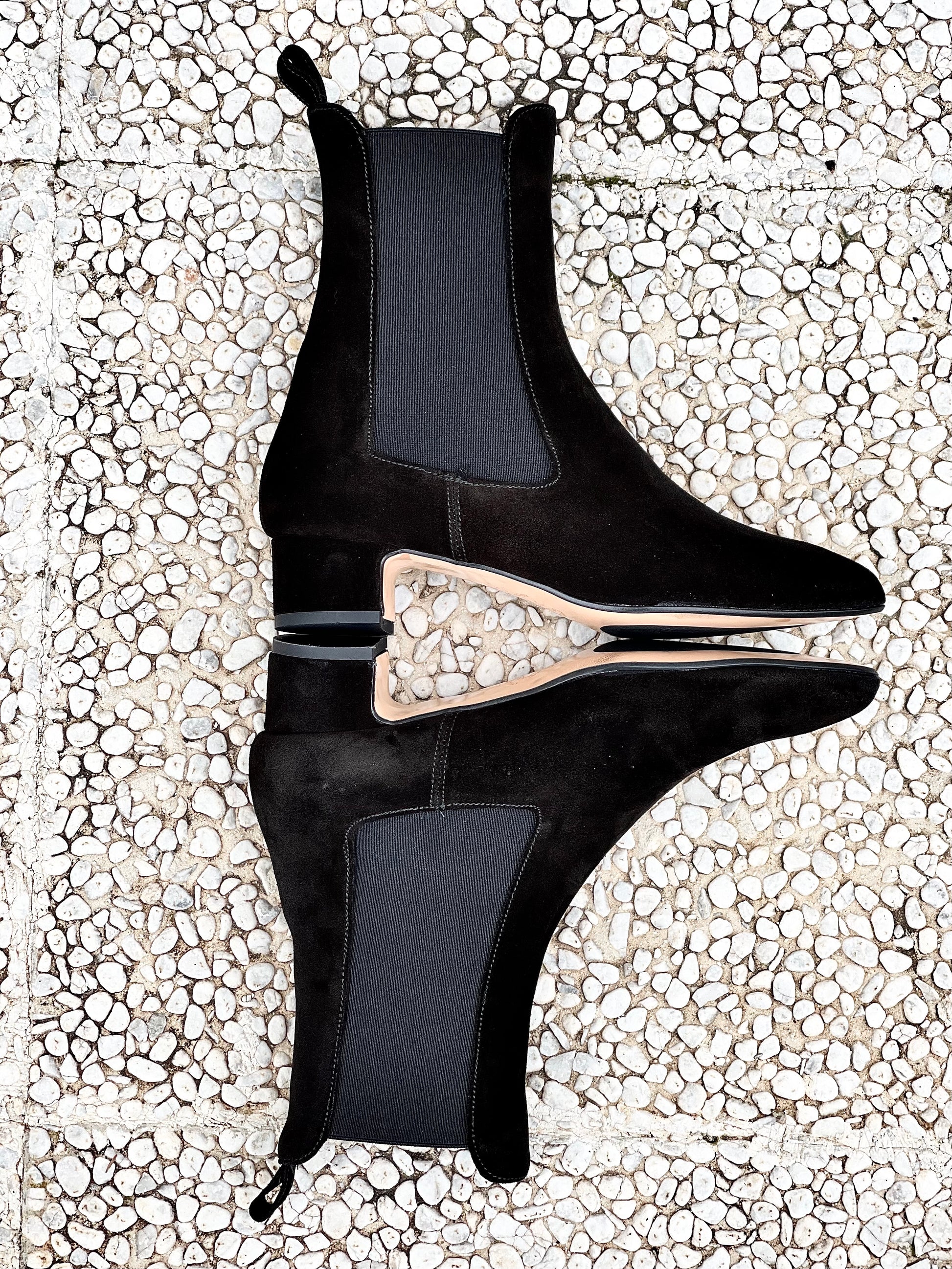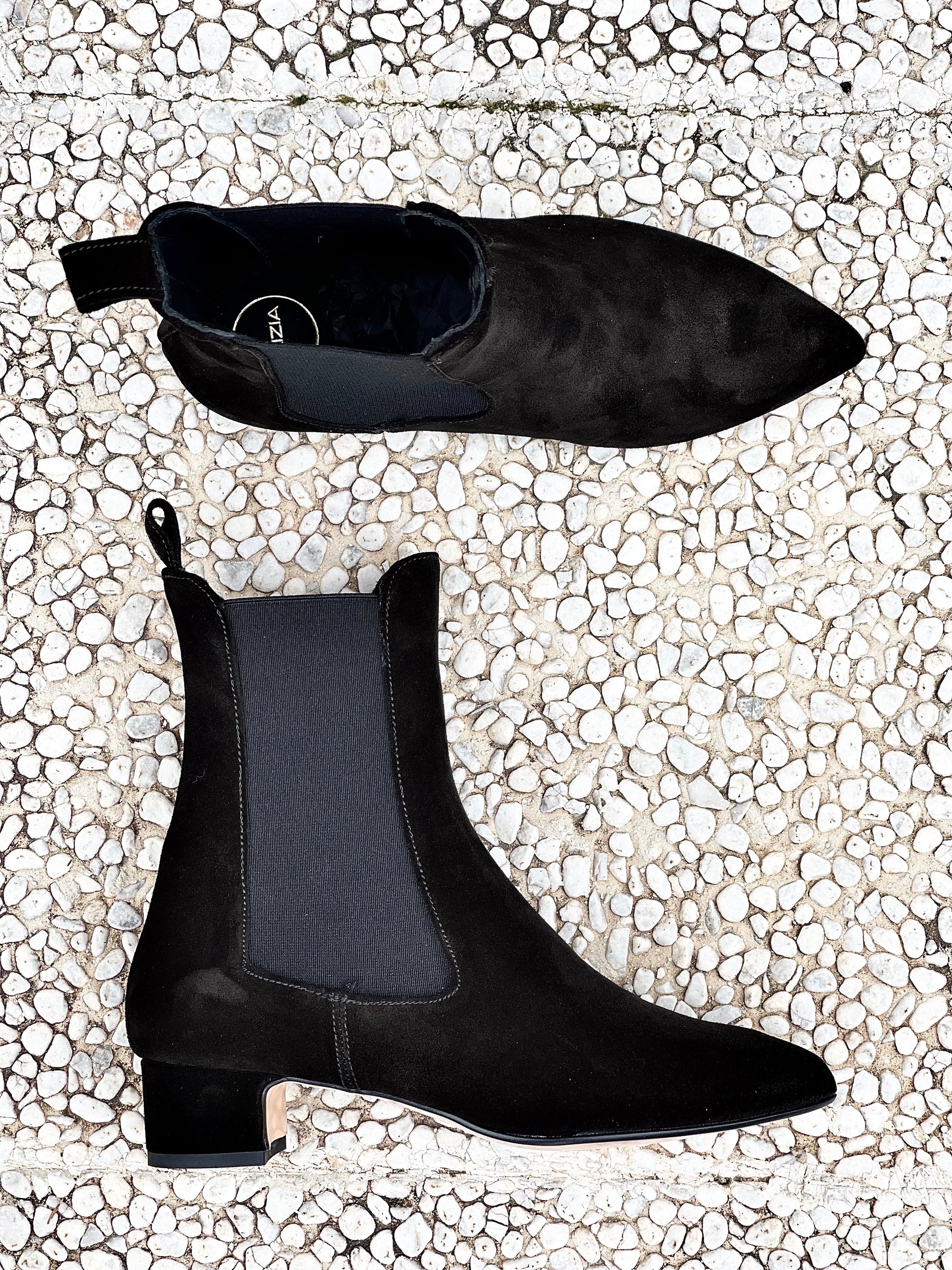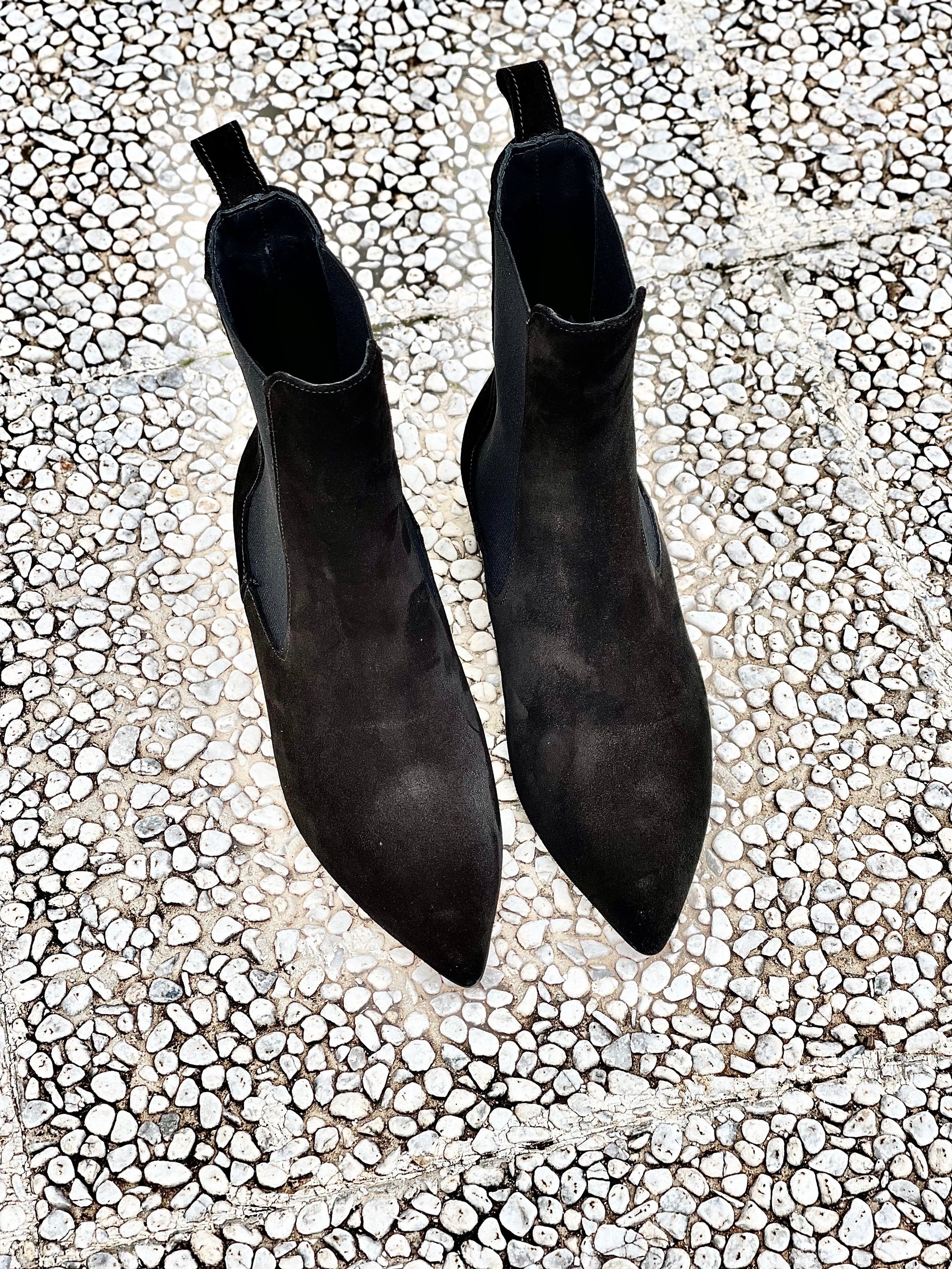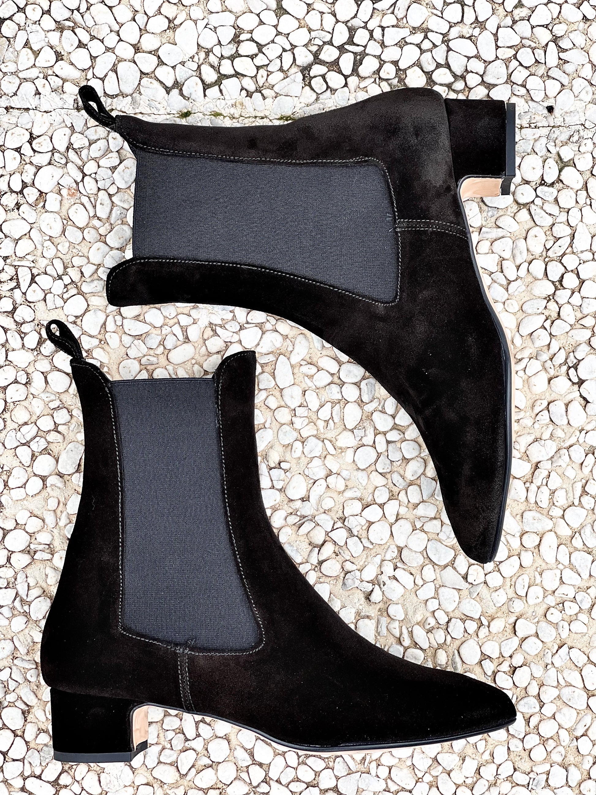 Botte chelsea à bout plat en daim avec talon large de 35 mm.