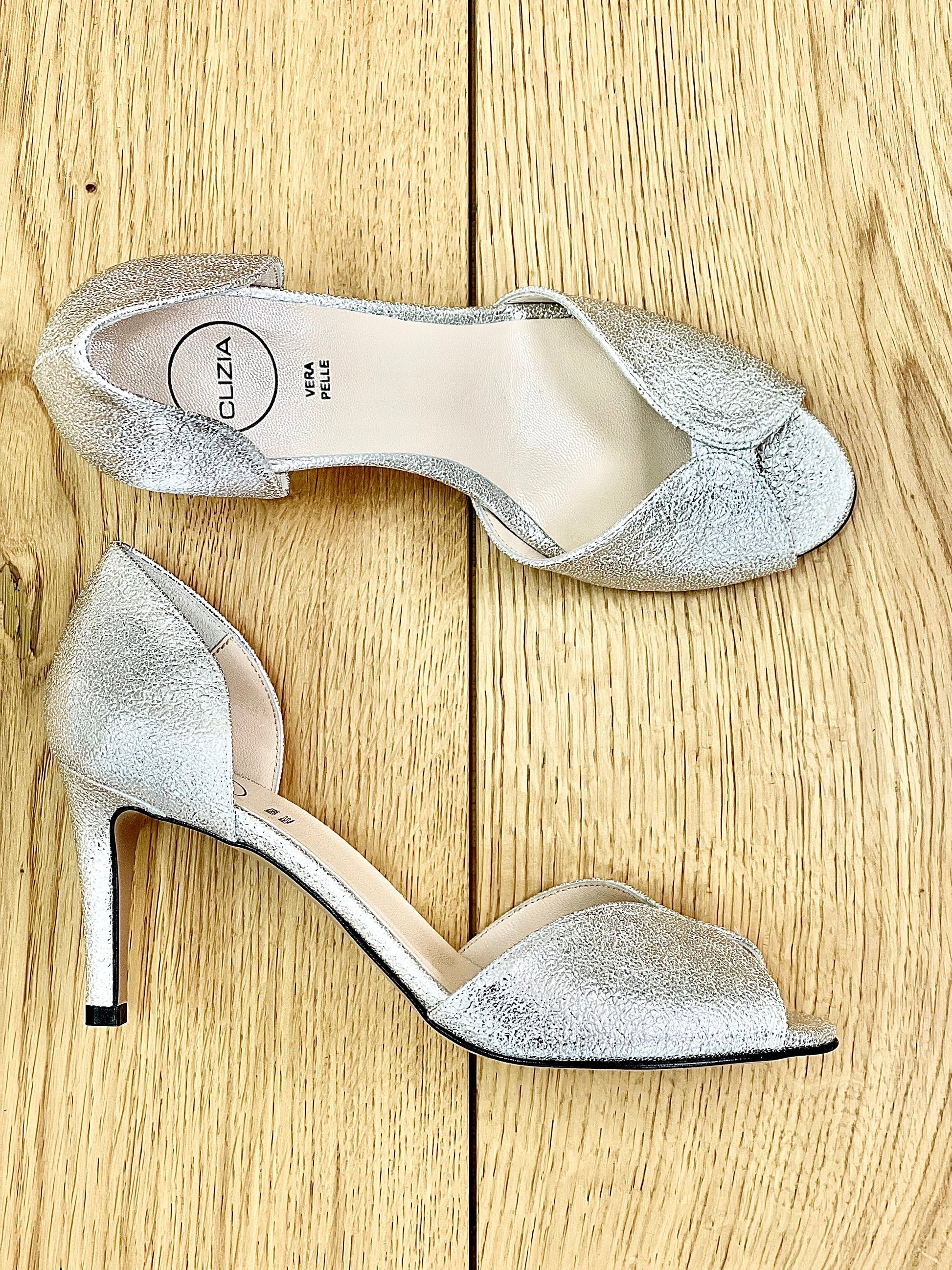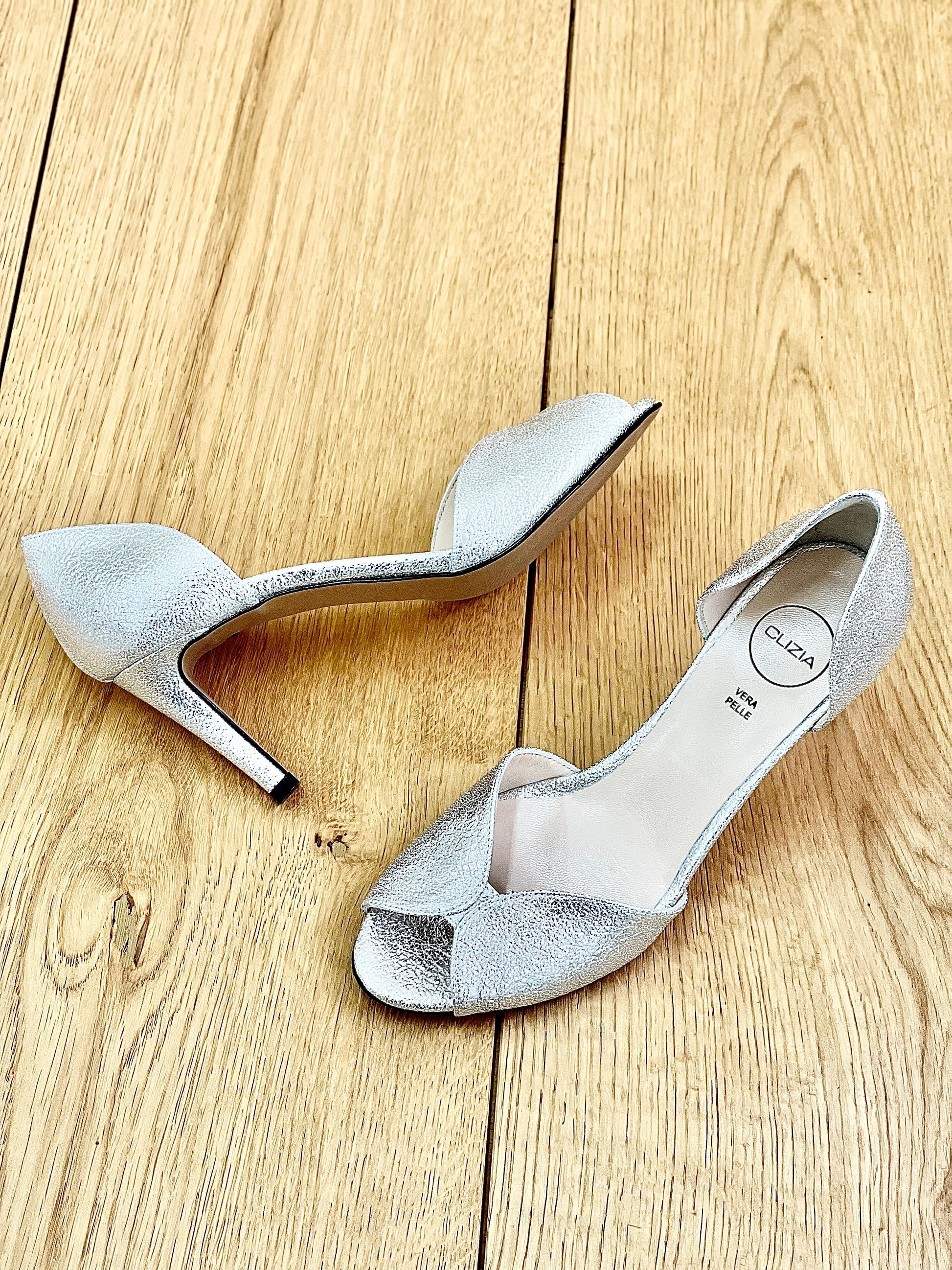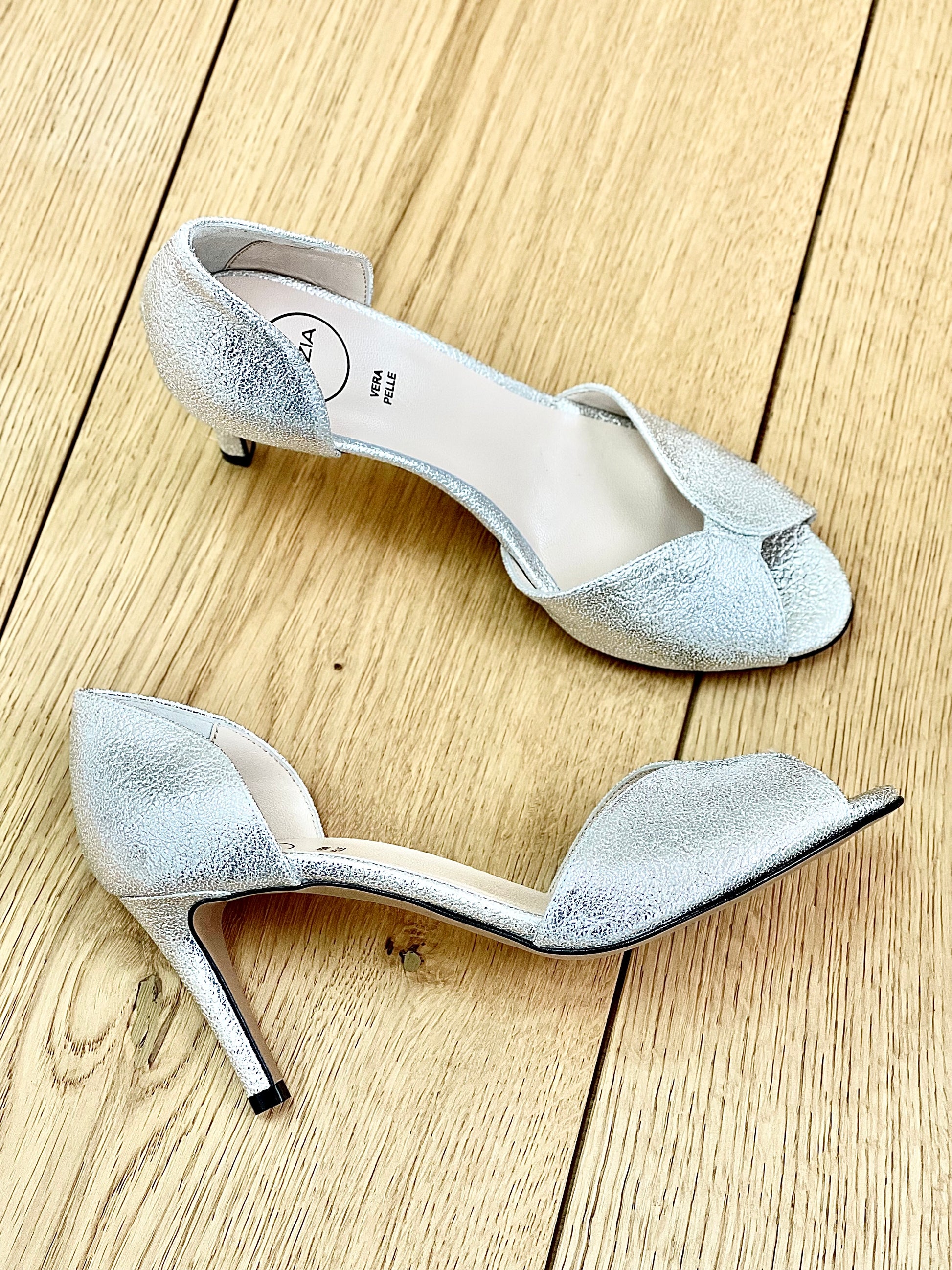 Escarpin à bout ouvert avec bout et talon laminés et talon fin de 8 cm.