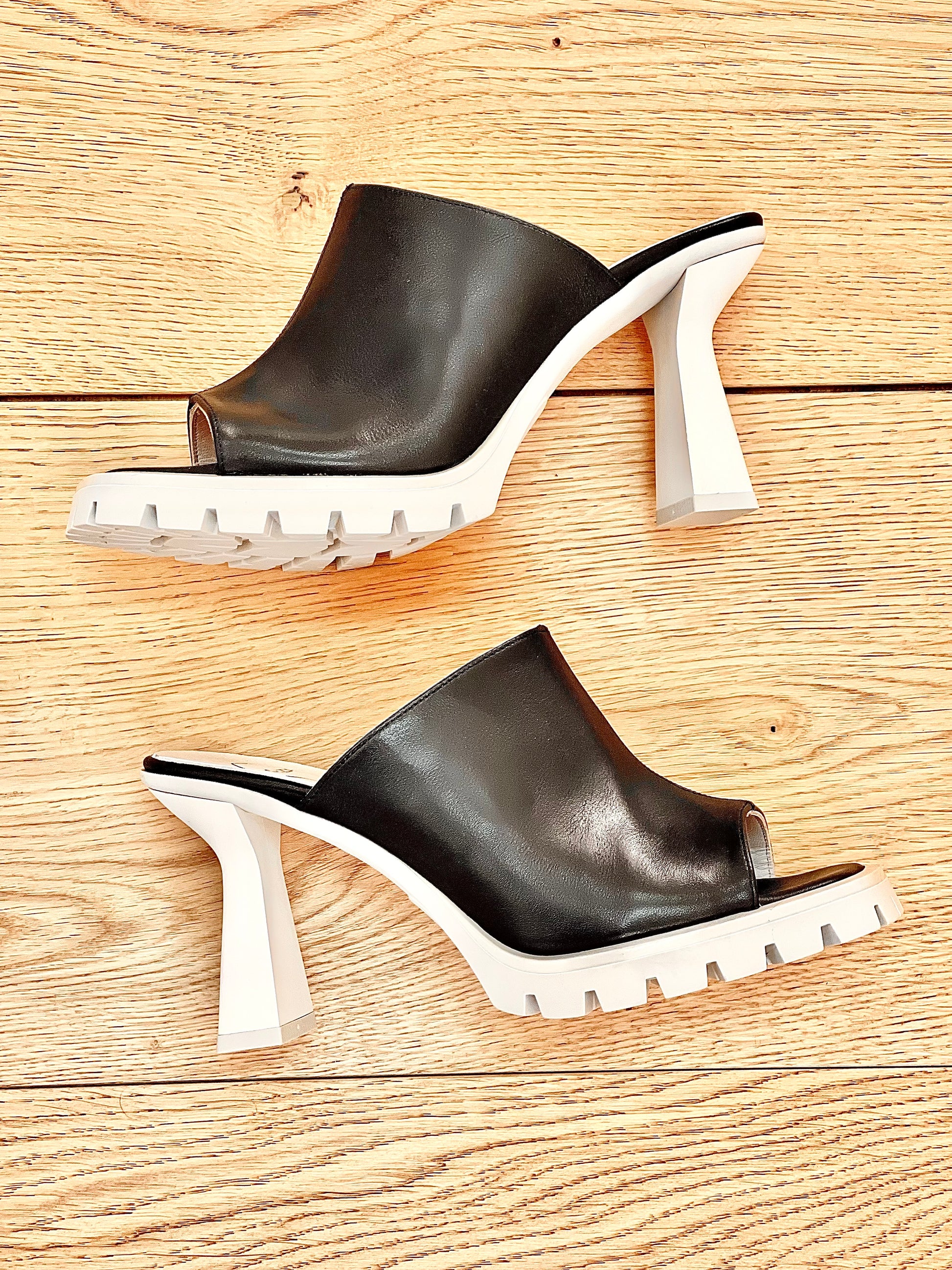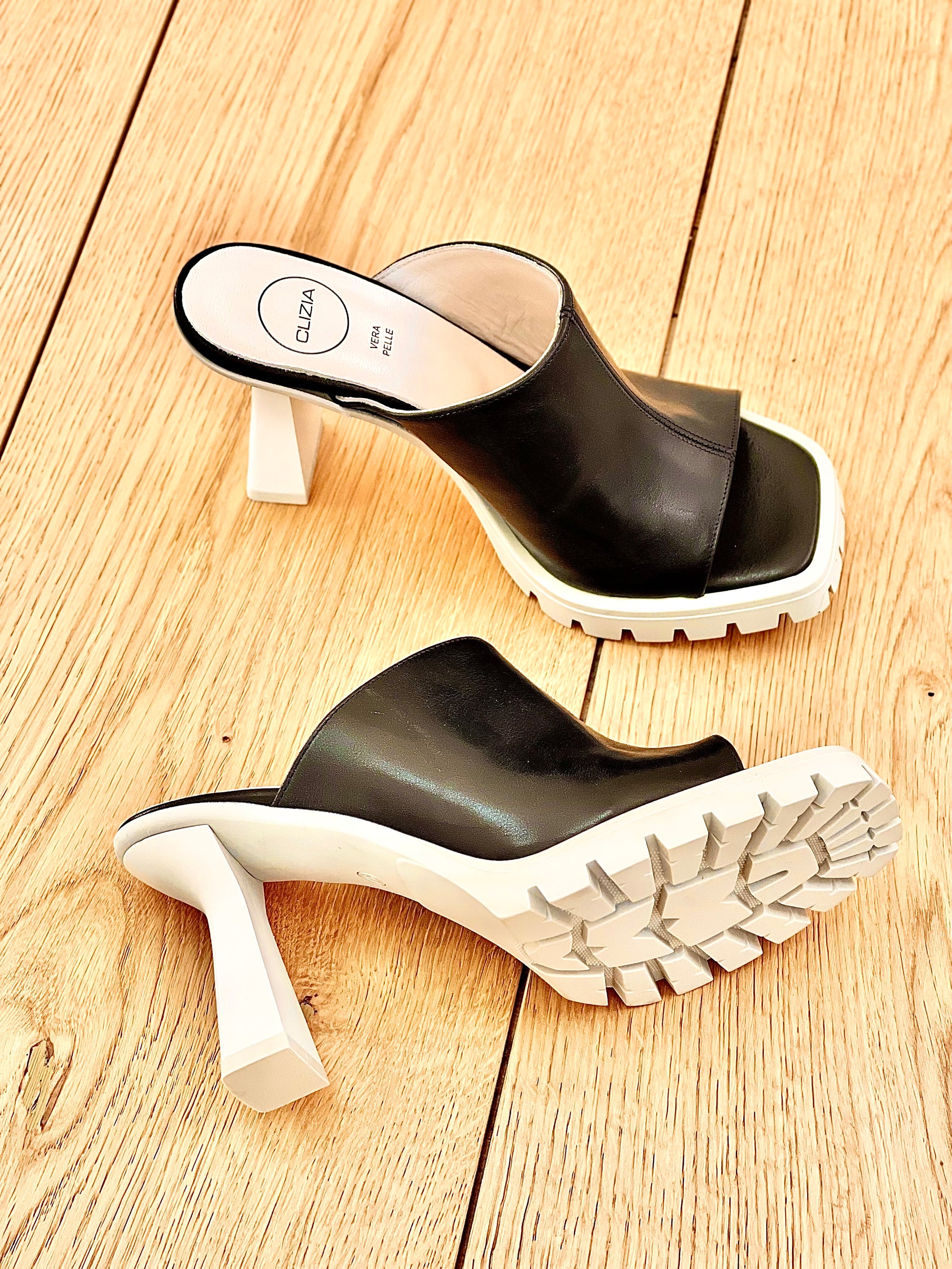 Sandales hautes avec sabots en cuir sur une plateforme avec une semelle intermédiaire en caoutchouc.