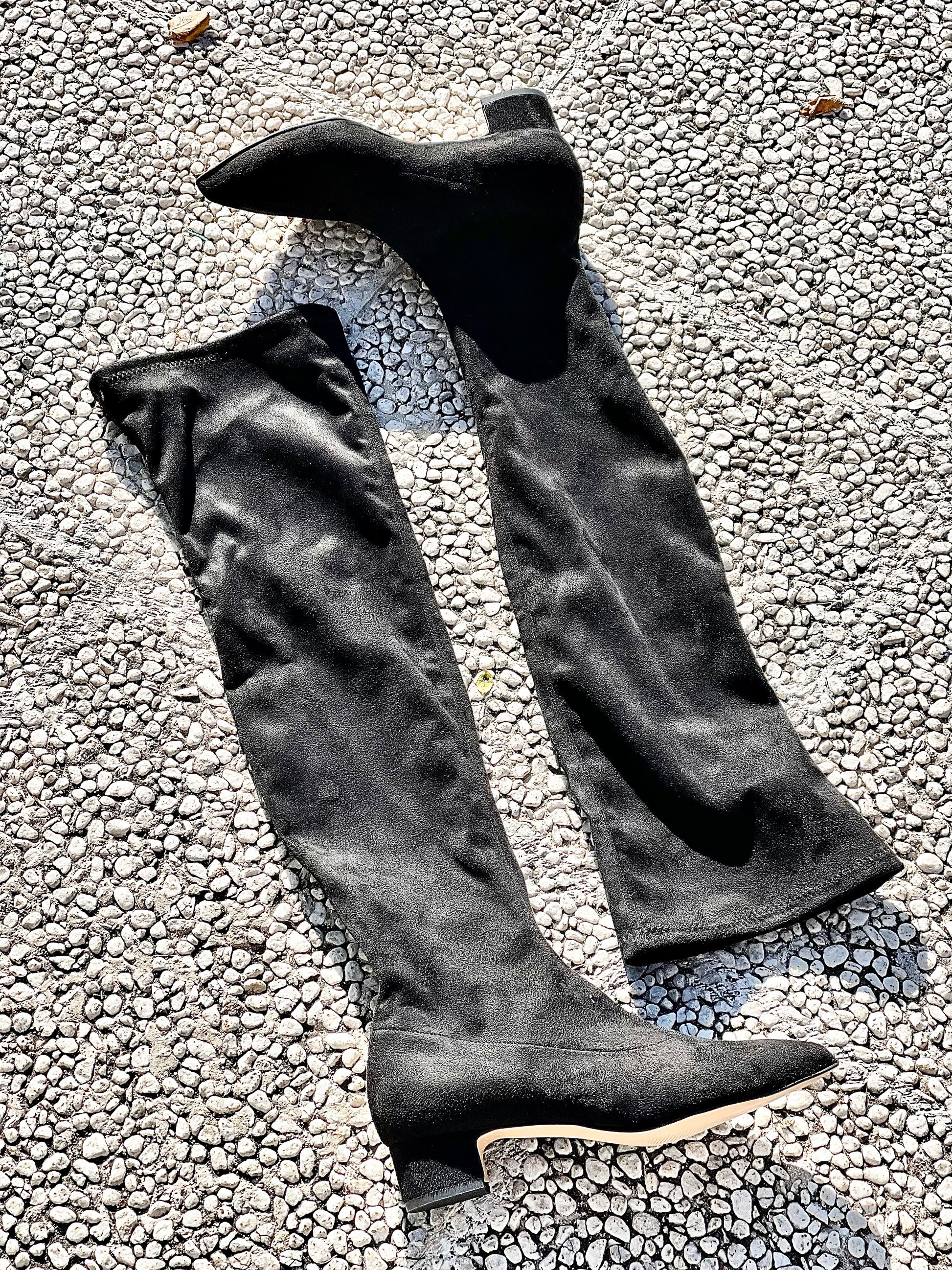 Bottes cuissardes élastiques à bout pointu avec un talon large de 3 cm.