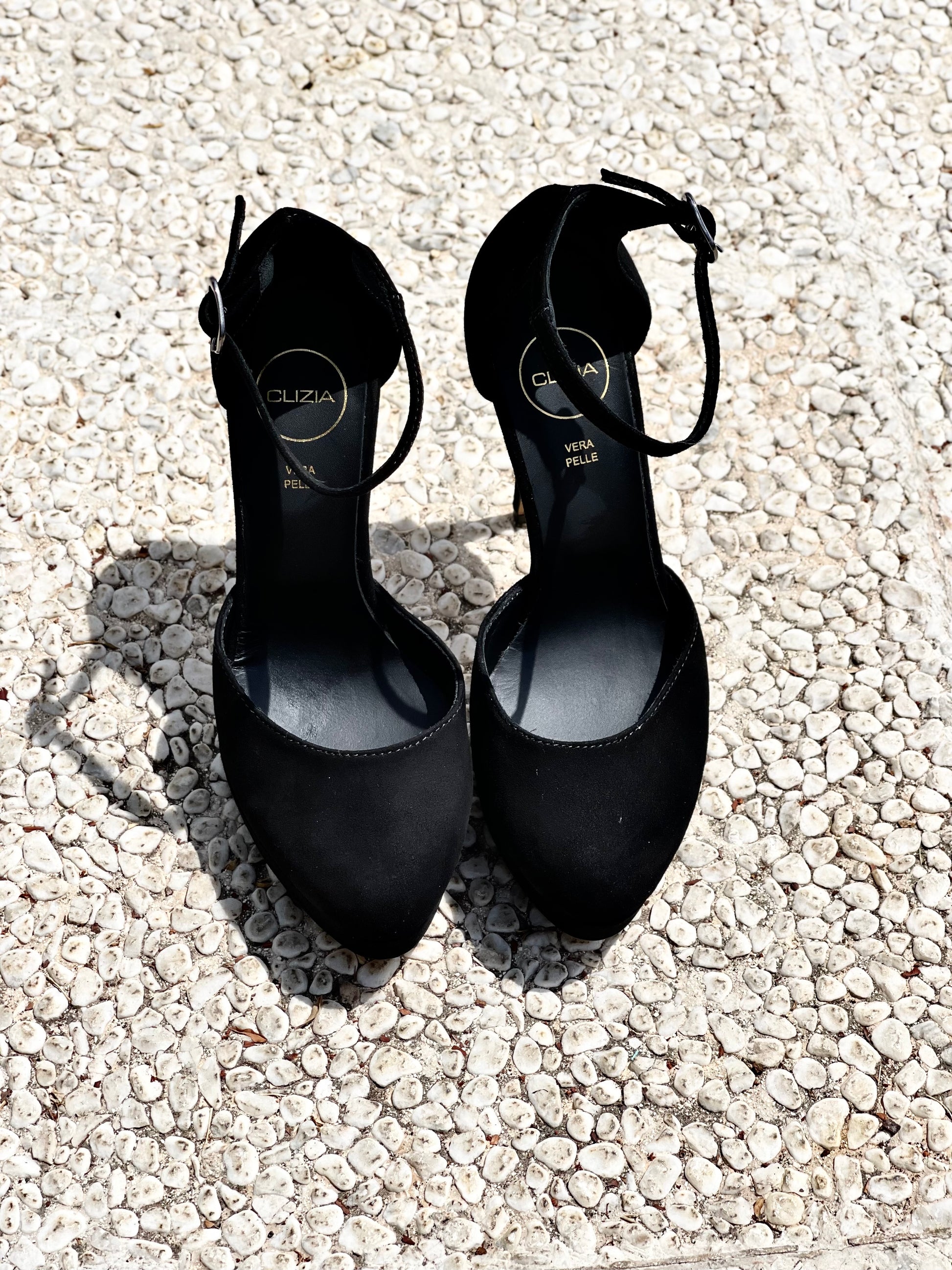 Escarpin en daim avec un talon de 12 cm et une plateforme de 2 cm.