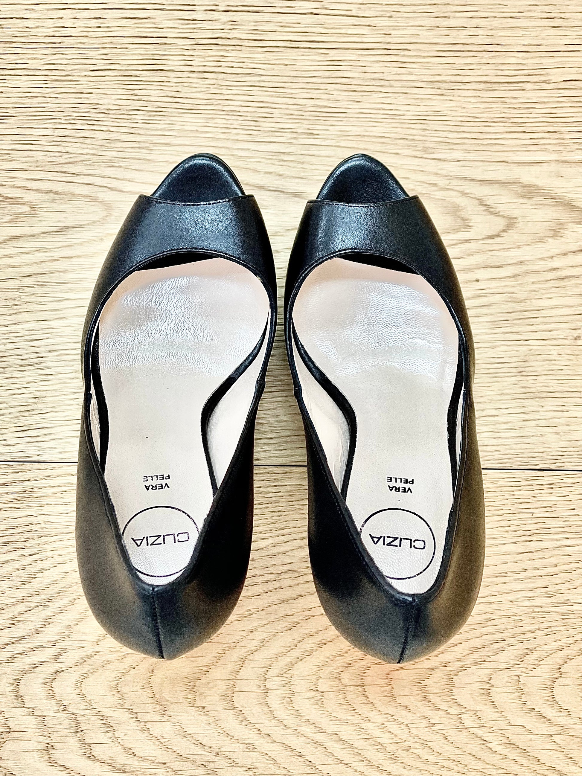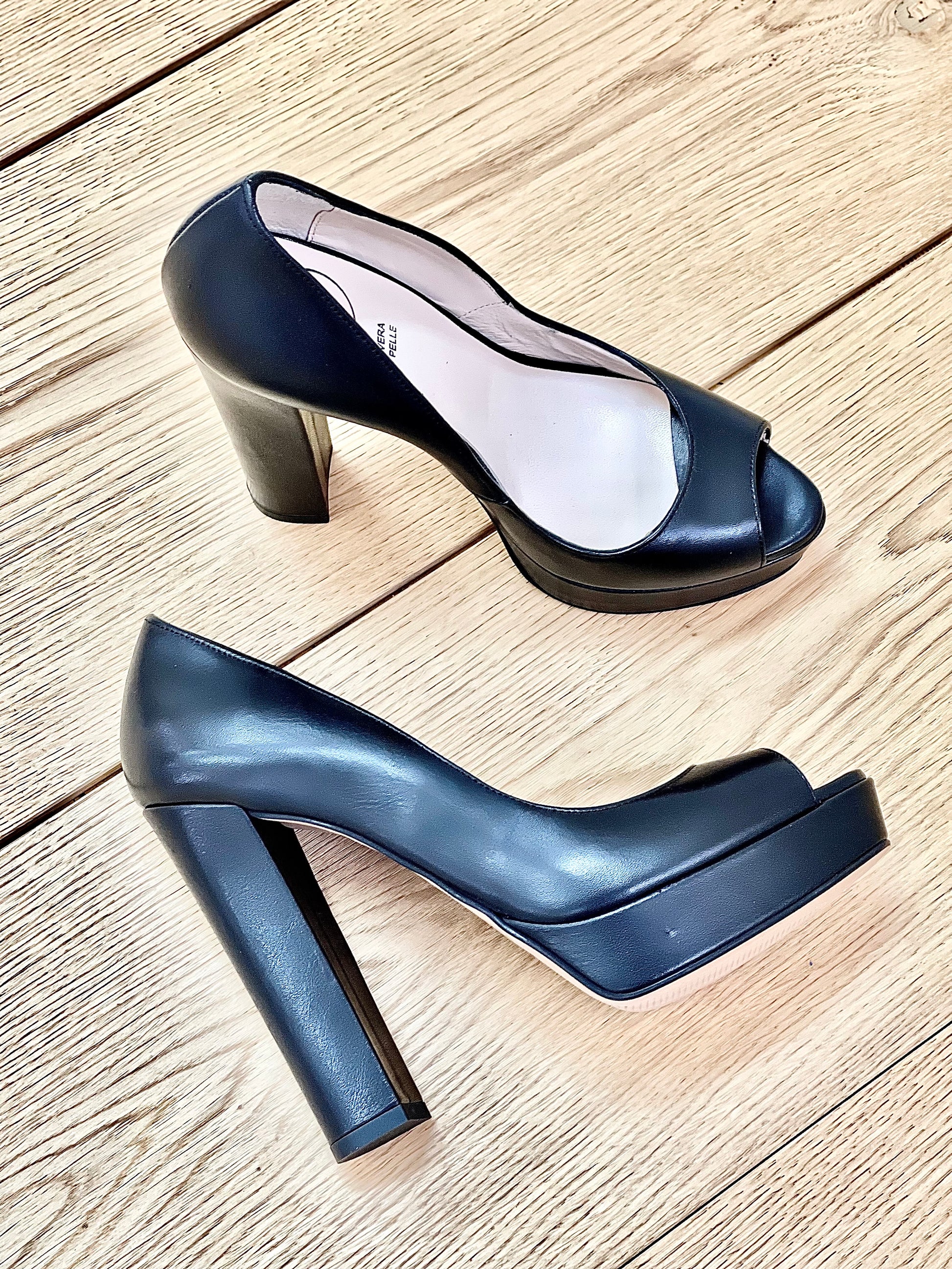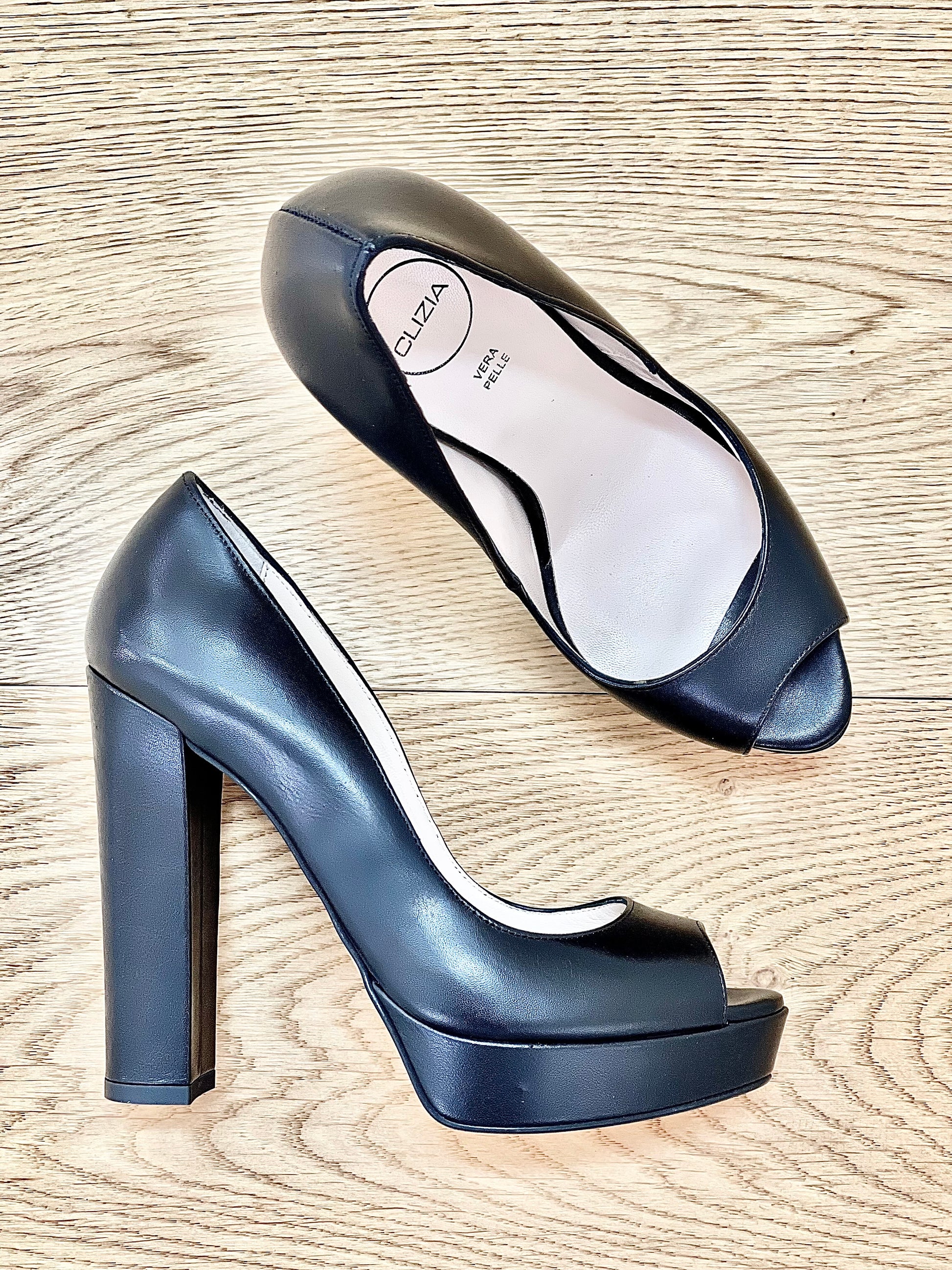 נעלי עור פתוחות, עקב גבוה 12 ס"מ ופלטפורמה 3 ס"מ.