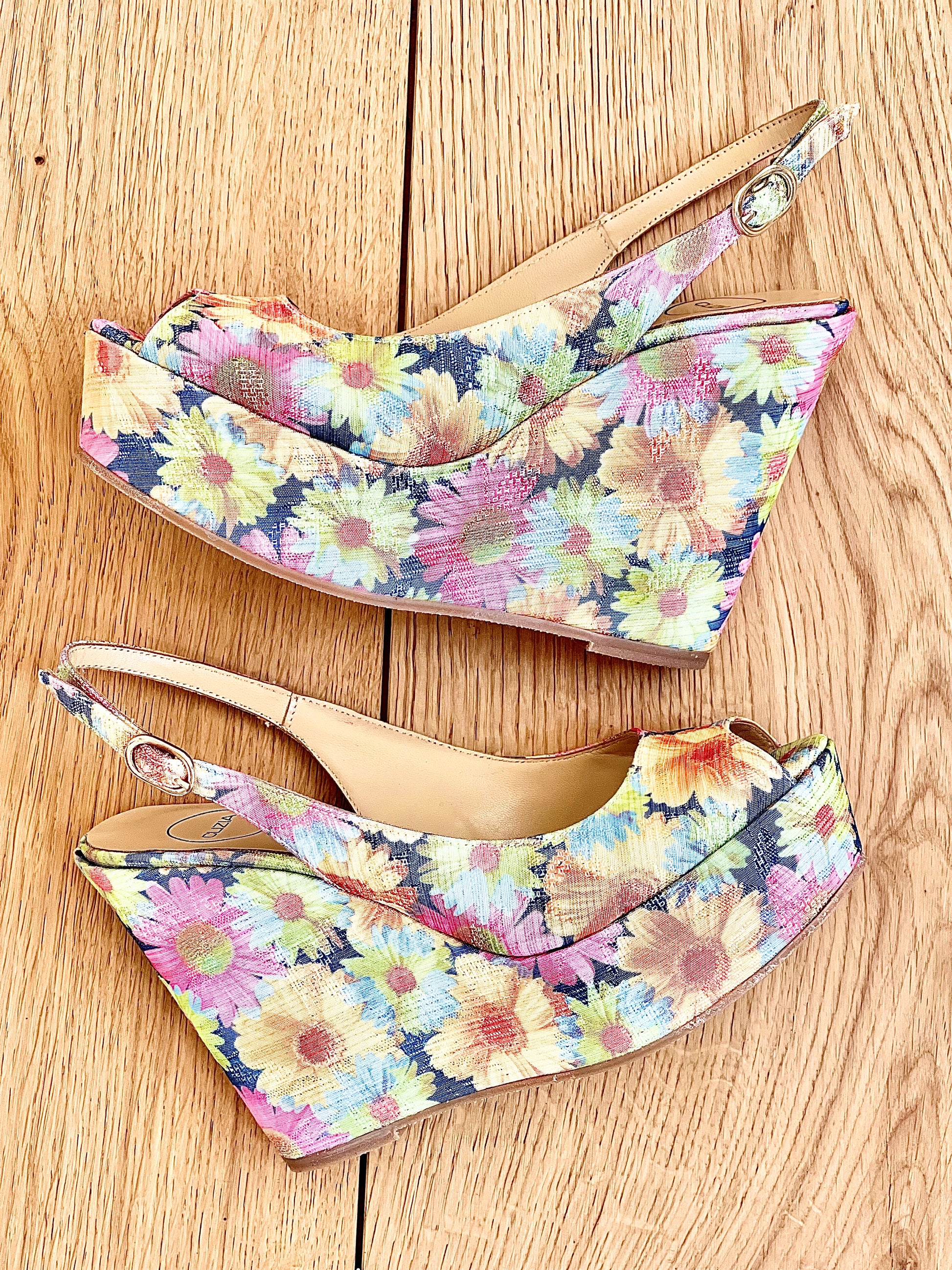 נעלי עקב עם קצה פתוח, הדפס פרחוני צבעוני על פלטפורמה גבוהה.