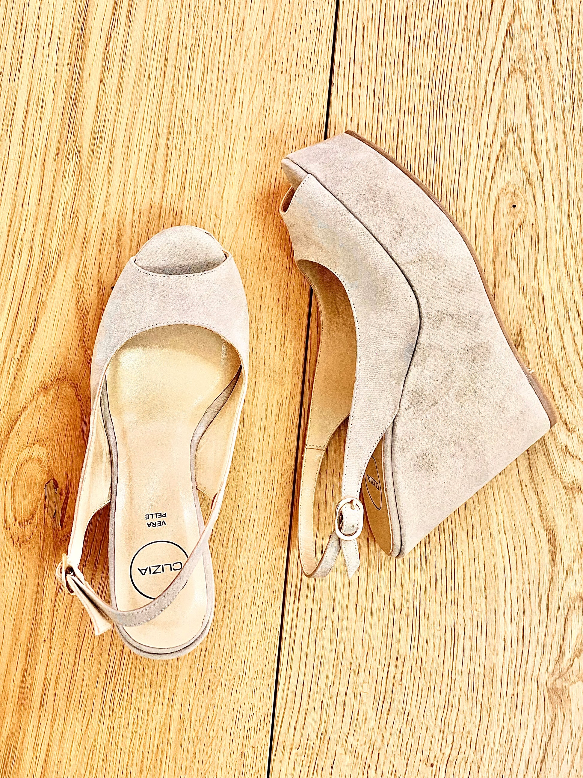 נעלי עקב זמש עם קצה פתוח ועקב פלטפורמה גבוה.