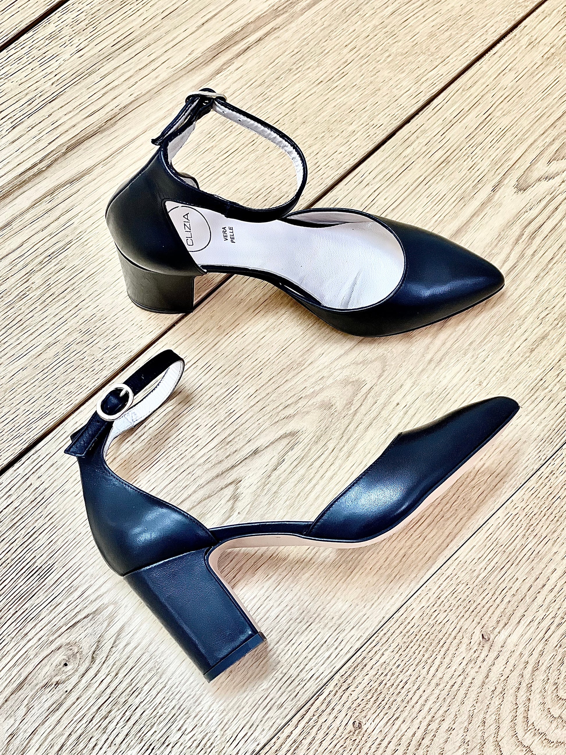 חרטום מחודד ומחשוף עקב מחודד עשויים עור, עקב ברוחב 75 מ"מ.