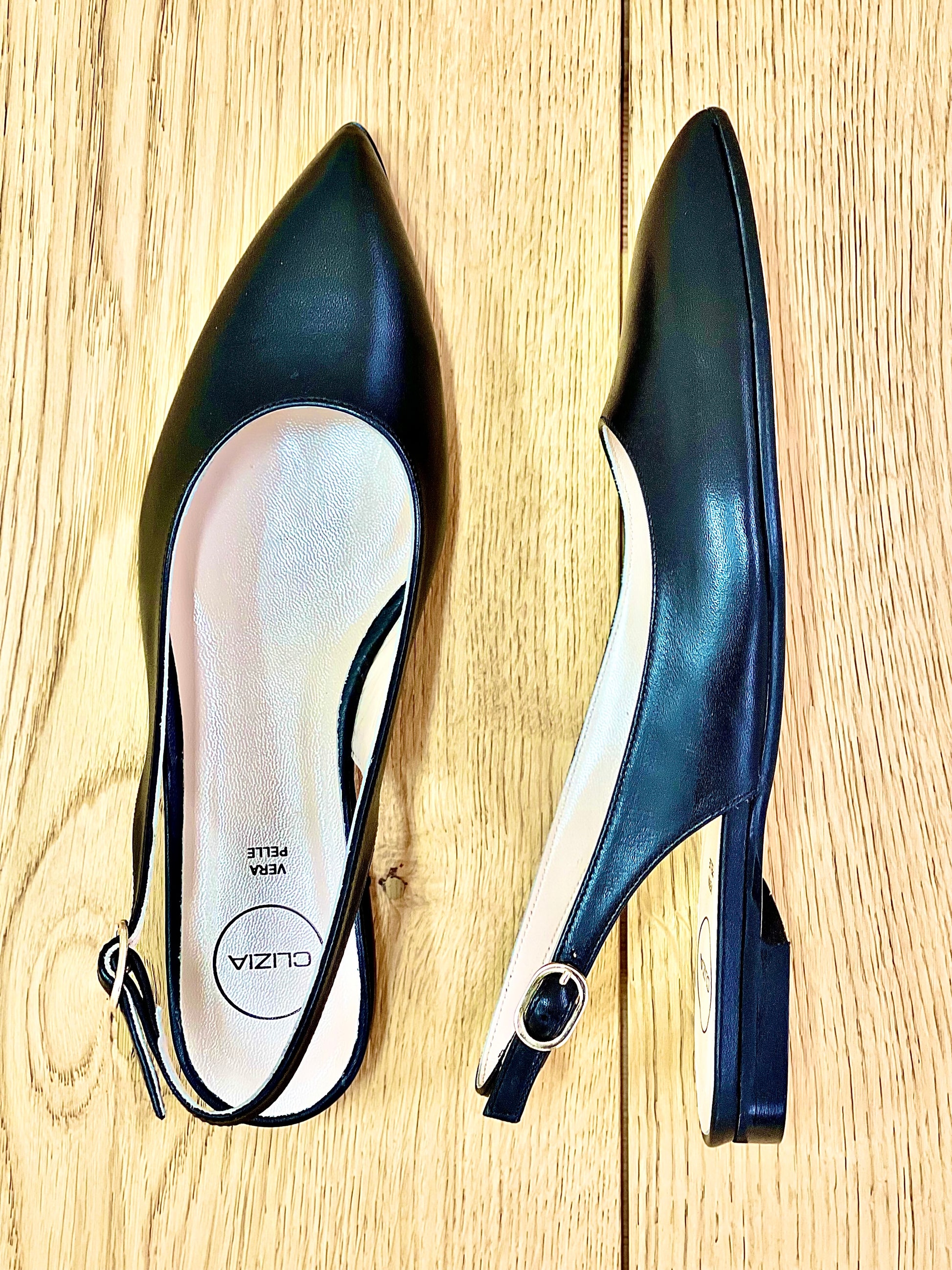 נעלי בלרינות עור עם חריצים מחודדים ועקב בגובה 1 ס"מ.