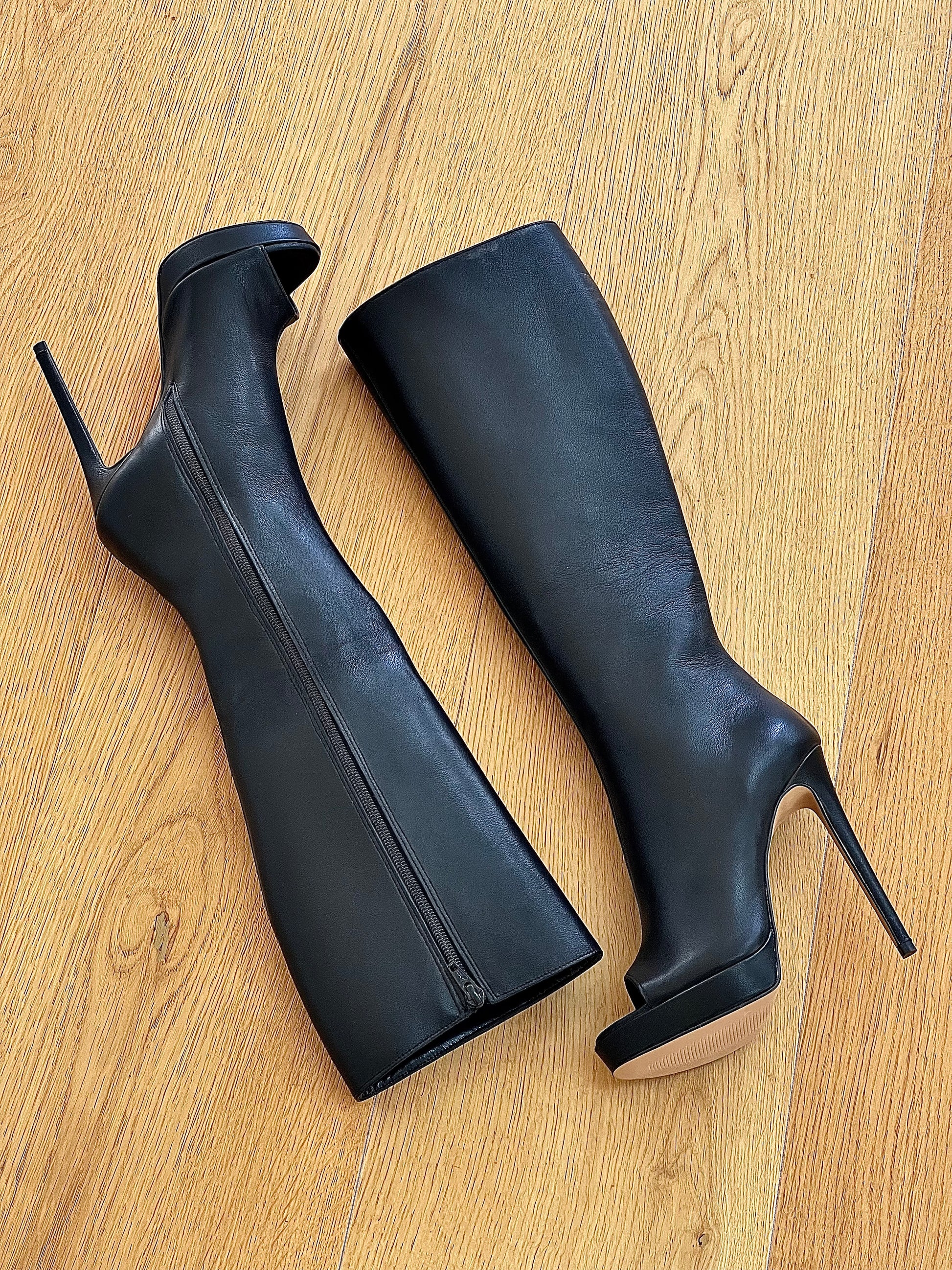 מגפי פלטפורמה גבוהים עם עקב סטילטו וטוהן פתוחה.