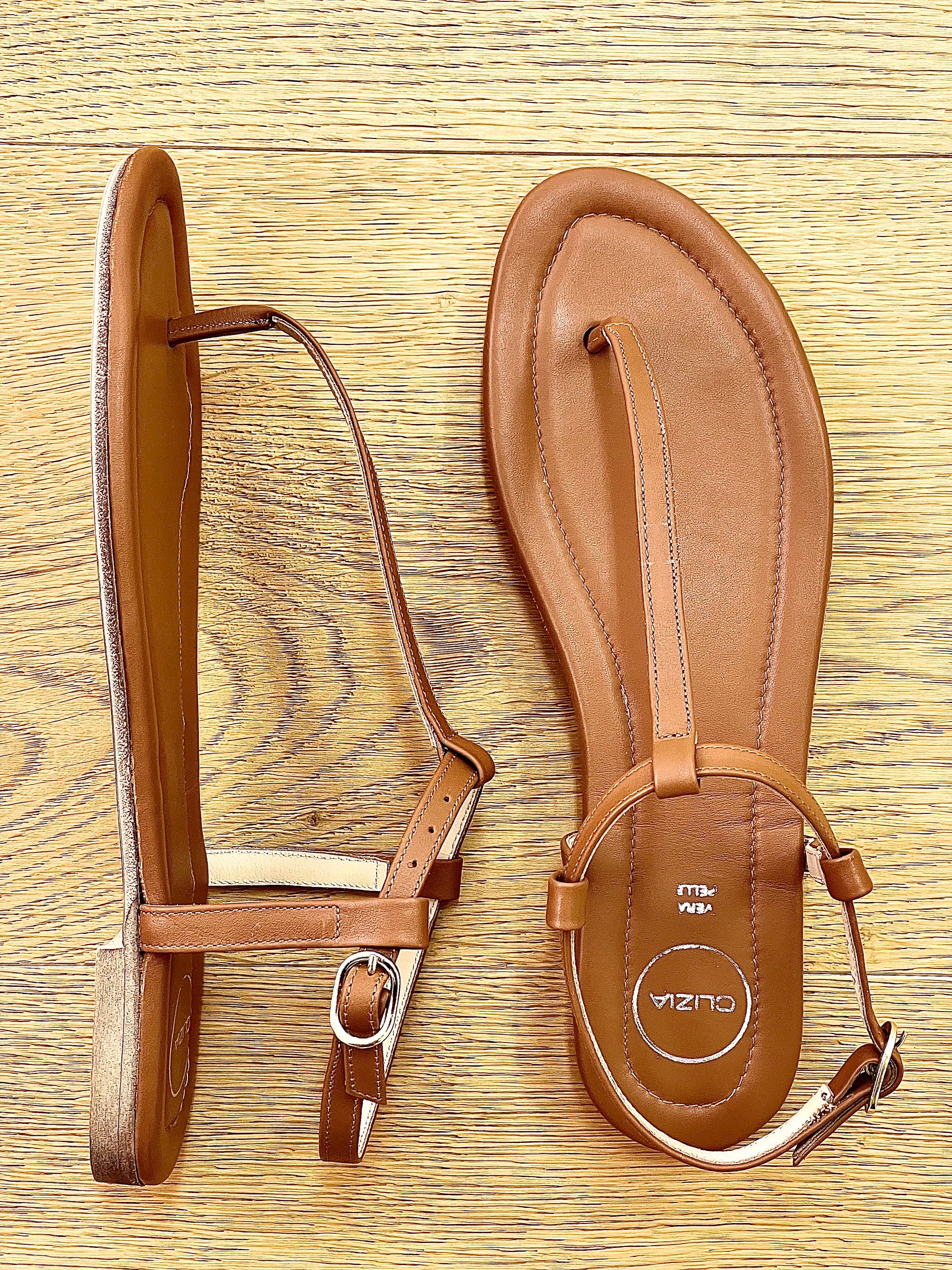 סנדלים שטוחים מעור עם כפכפים וקשירה לקרסול.