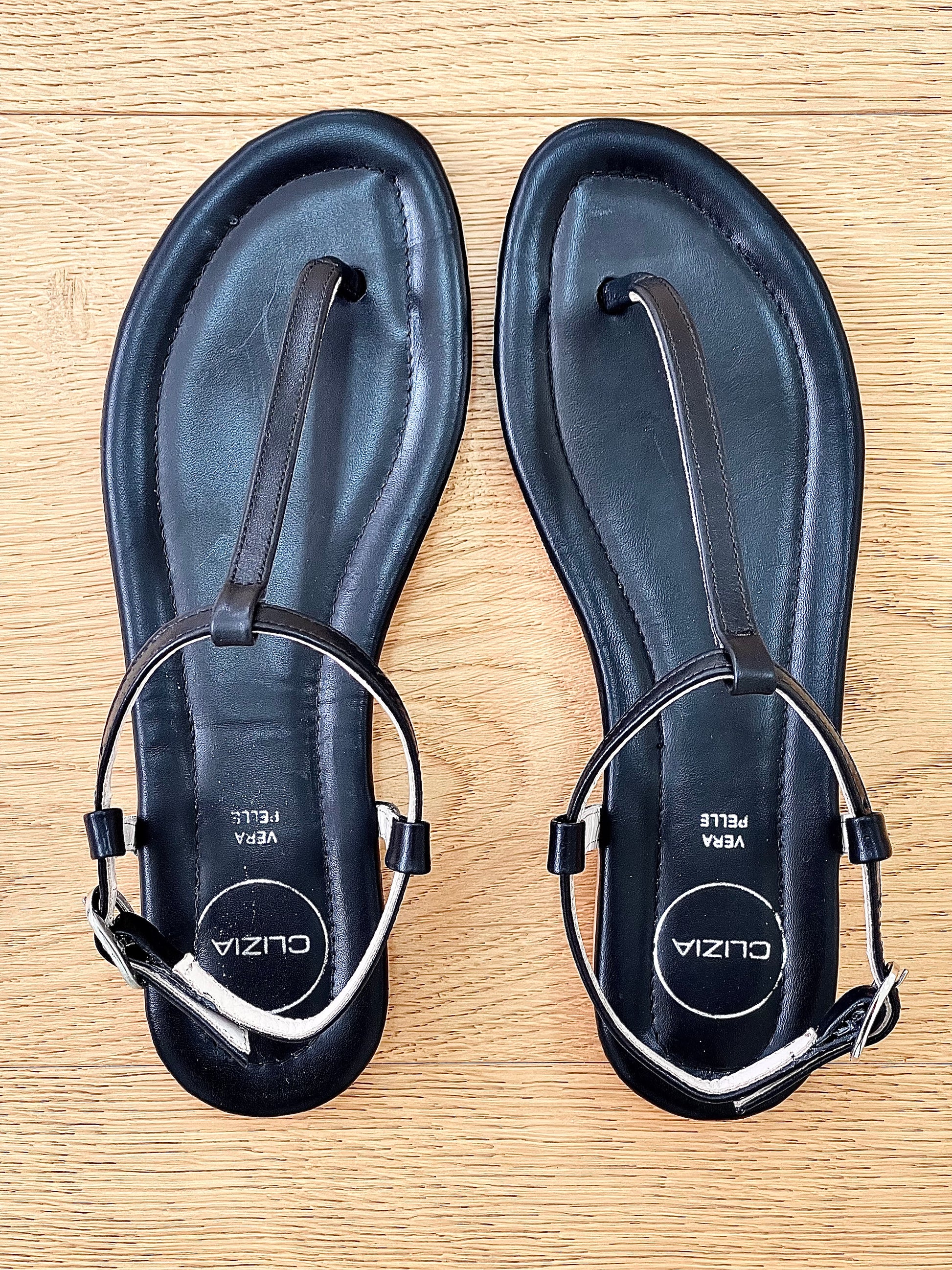 סנדלים שטוחים מעור עם כפכפים וקשירה לקרסול.