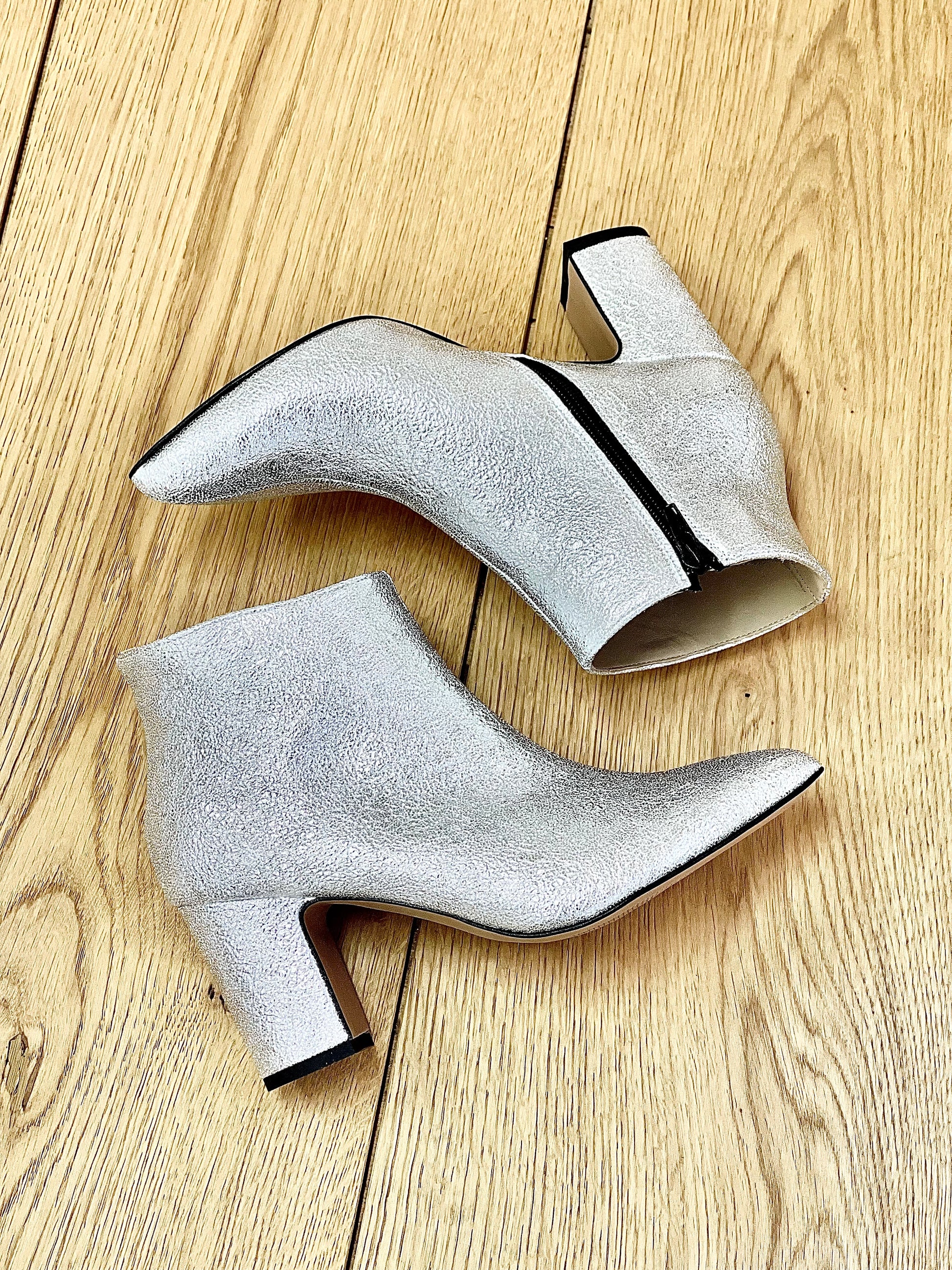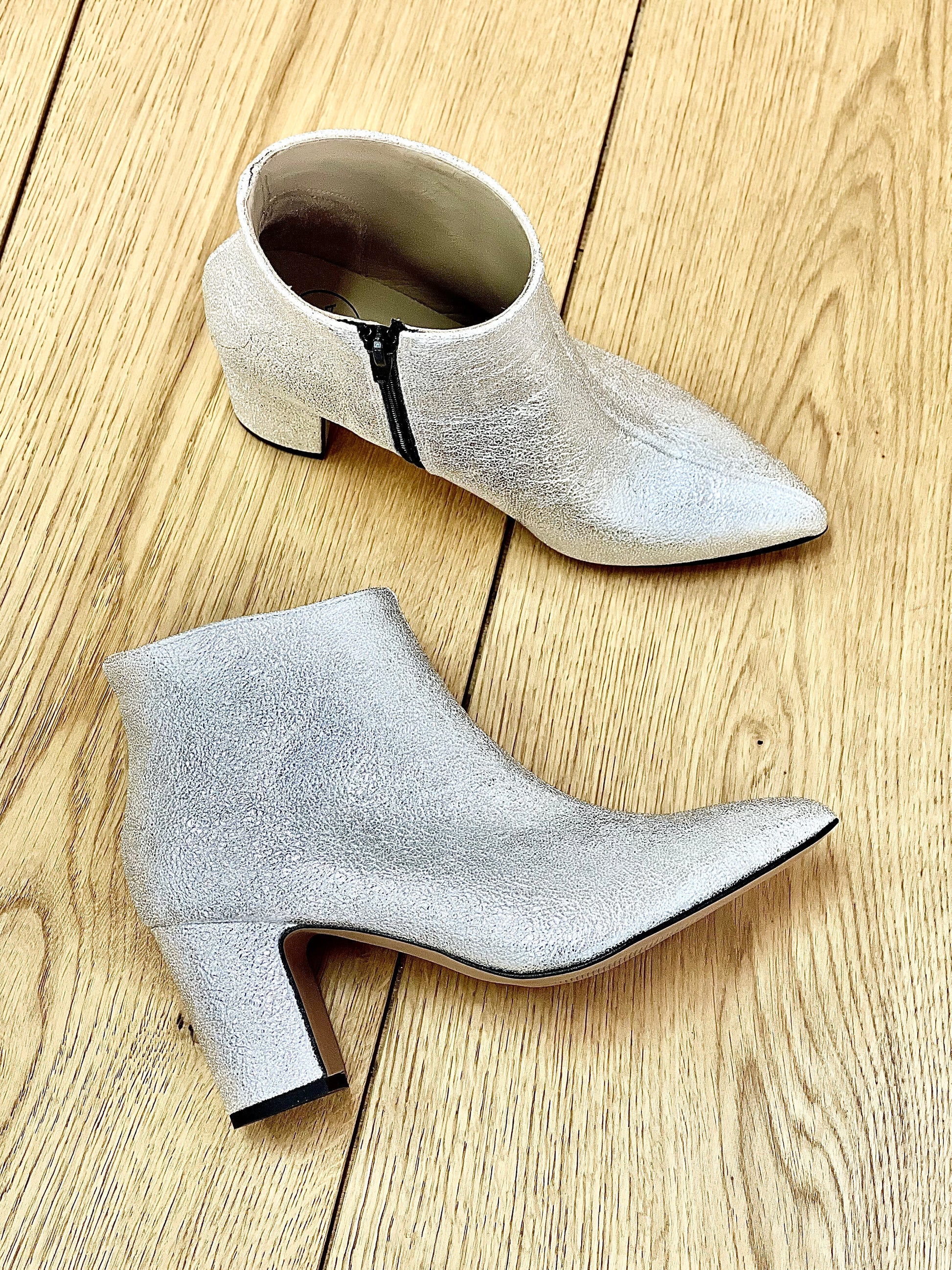 מגפוני קרסול עם חרטום מחודד מלמינציה ועקב רחב.