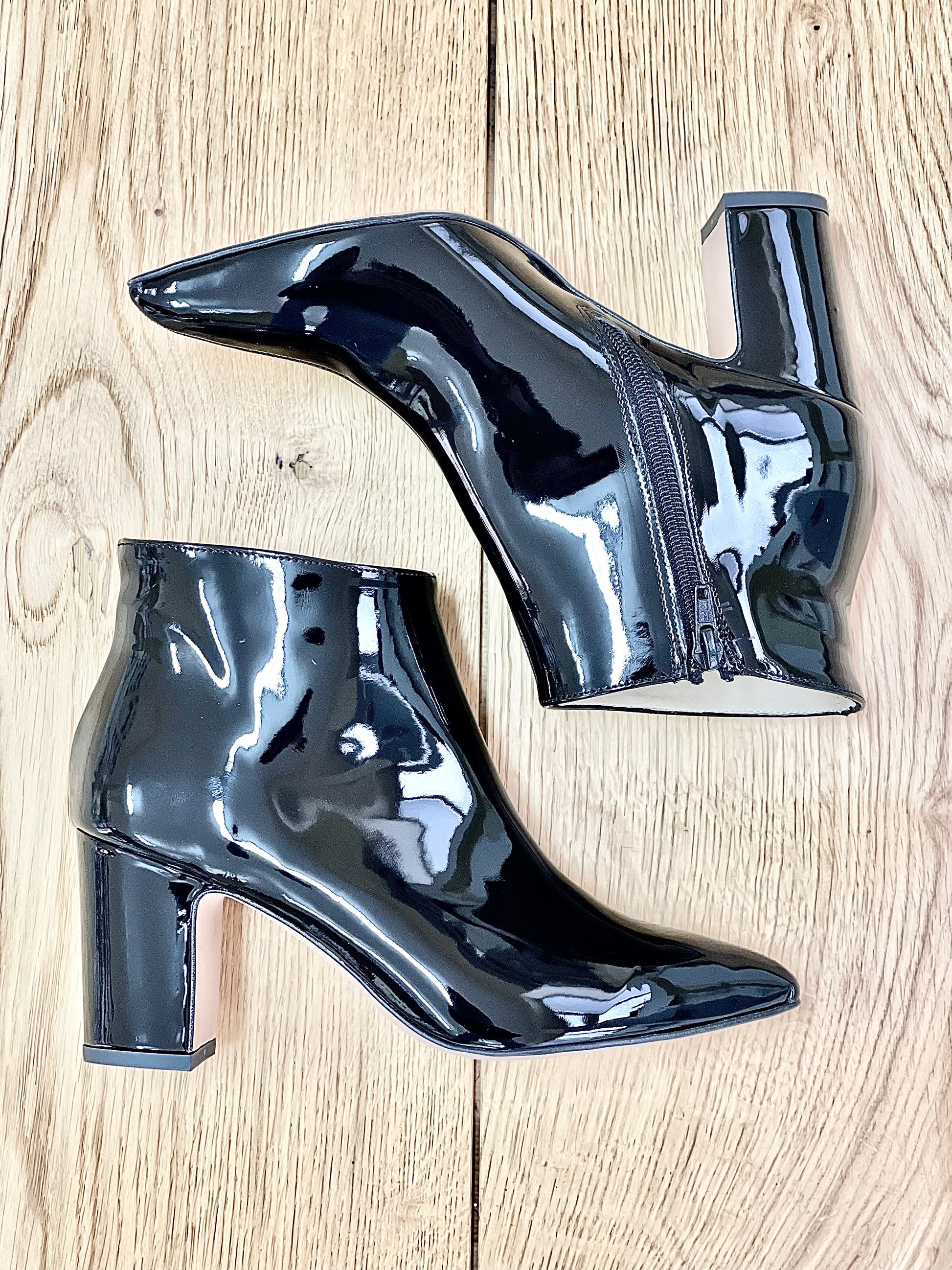 מגפוני קרסול עם חרטום מחודד מעור לכה ועקב רחב.