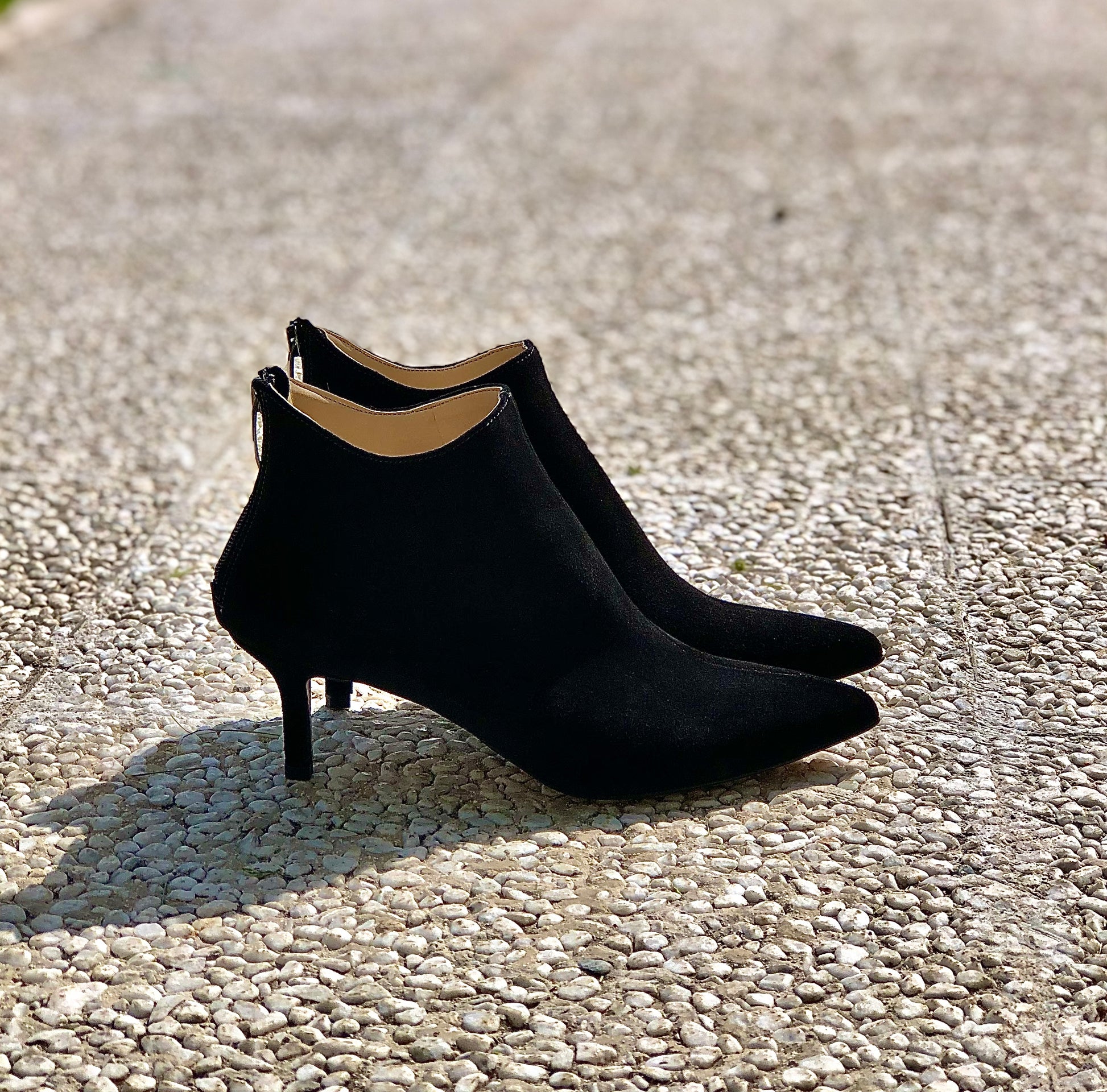 מגף קרסול מחודד מזמש, עקב 6 ס"מ. עם רוכסן מאחור.