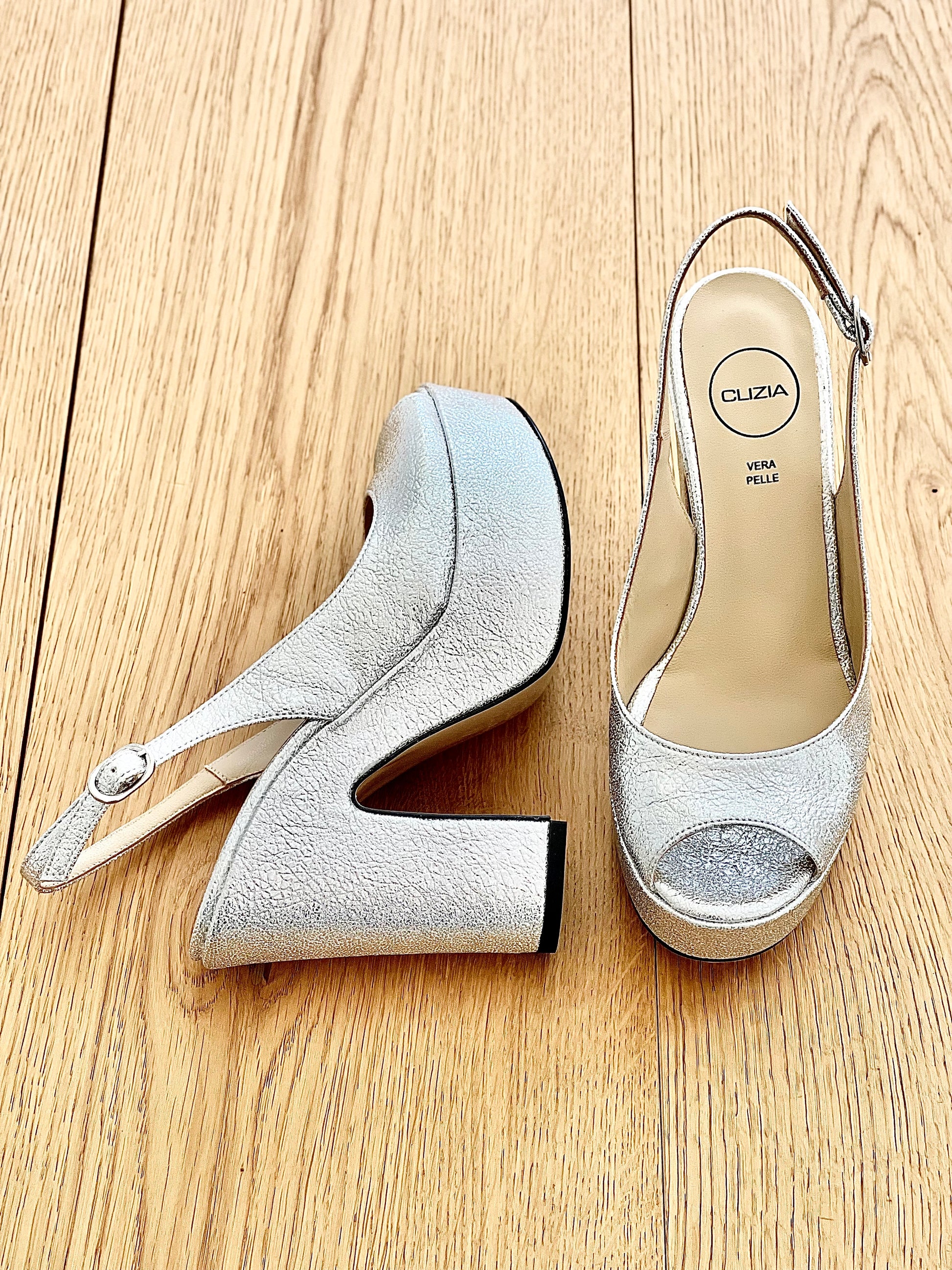 נעלי סלינגבק עם קצה פתוח, עקב פלטפורמה בגובה 11.5 ס"מ ופלטפורמה 4 ס"מ.